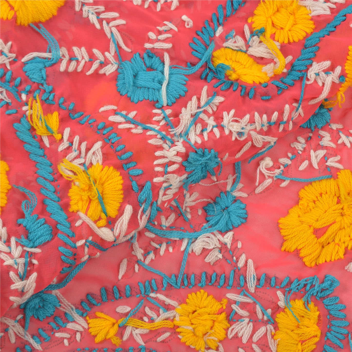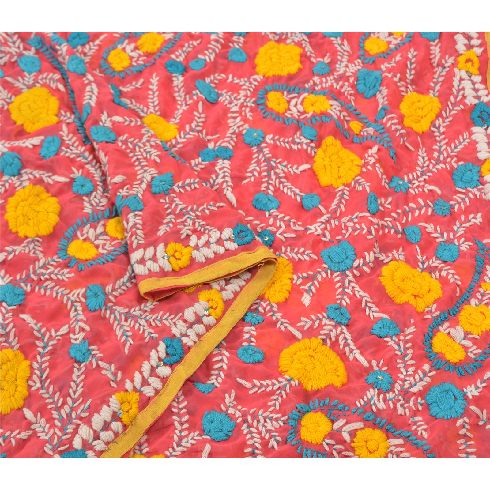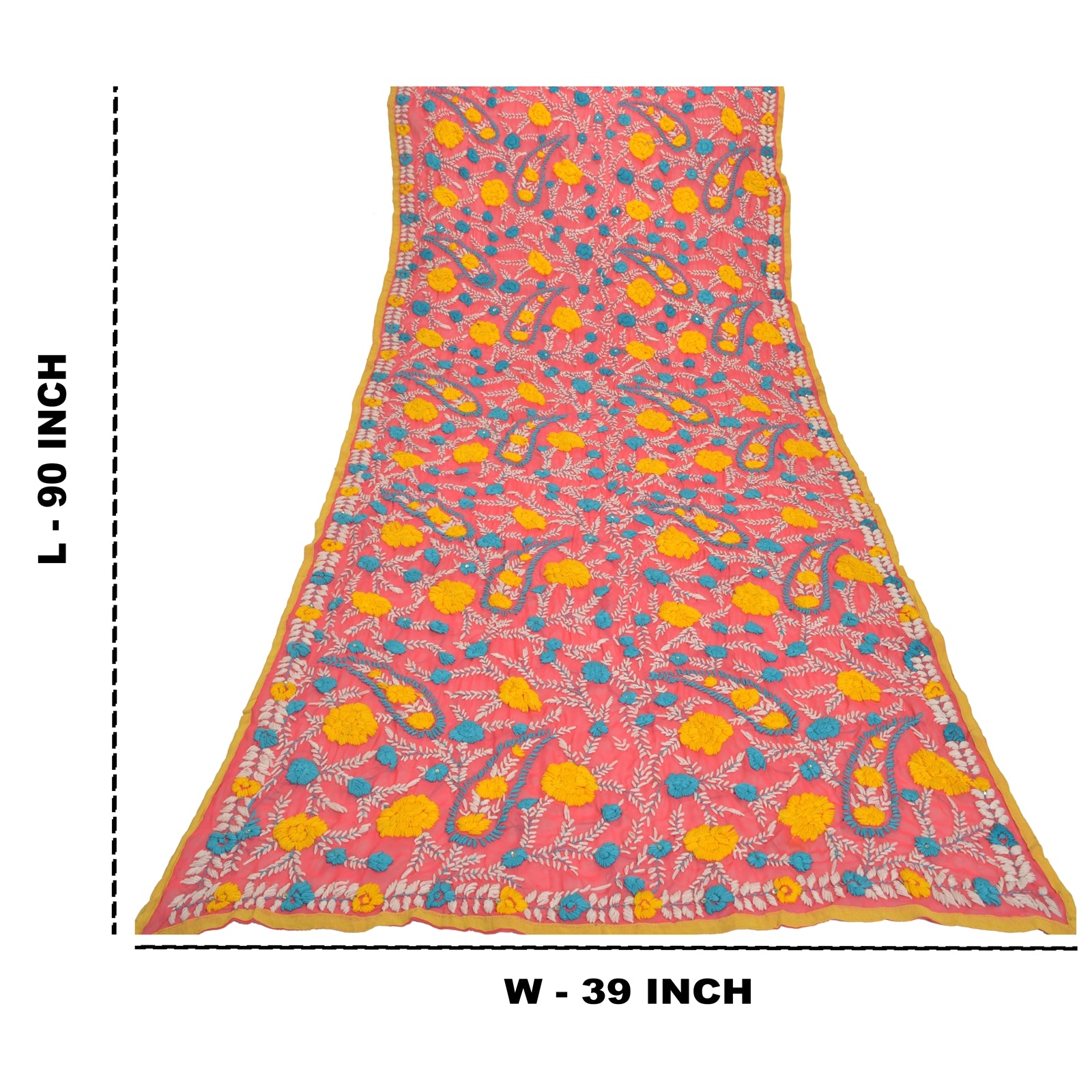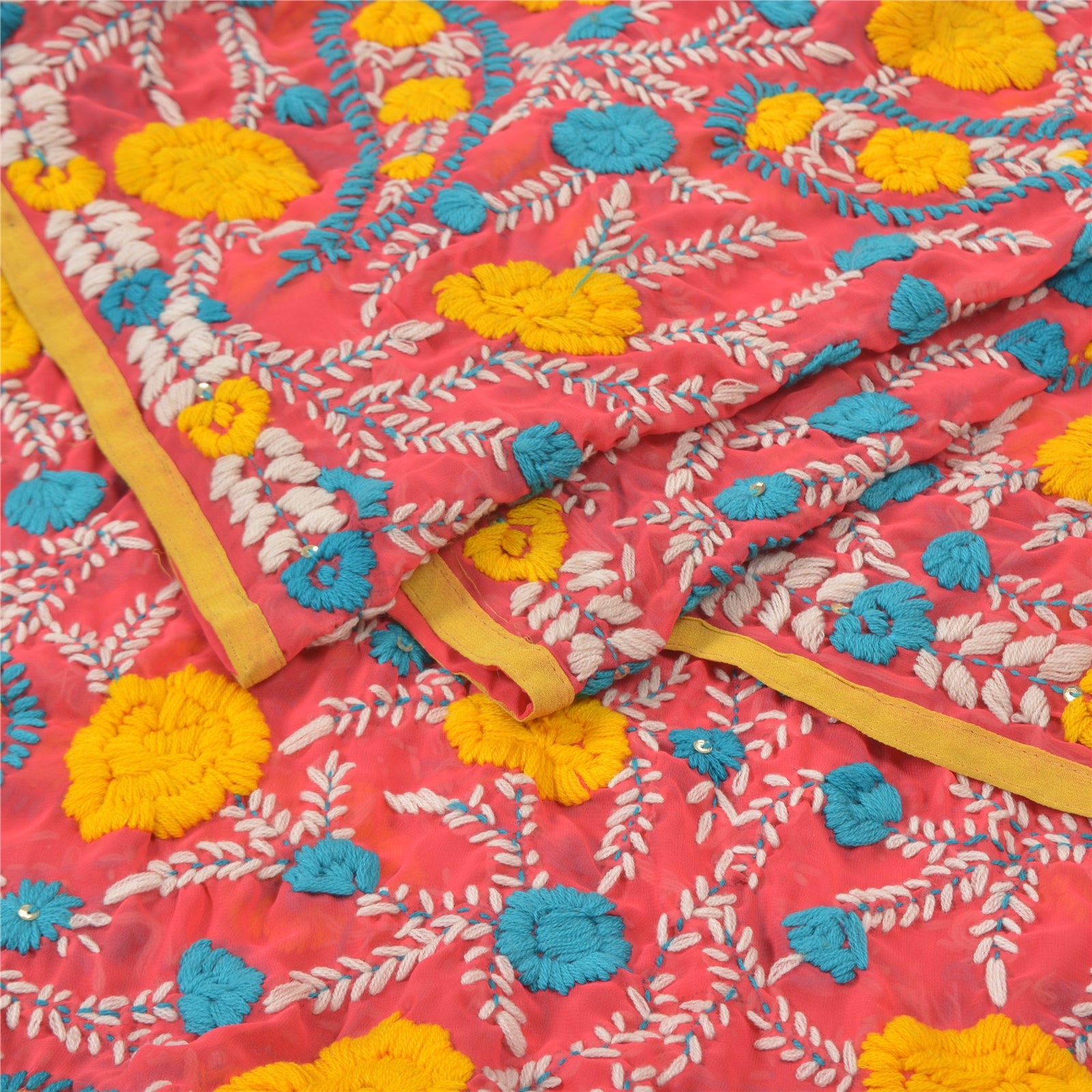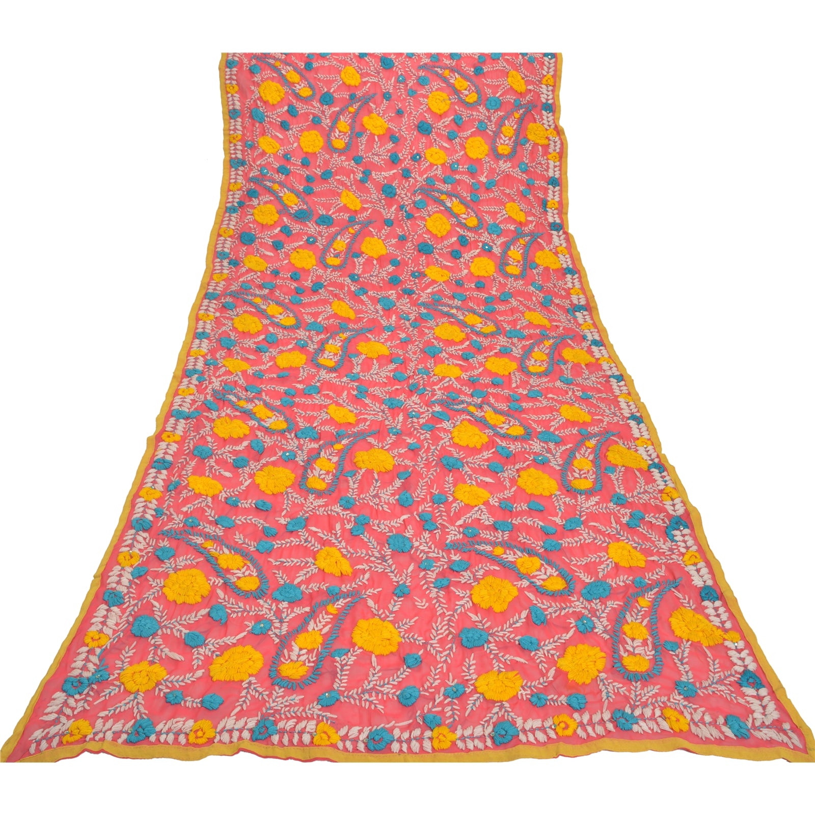 We Are Offering A Hand Embroidered Phulkari Work Georgette Sustainable Fabric Heavy Dupatta On Peach Base It Has Beautiful Floral & Paisley Designs With Multi Color Wool Thread Work And Golden Sequins Work Adding Lovely Effect. You Can See Yellow Sustainable Fabric Patch Work On Borders Is Further Enhancing The Beauty Of The Dupatta. You Can Pair This Heavy Dupatta With Any Kind Of Plain Dress To Glam Up The Beauty In You. Phulkari Is A Dreamweaver For Every Punjabi Girl. Phulkari Means �Flower Work�, It Has A History Etched In The Culture Of Punjab. The Main Characteristics Of This Embroidery Are The Use Of Darn Stitch On The Wrong Side Of Cloth With Colored Silken And Wool Thread.
