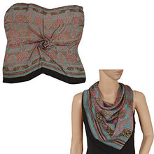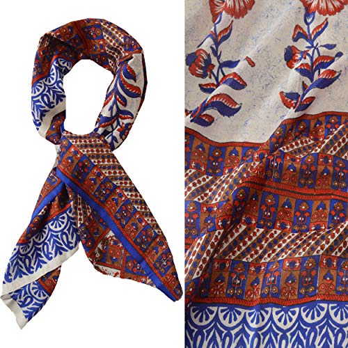 100% pure silk, soft, smooth and shiny. Beautiful print pattern in each and every scarf that you are going to love it. Dimension: 35" x 35", 90 x 90cm, can be worn around neck, head, waist, or hair as well as on a hat or handbag, etc.