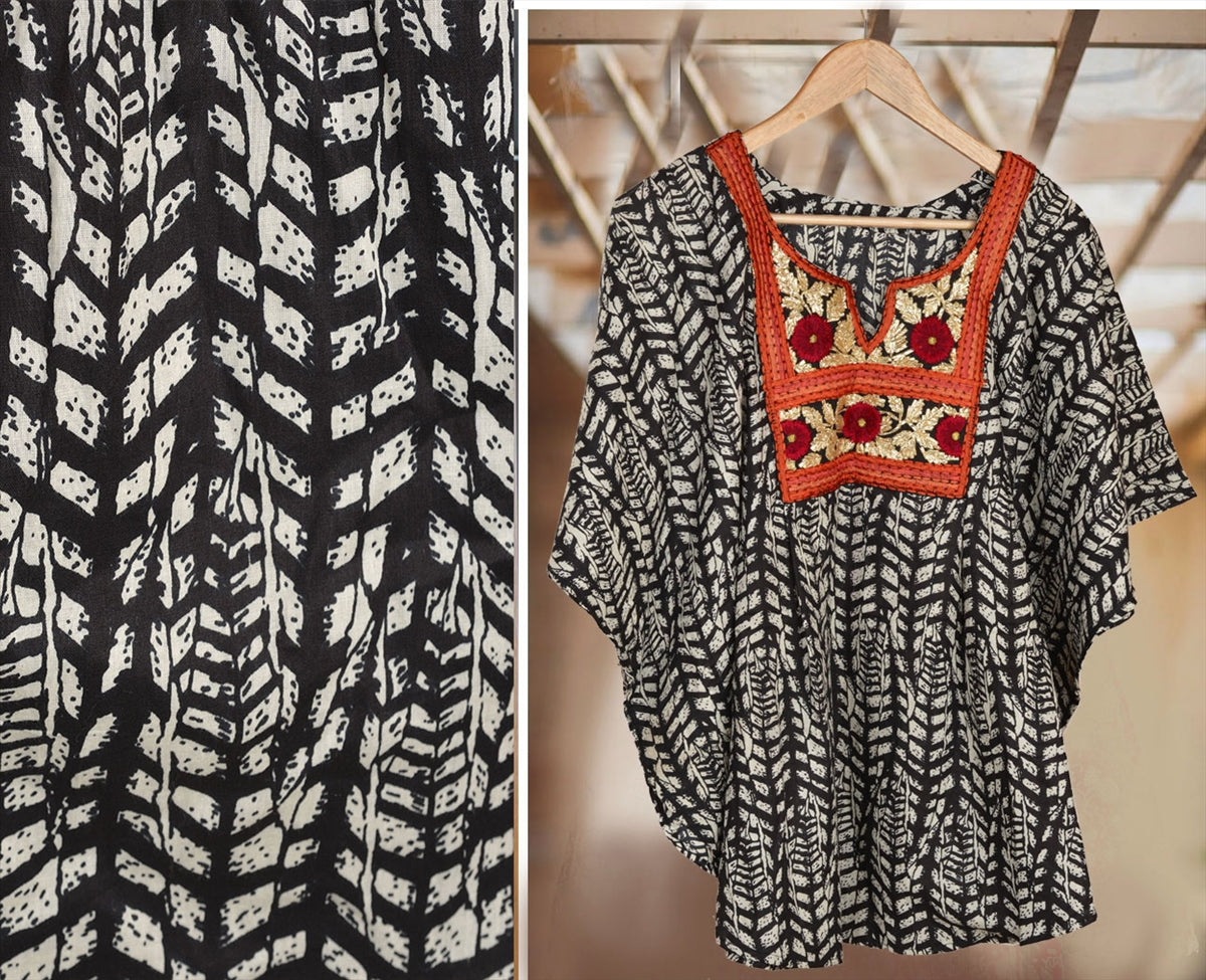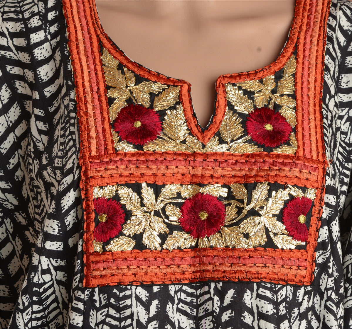 Comfortable black & white colored embroidered Kaftan top. Black patch work in front panel with orange/maroon thread work and golden gota patti work. which further enhances the beauty of the top. Top seamed at the side of the bodice. Match with leggings, jeans or shorts for comfort & style. Trendy and feminine, this kaftan top has an effortless style and is ideal for daily wear, casual wear, fairs, movies, lounging and much more.