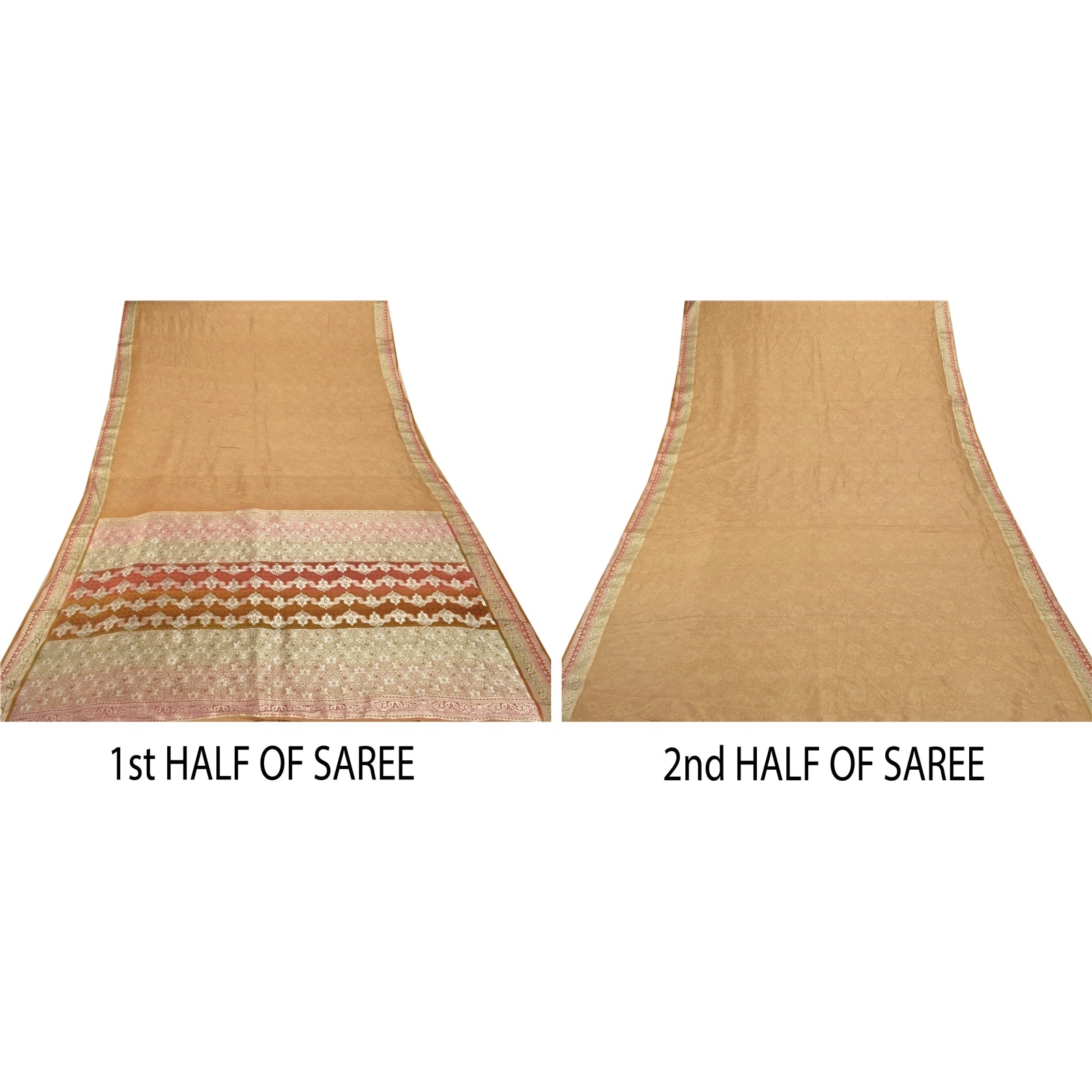 Sanskriti Vintage Beige Sarees 100% Pure Silk Woven Craft 5 Yard Sustainable Fabric Sari
