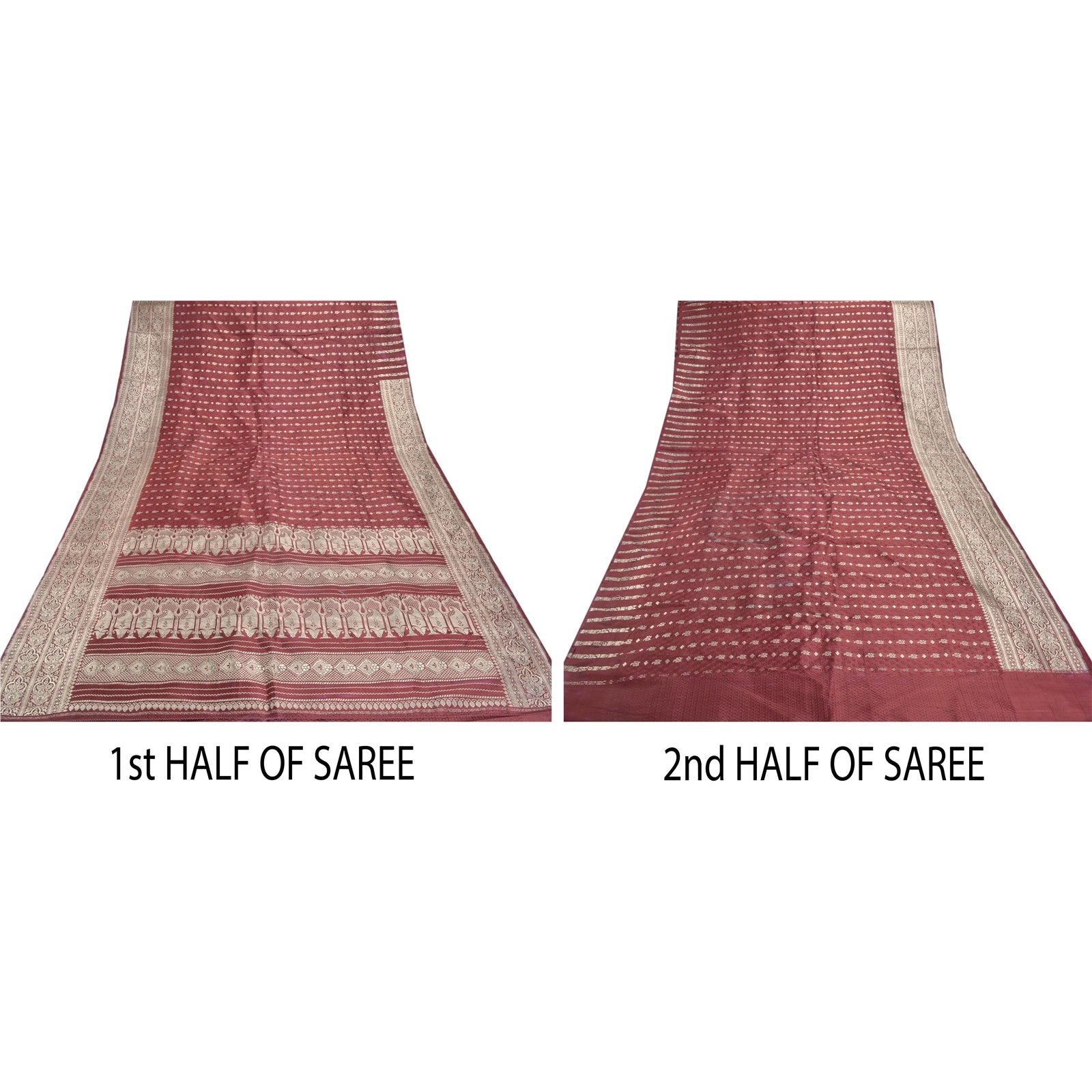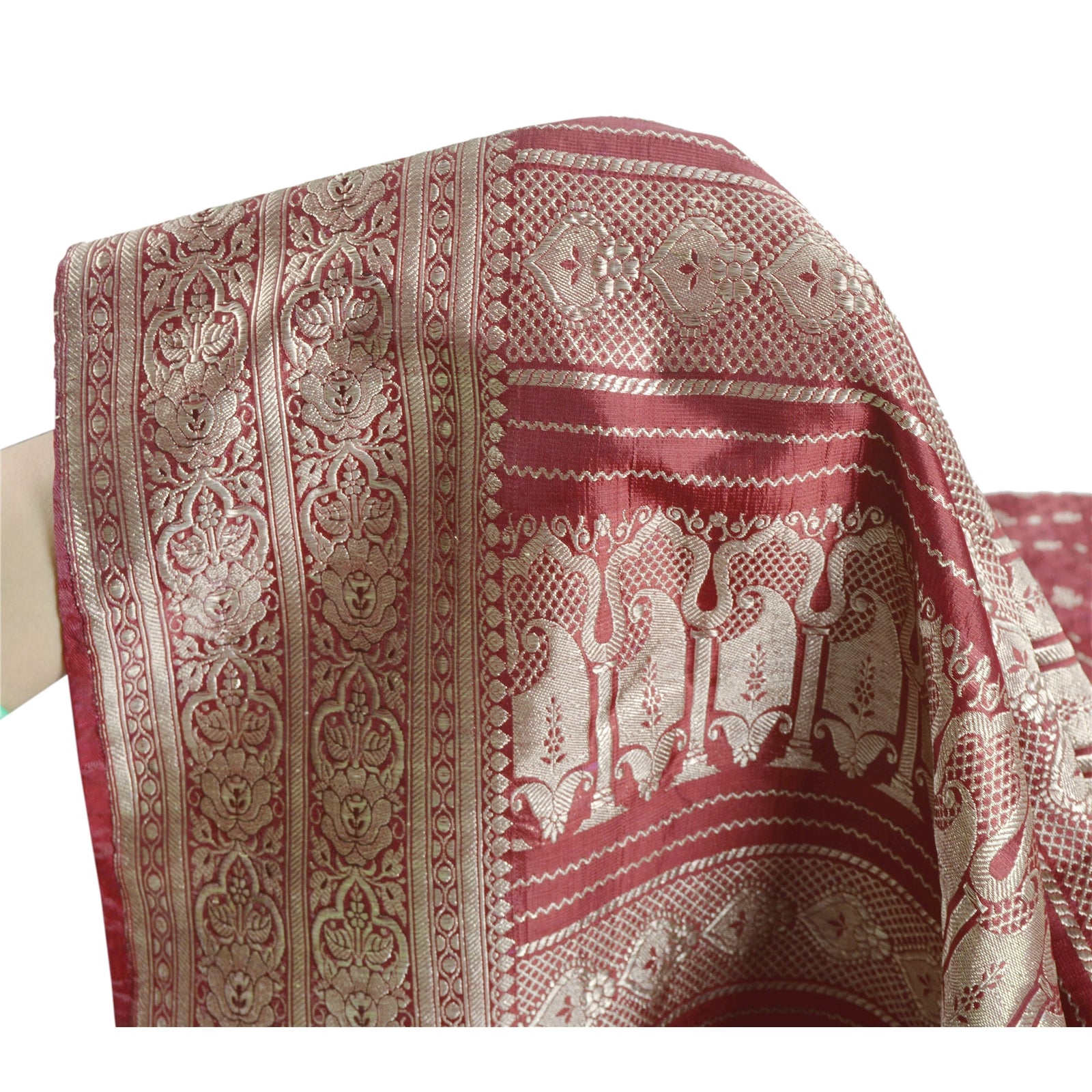 Sanskriti Offers This Vintage Dark Red Color Woven Brocade/Banarasi Heavy Saree Which Is Crafted With Satin Base Sustainable Fabric The pallu & border sari features floral & paisley design embellished with pure metallic golden zari work. The center part of sari boasts similar woven work. This heavy saree can be used for various crafting ideas too. Use it for dress designing, as a throw, as window dressing, upholstery, table linen and much more. Let your creative juices flow! The quality of zari work is amazing, its a pure metallic zari. Some zari work gives a antique look.