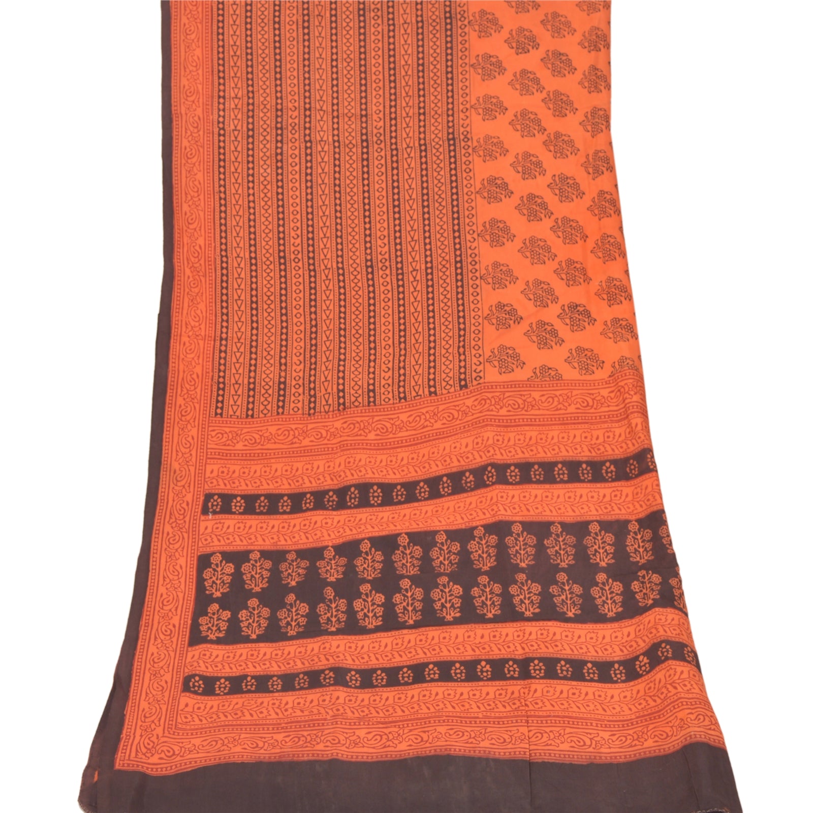 Excellent peach colored pure silk block printed long scarf/dupatta. The center portion has block printed floral design . Border of the dupatta has block printed floral design . This item's Beauty Factor Unique block print with floral design on pure silk base Sustainable Fabric is really enhancing the beauty of the dupatta. As the dupatta is vintage some mild stains are visible.
