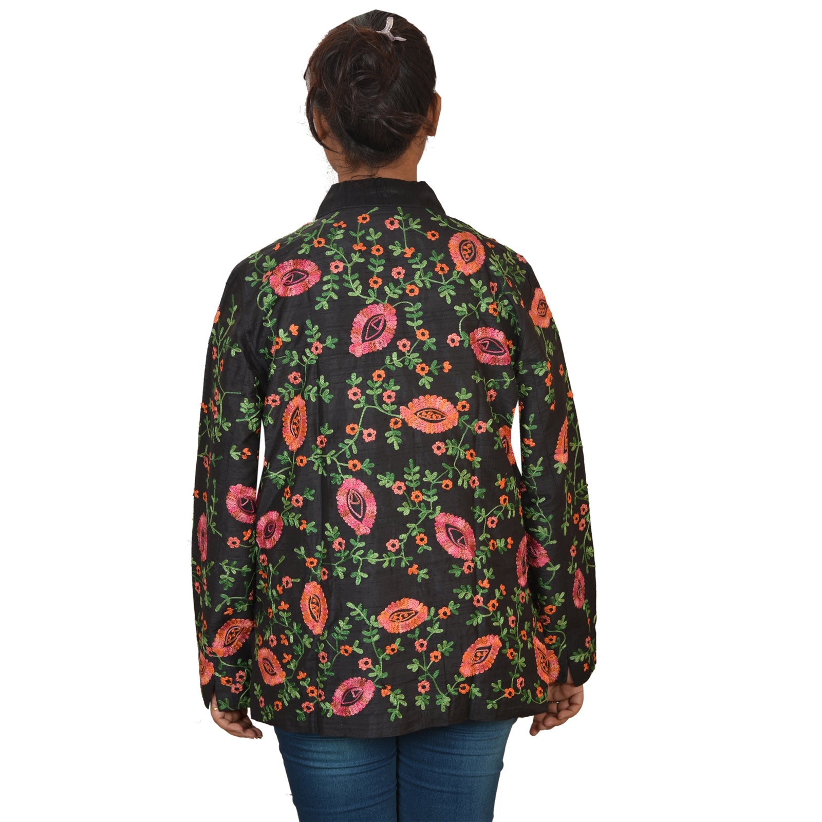 Sanskriti Vintage Sustainable Fabric Blend Silk Embroidered Short Top Jacket Black Floral