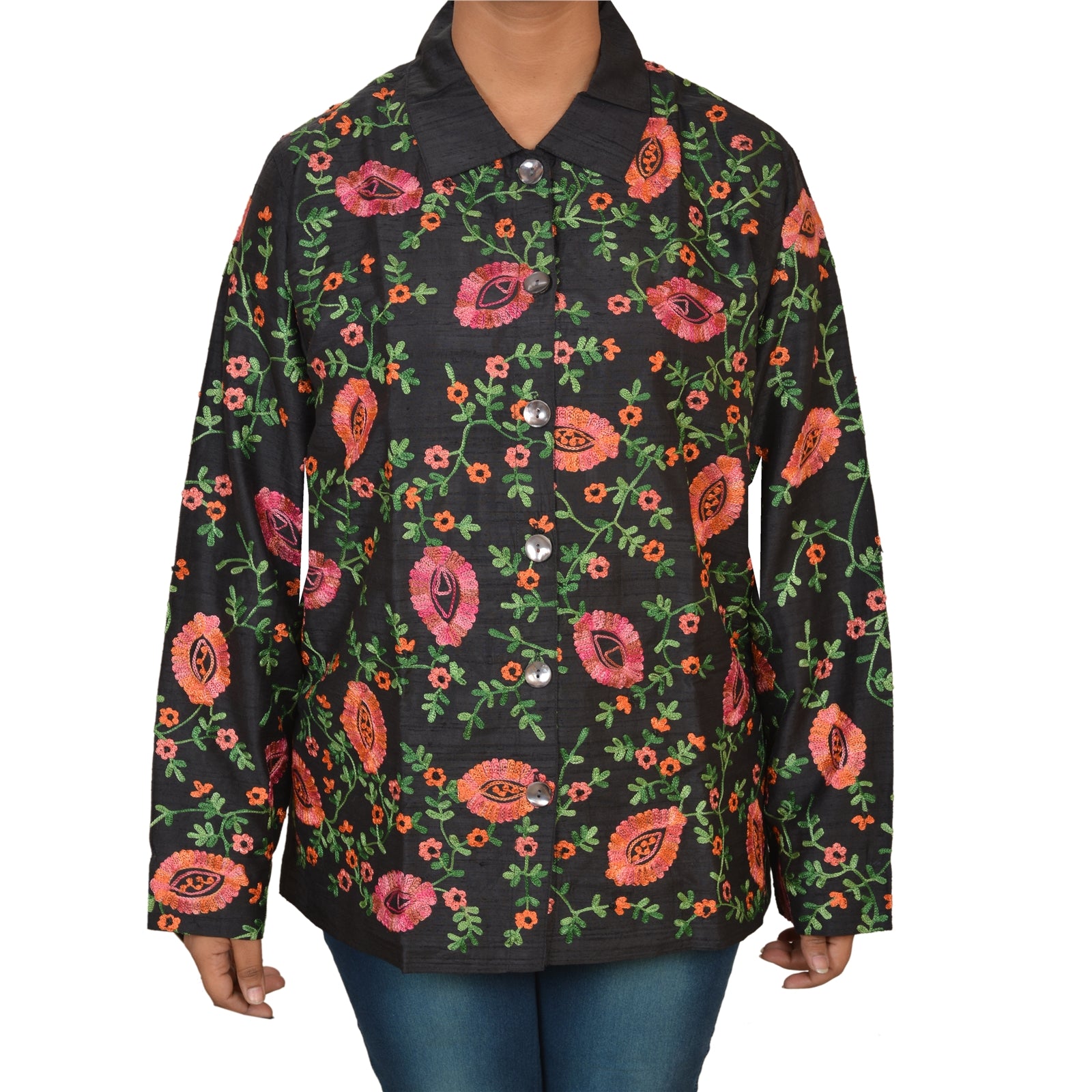 Black color blend silk embroidered short top. Floral design painstakingly hand worked in shades of pink, green, black and orange. Top with remarkable embroidery brighten the look of wearer and adds up charm to their outfits. Awesome work. This designer top with a collars and buttons in front will make you look smart & elegant. Team it with leggings for comfort & style.