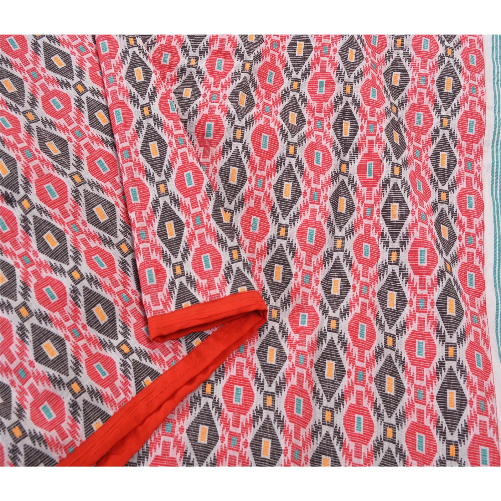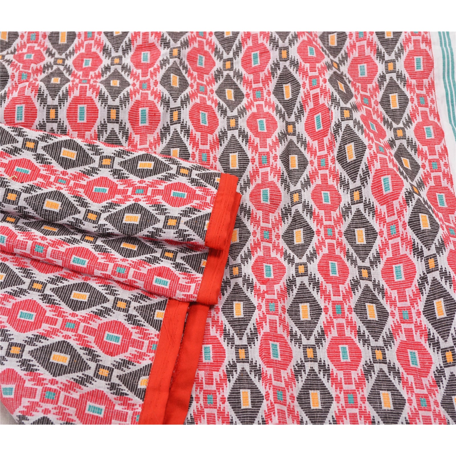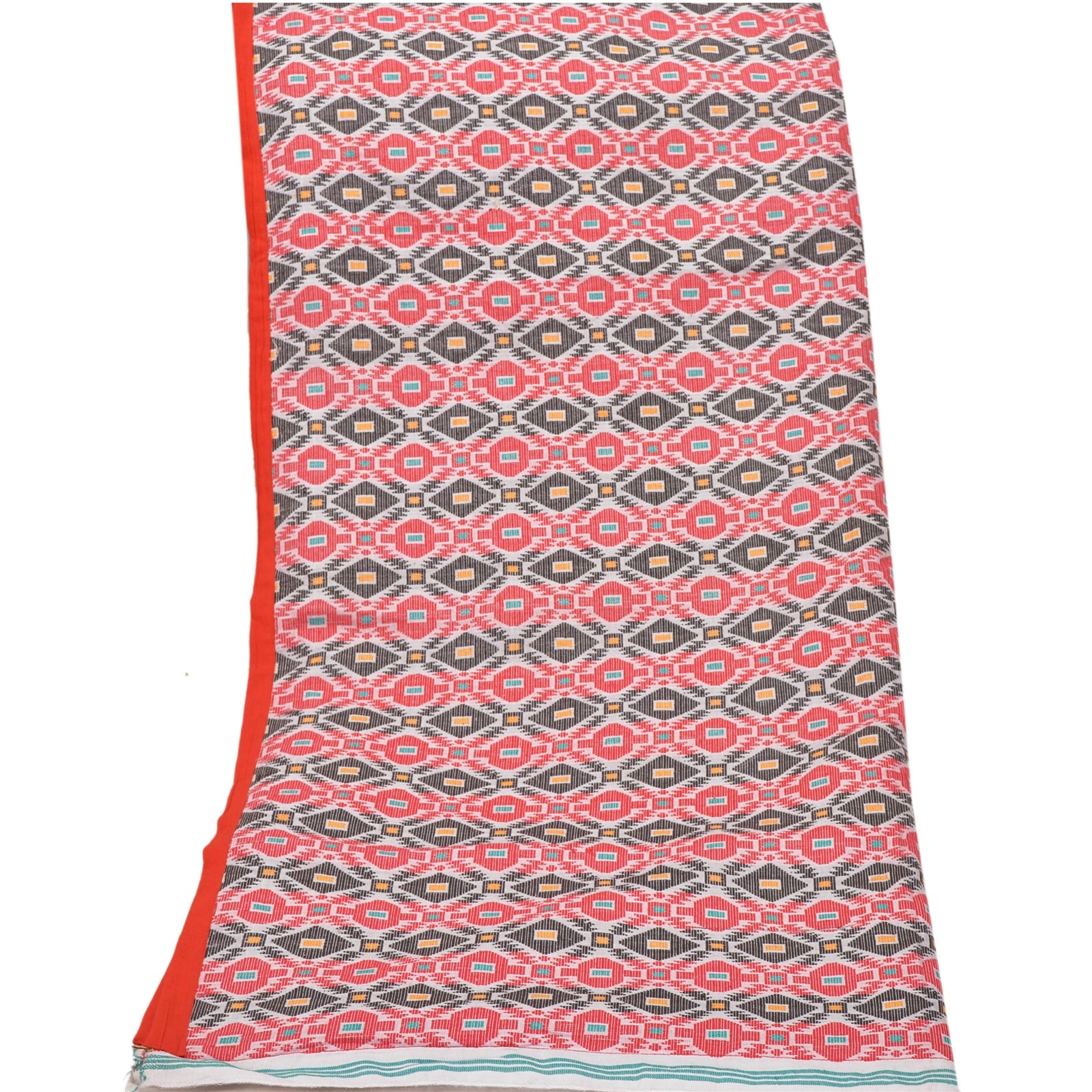 Traditional hand woven Gamosa Heavy Dupatta. This one of a kind item is difficult to express in words. All over feature is multi color geometric design, red Sustainable Fabric patch work on both sides of border is the highlight of the dupatta... Gamusa is a traditional piece of cloth which is of great significance to the Assamese community. It is a rectangular shape cloth hand woven in white colour having red borders across its two length sides and beautiful motifs woven across its two breadth sides..At par with gamusa, there are beautifully woven symbolic clothes with attractive graphic designs being used by different cultural sub-systems and ethno-cultural groups as well. There were various other symbolic elements and designs traditionally in use, which are now only found in literature, art, sculpture, architecture, etc. or used for only religious purposes (in particular occasions only). The typical designs of Assamese-lion, dragon, flying-lion, etc. were used for symbolizing various purposes and occasions. Awesome one !!!