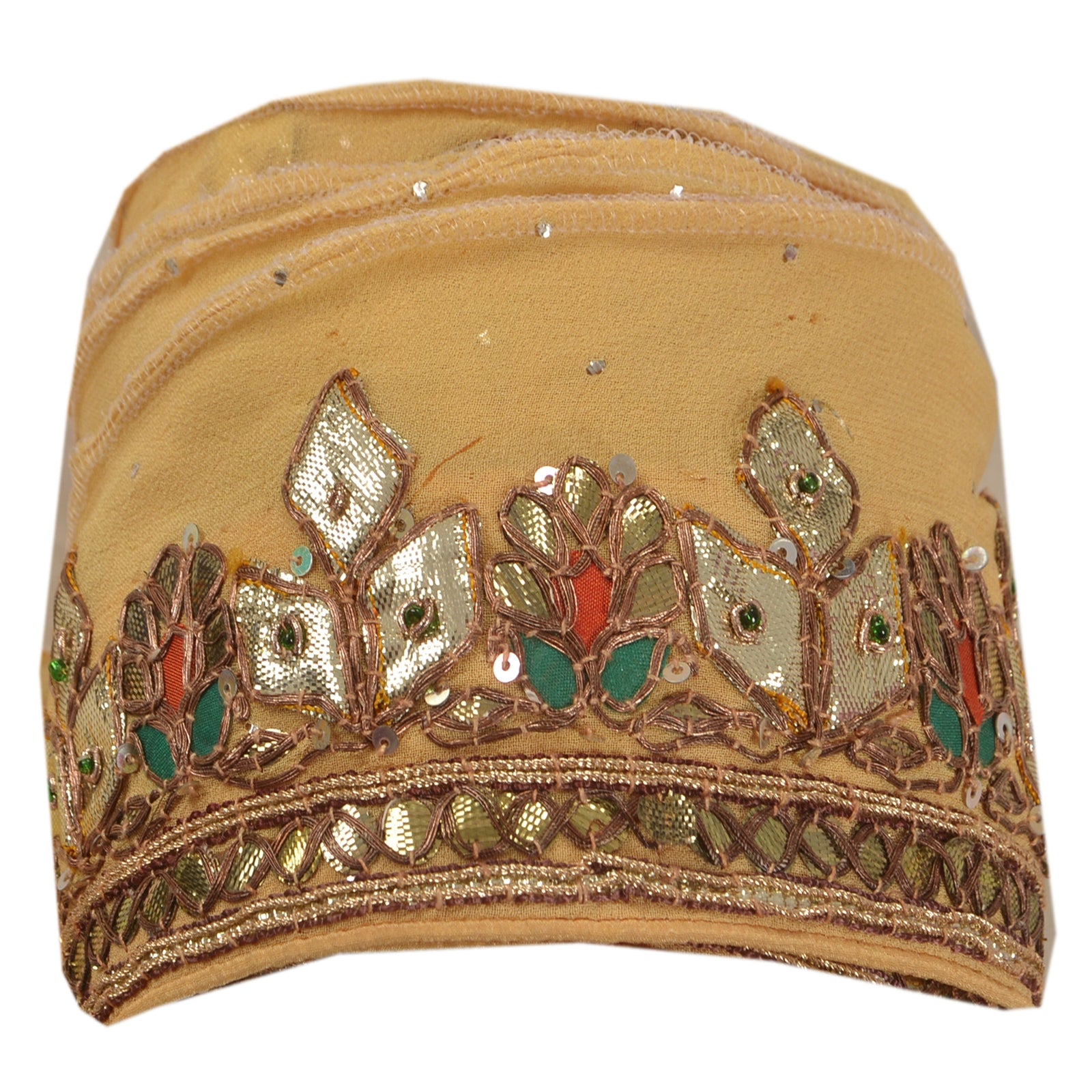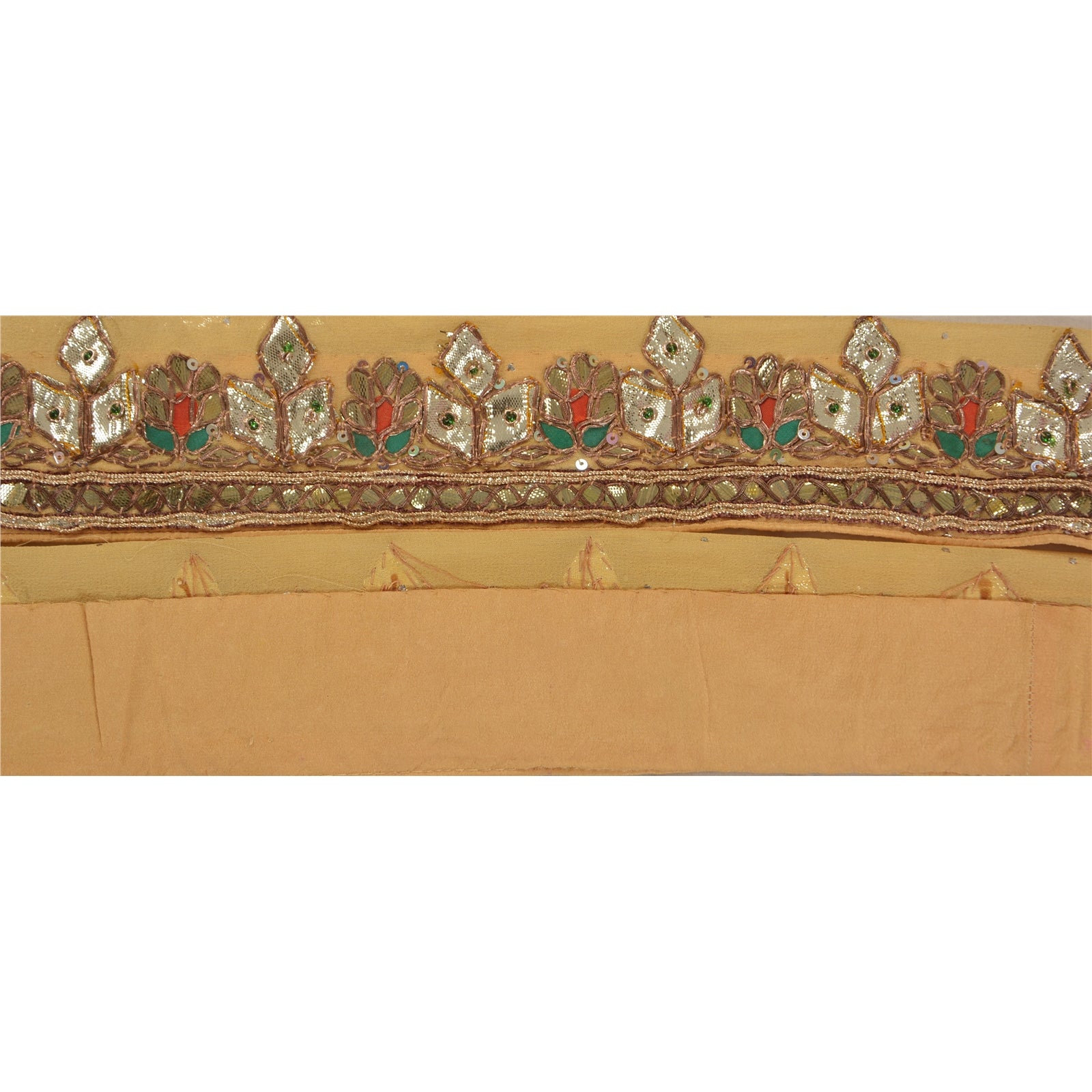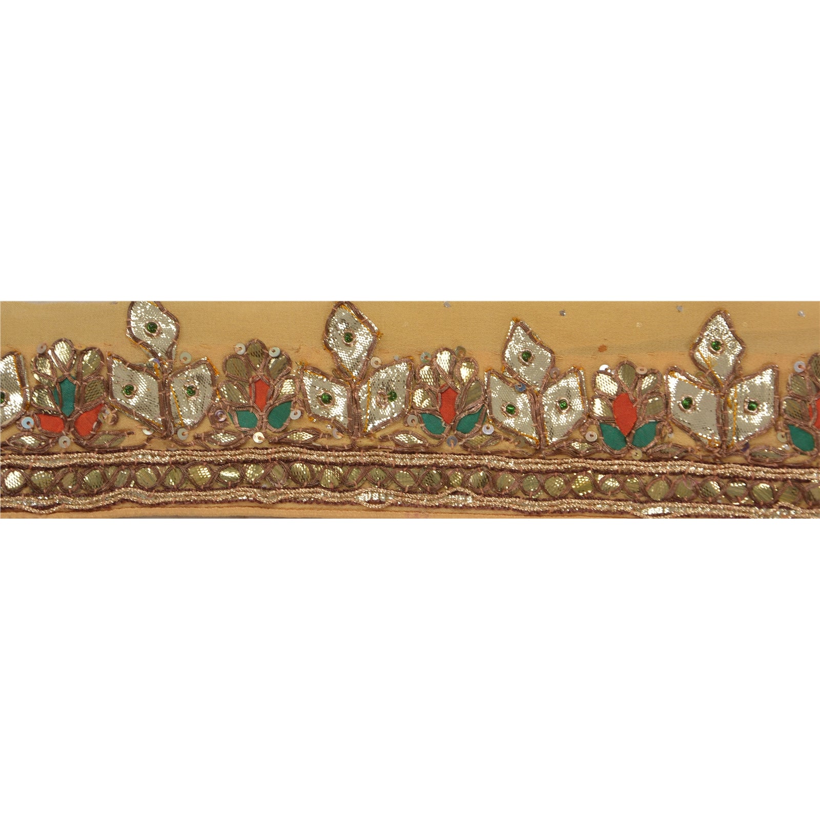Wonderful georgette hand beaded sari border in cream color gota patti work. Border has beautiful floral patterns painstakingly hand beaded with golden zari/zardozi work, golden sequins, green glass beads work . Further you can see fine detailing with golden gota patti work, red/green Sustainable Fabric patch work. . WOW!! an awesome one of a kind versatile border. 1 Quantity = 1 Yard