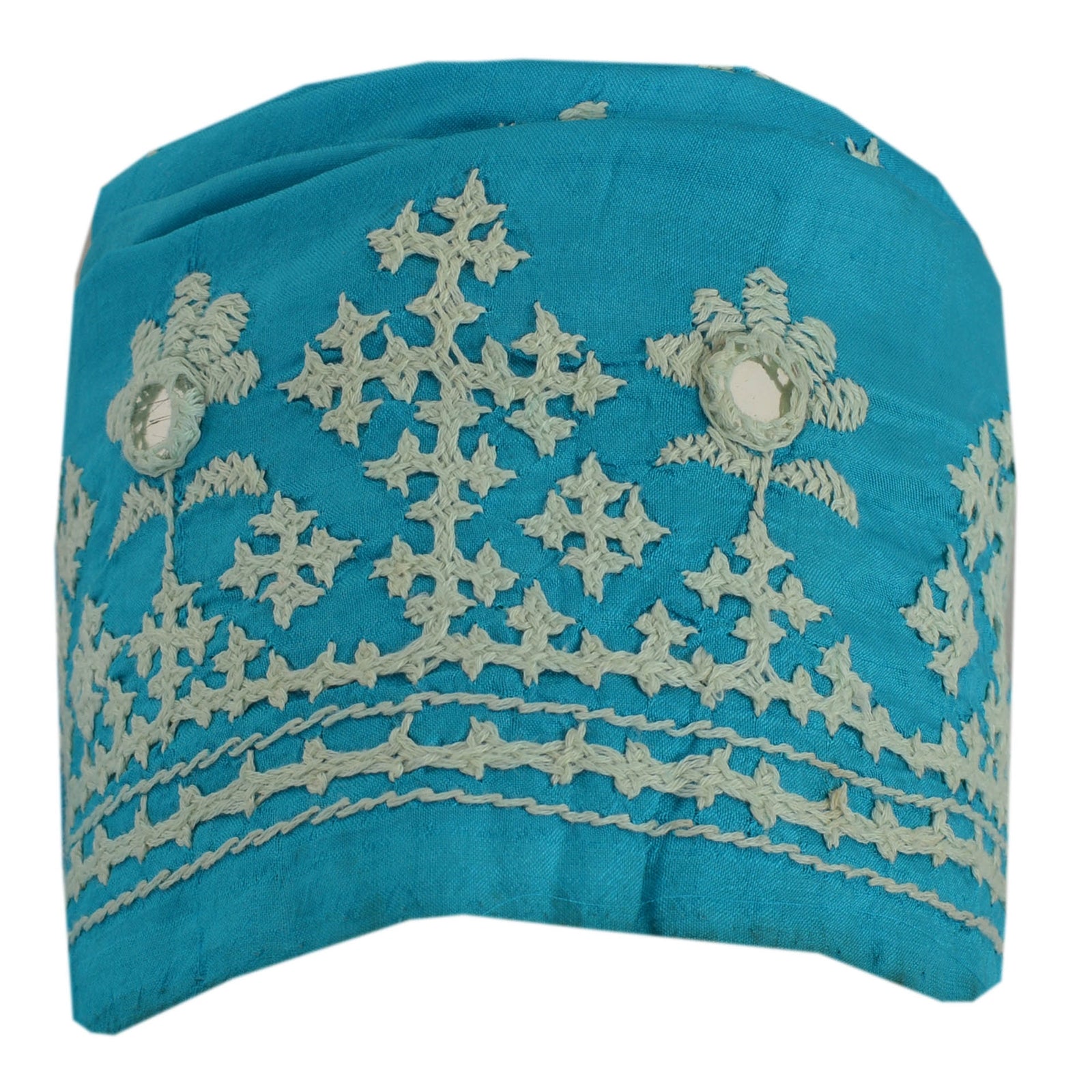 Amazing pure silk hand embroidered Kutch sari border in blue color highlighting thread work. Border has beautiful floral patterns painstakingly hand embroidered with cream thread work, mirror work . WOW!! an awesome one of a kind versatile border. 1 Quantity = 1 Yard