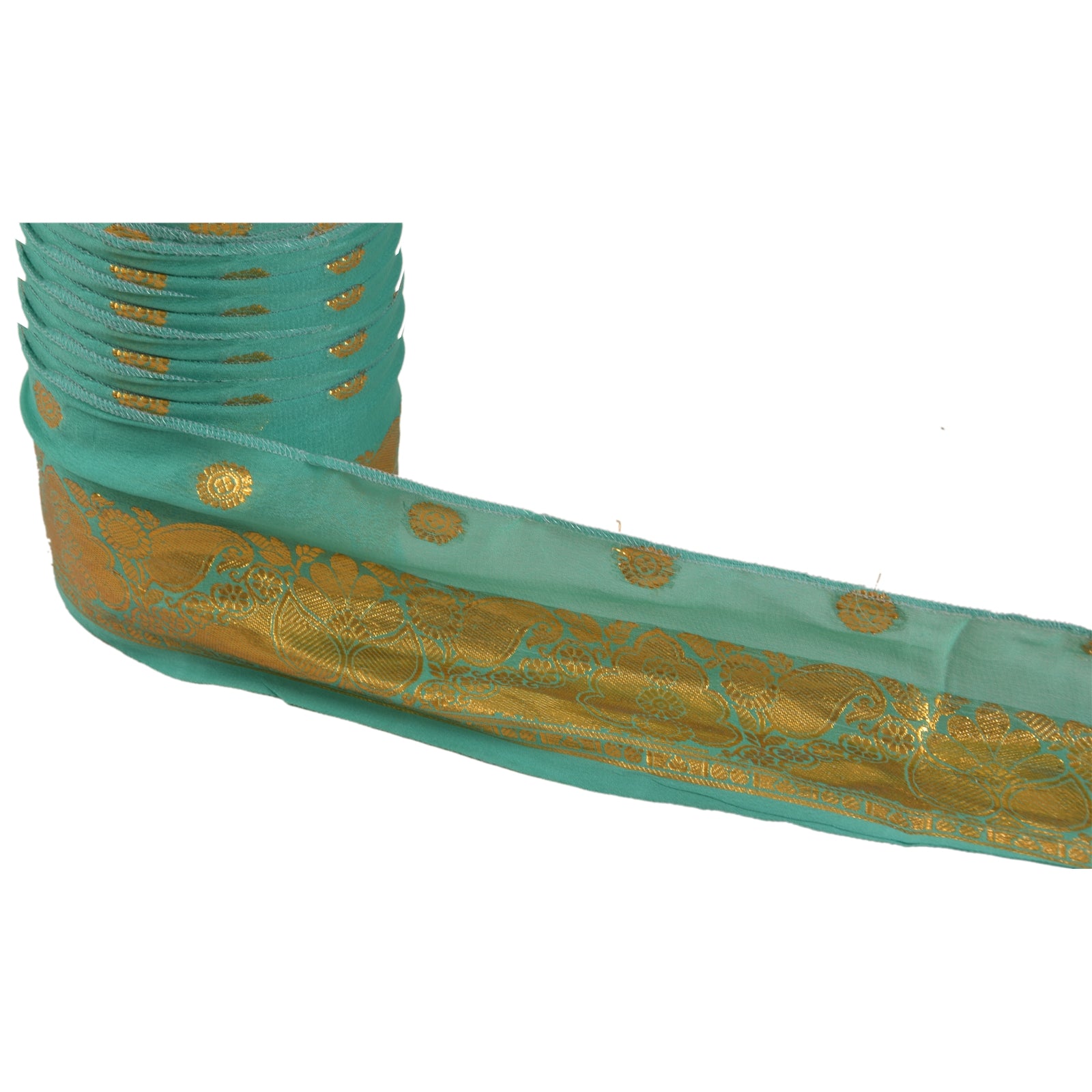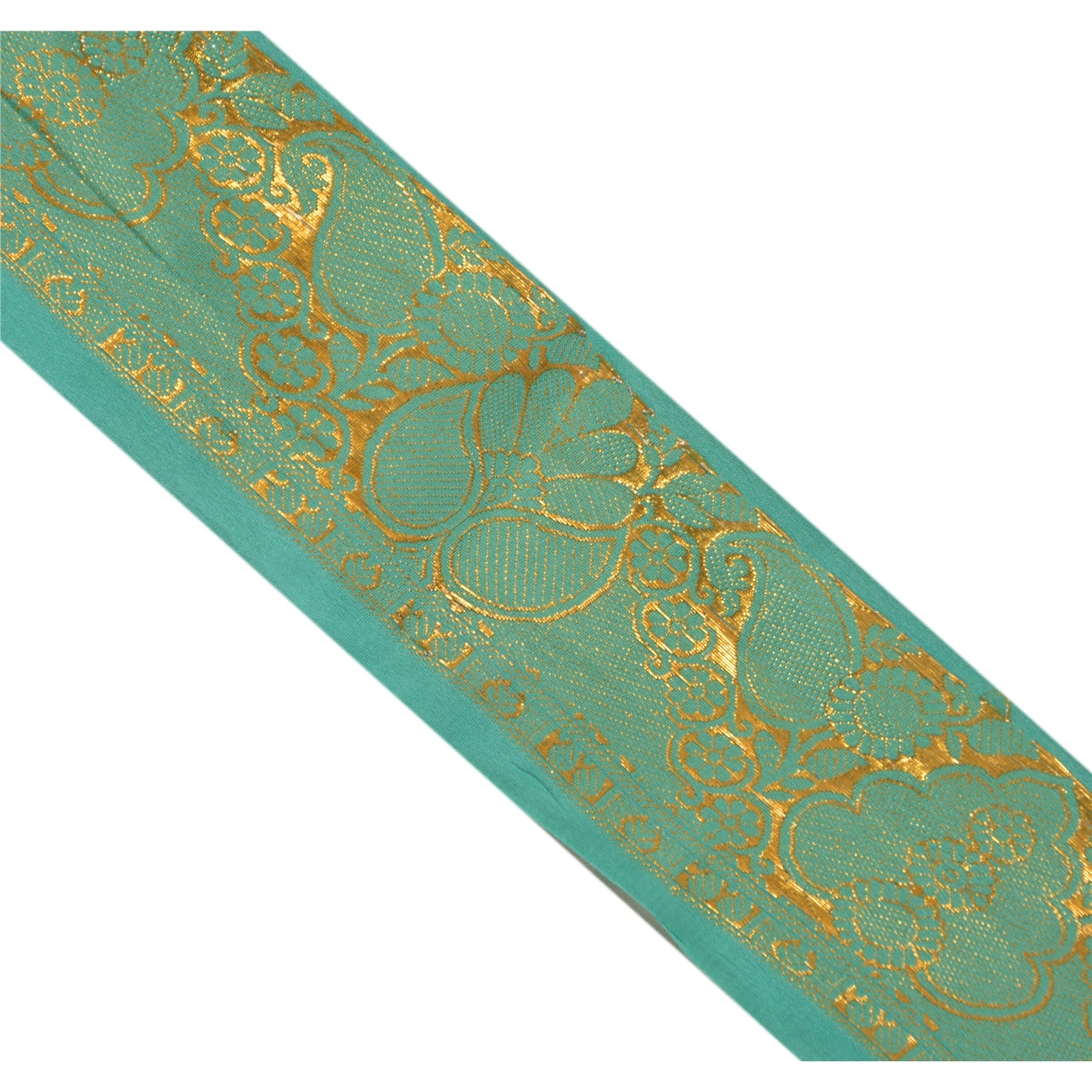 Wonderful pure silk woven sari border in green color highlighting woven work. Border has beautiful floral & paisley patterns painstakingly golden weaving work. WOW!! an awesome one of a kind versatile border. 1 Quantity = 1 Yard