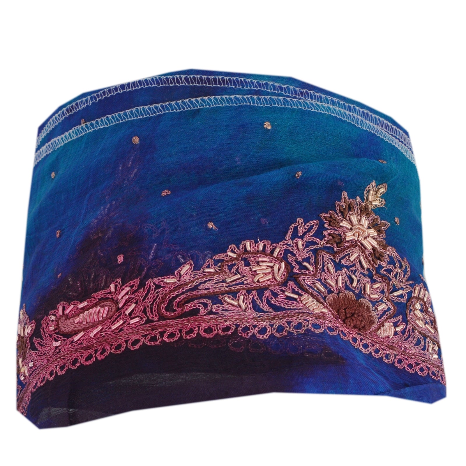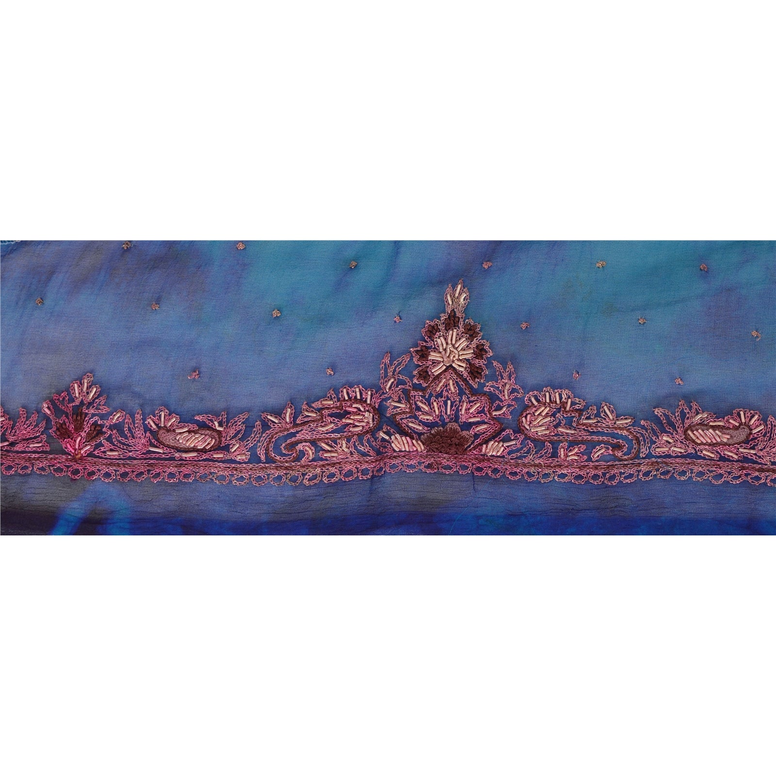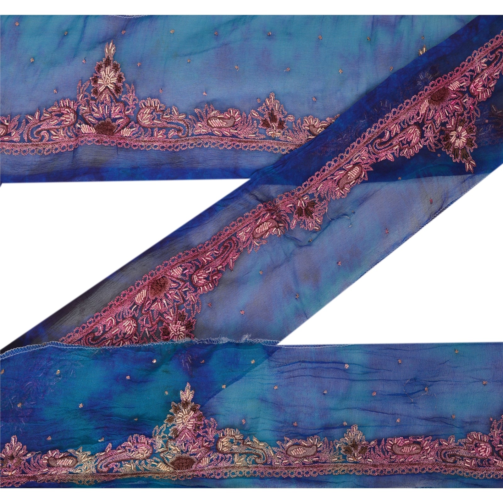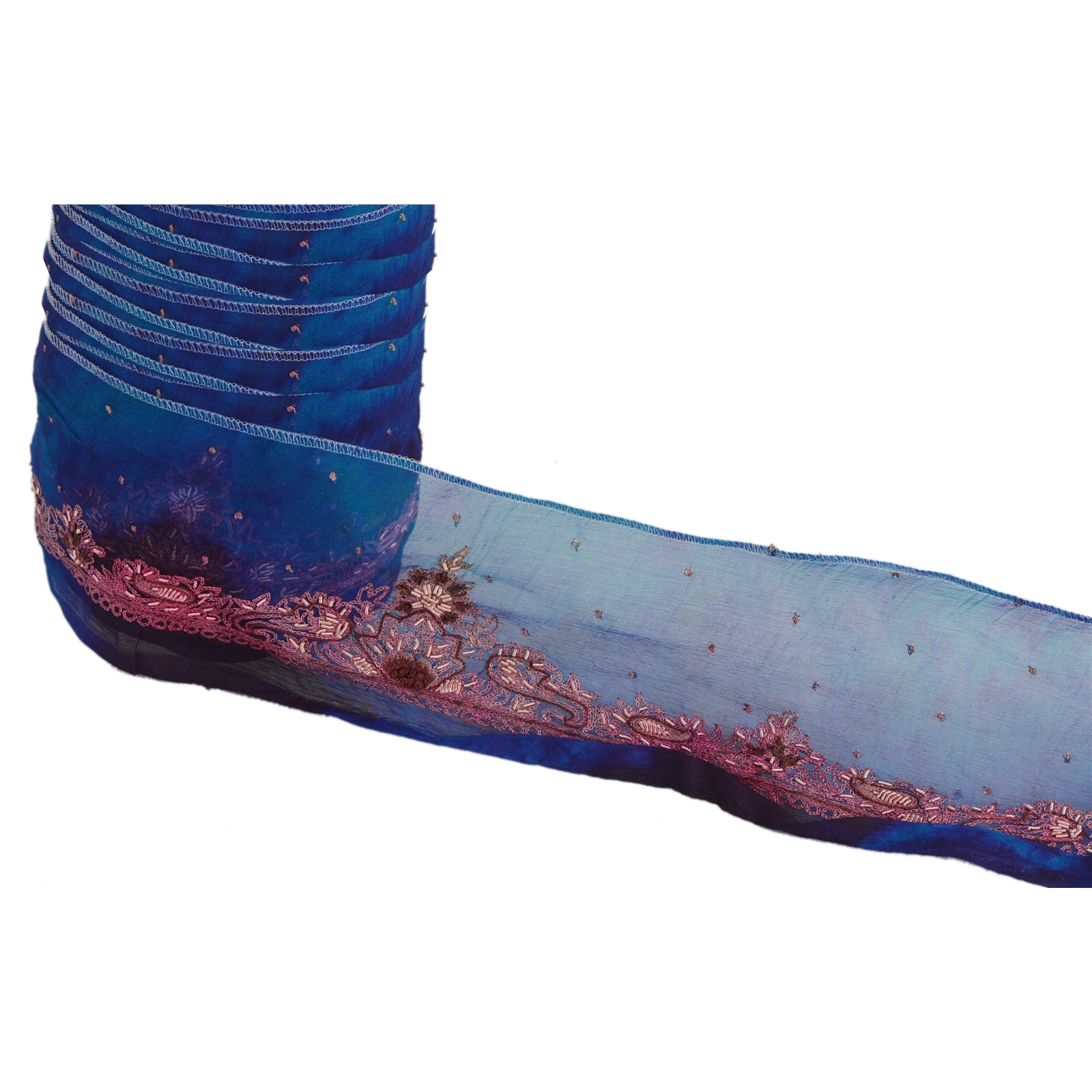 Fabulous chiffon silk hand embroidered tie & dye sari border in blue & green color highlighting zari work. Border has beautiful floral and paisley patterns painstakingly hand embroidered with gold zari and zardozi work . Further you can see fine detailing with brown thread work. WOW!! an awesome one of a kind versatile border. 1 Quantity = 1 Yard