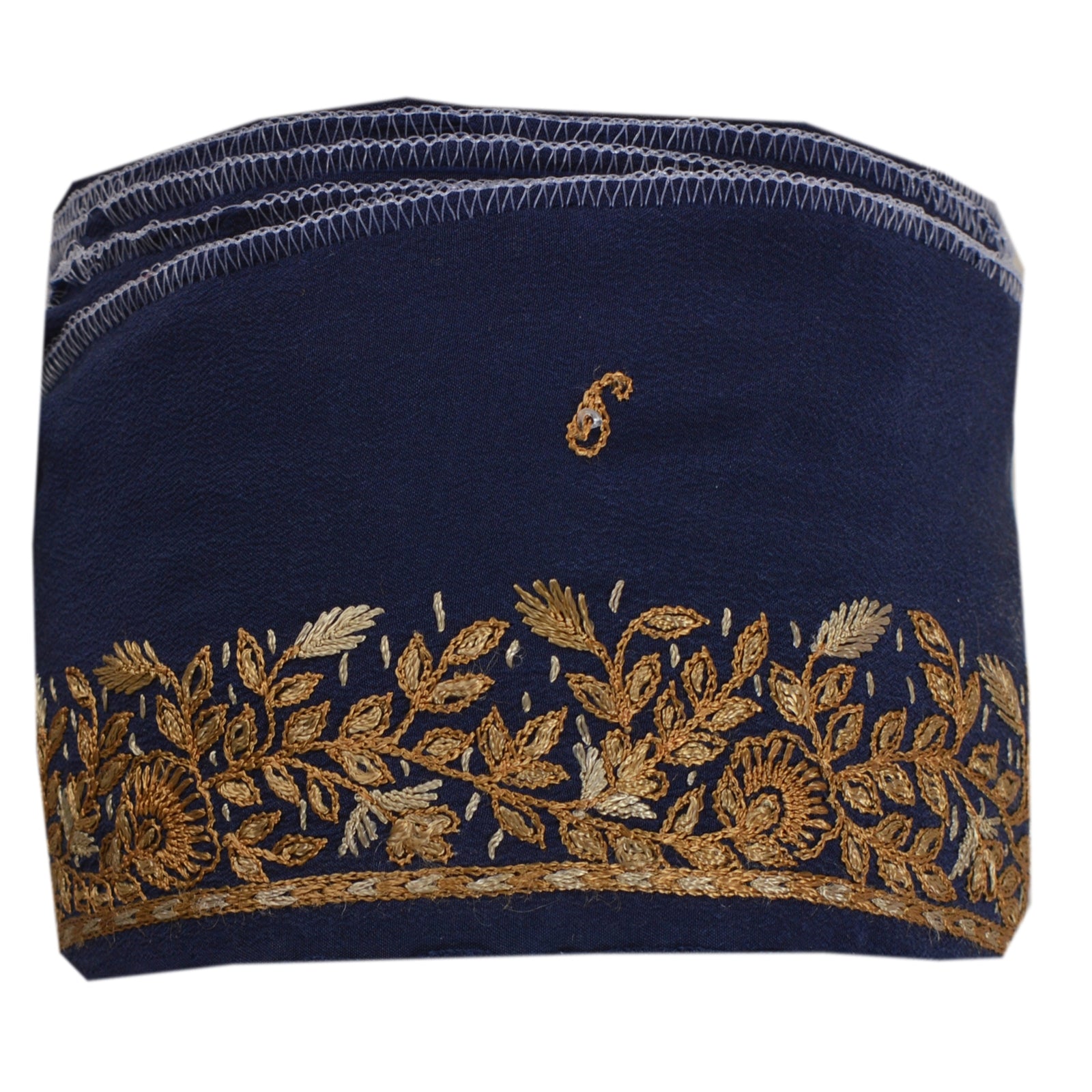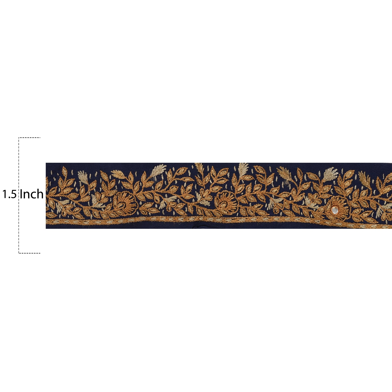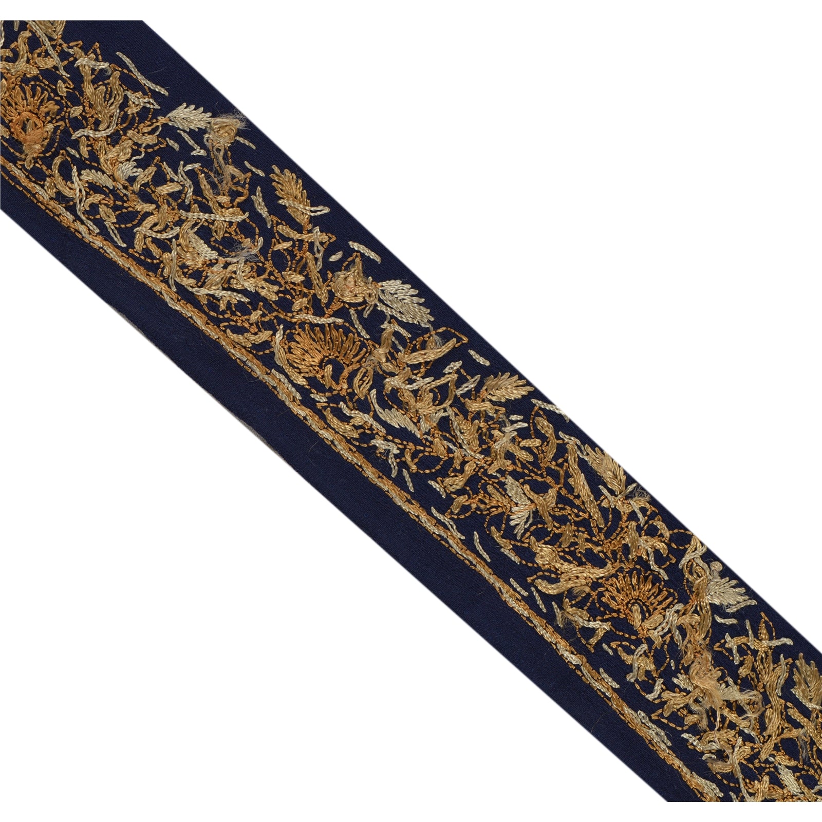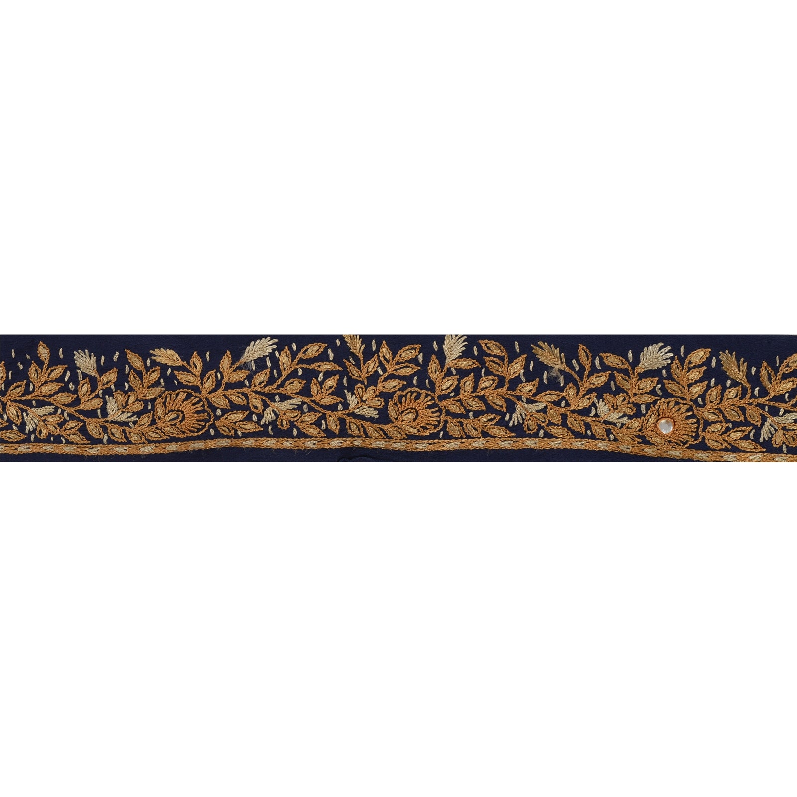 Amazing crepe silk hand embroidered sari border in blue color highlighting thread work. Border has beautiful floral patterns painstakingly hand embroidered with brown/cream thread work. WOW!! an awesome one of a kind versatile border. 1 Quantity = 1 Yard