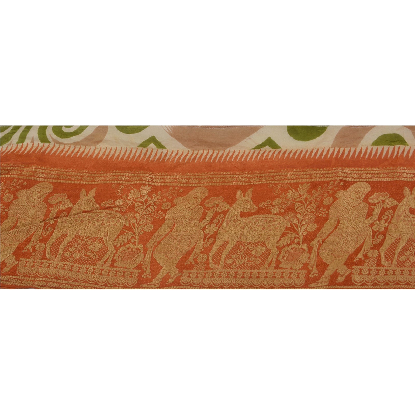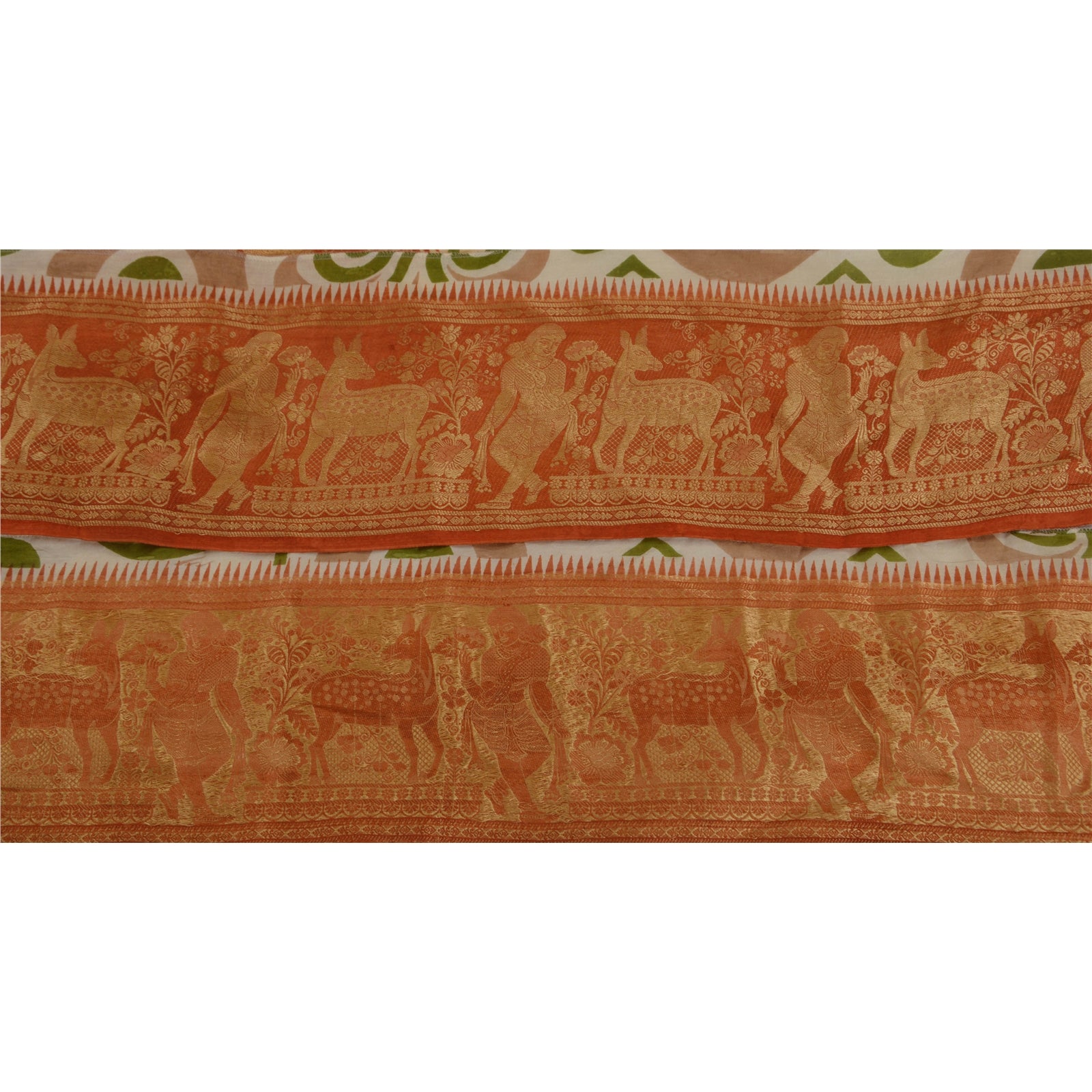 THE ITEM COLOR OR SHADE MAY BE DARKER OR LIGHTER THAN THE PICTURE. Wonderful pure silk woven sari border in orange color highlighting traditional Baluchari work from Odisha (Eastern India). Border has beautiful woven pattern in cream color showcasing woman with deer pattern. Floral motifs further add to the beauty of the trim. WOW!! and awesome one of a kind versatile border. 1 Quantity = 1 Yard Shipping Note: 'International buyers please note: Import duties, taxes, and charges are not included in the item price or postage cost. These charges are the buyer's responsibility. Please check with your country's customs office to determine what these additional costs will be prior to bidding or buying. Buyer will pay custom duty/tax. It is calculated and charged differently by every country. As a seller I do not have any control over it. VAT or sales tax is calculated by the platform at the time of checkout. Customs charge is payable at the time of delivery.' B-14246