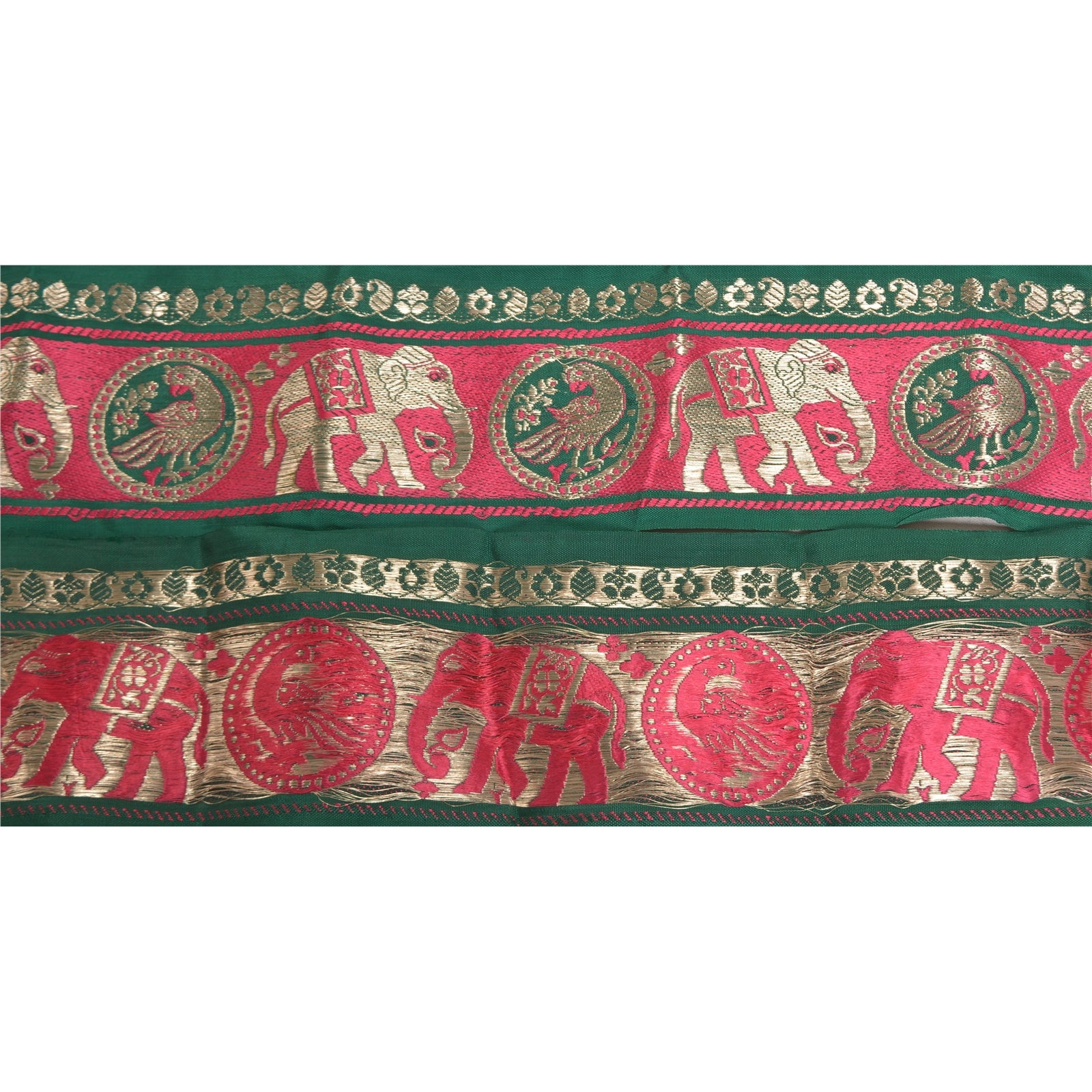 Traditional Woven Gujarati Brocade Woven 100% Pure Silk Sari Border In Green & Pink Color. Border has beautiful floral, elephant, peacock & paisley patterns painstakingly golden metallic zari weaving work. Further you can see fine detailing with green/pink thread woven work. WOW!! an awesome one of a kind versatile border. 1 Quantity = 1 Yard