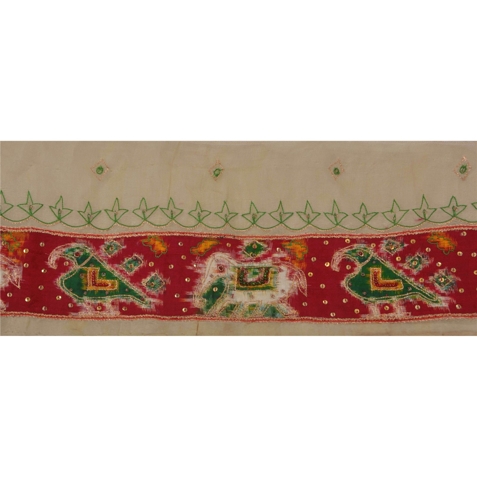 Fabulous organza silk woven patola sari border in cream color highlighting patch work. Border has beautiful elephant and parrot design patterns woven in white, green and yellow colour on dark red base. Further you can see fine detailing with golden sequins and zari. WOW!! an awesome one of a kind versatile border. 1 Quantity = 1 Yard B-14184