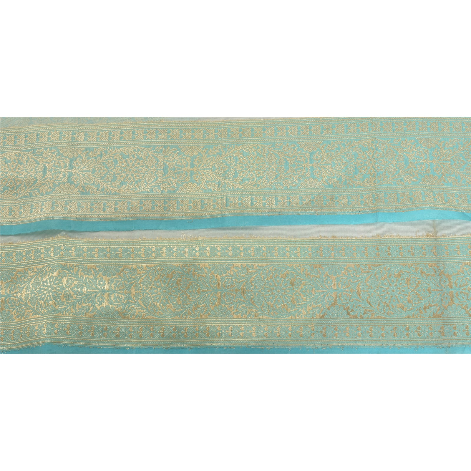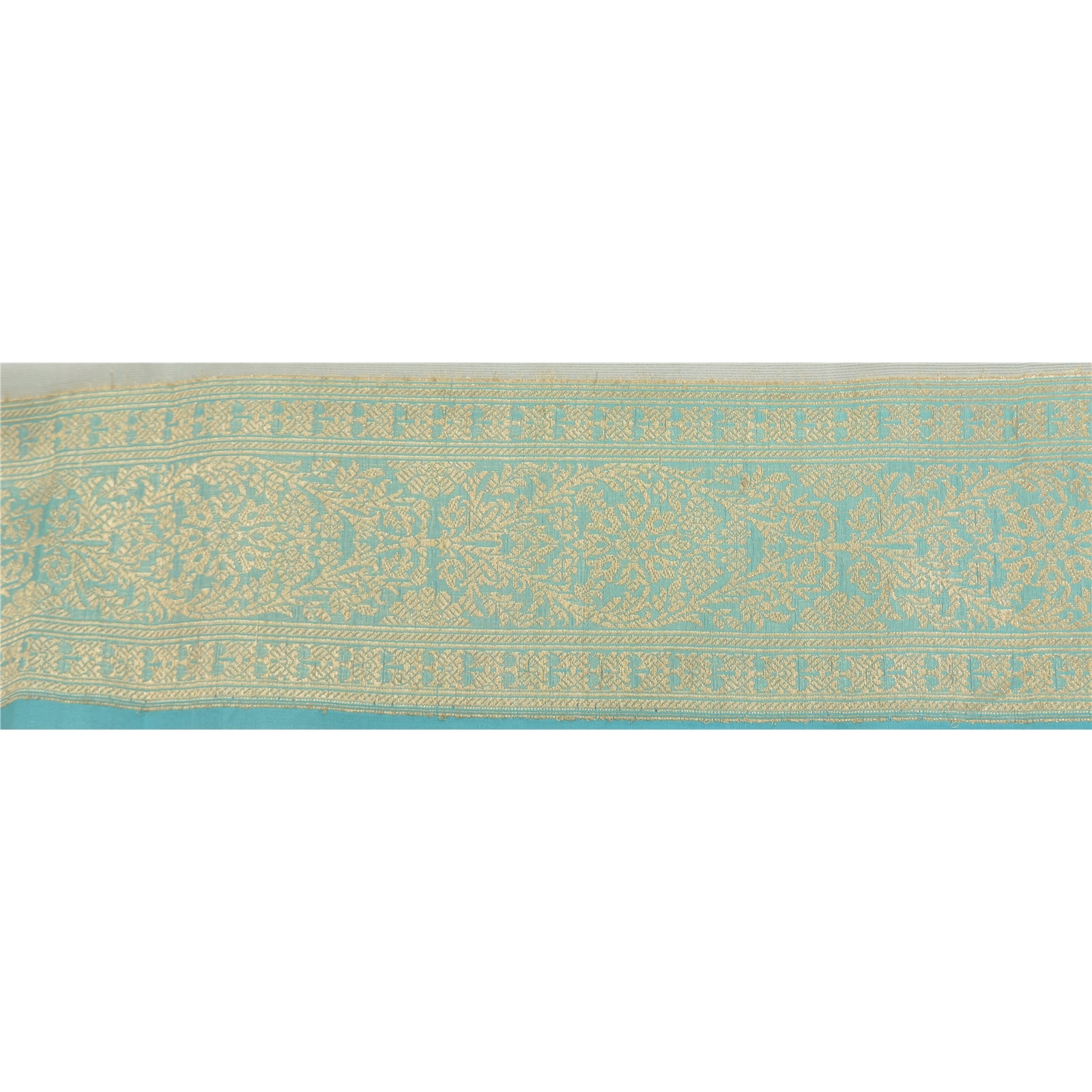 Beautiful 100% Pure Organza Silk Sari Border In Blue Color Highlighting Banasari/Brocade Woven work. Border has beautiful floral, peacock & paisley patterns painstakingly golden metallic zari weaving work. WOW!! an awesome one of a kind versatile border. 1 Quantity = 1 Yard