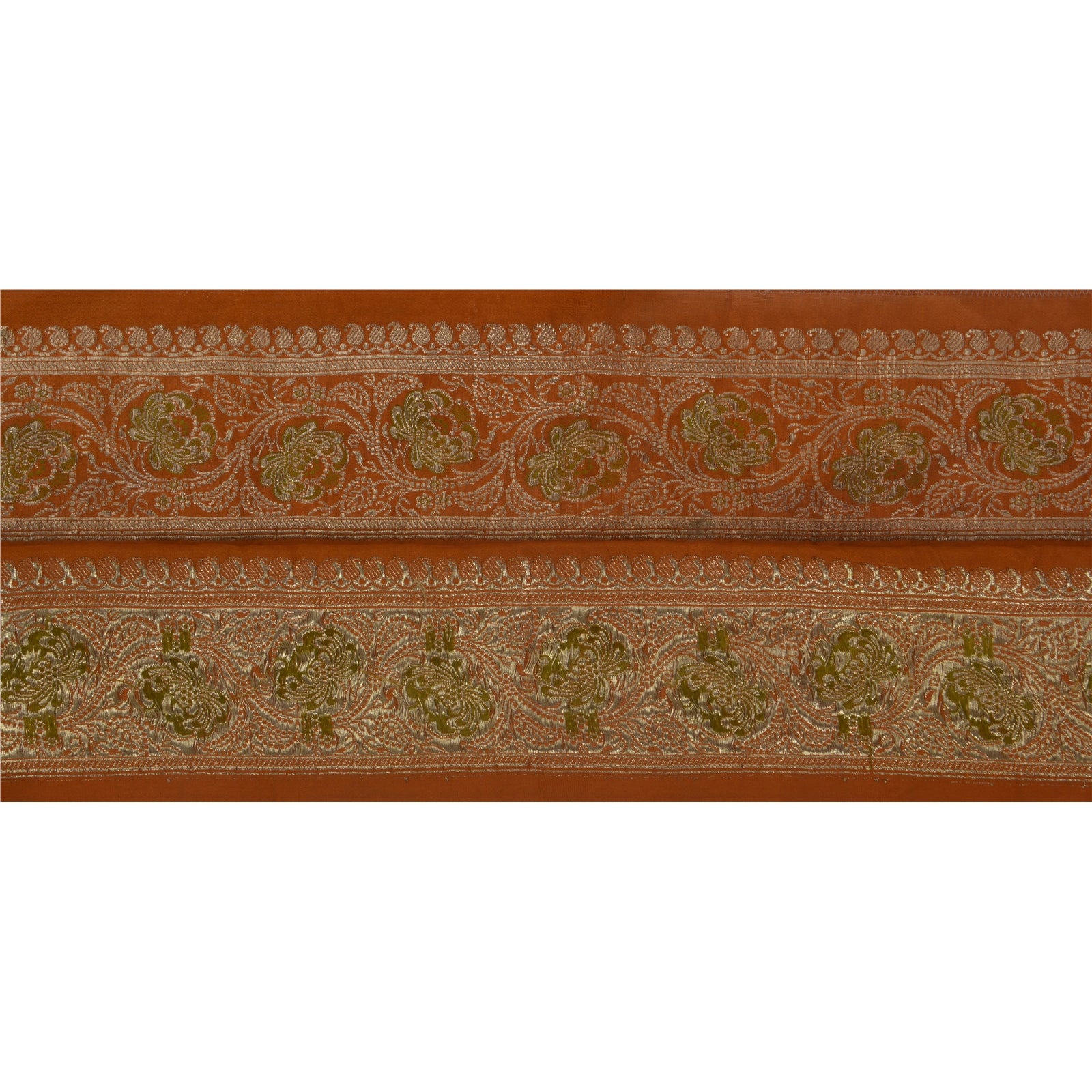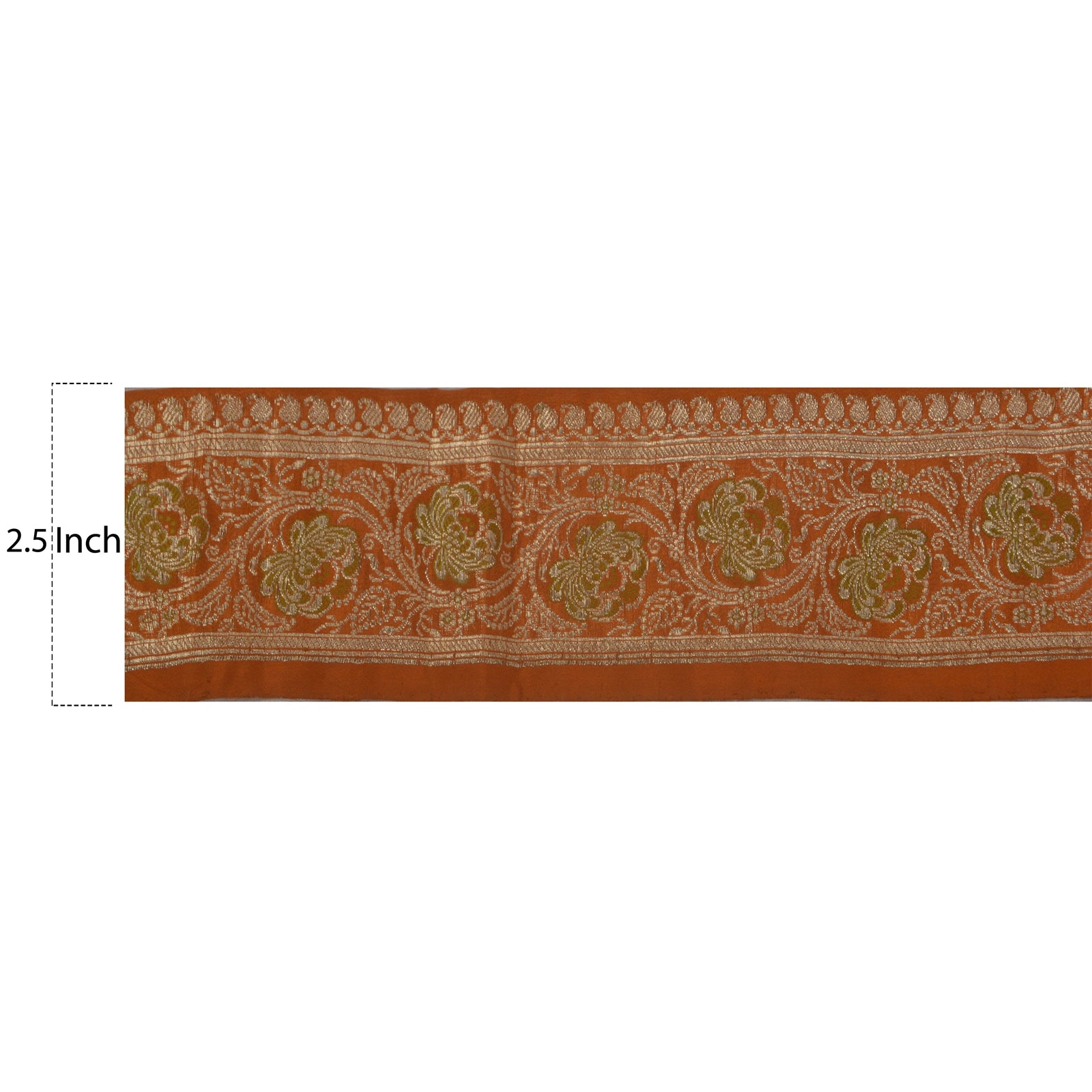 Outstanding pure silk woven brocade sari border in orange color highlighting zari work. Border has beautiful floral & paisley patterns painstakingly gold zari (electroplated copper metallic thread) work . WOW!! an awesome one of a kind versatile border. 1 Quantity = 1 Yard B-14311