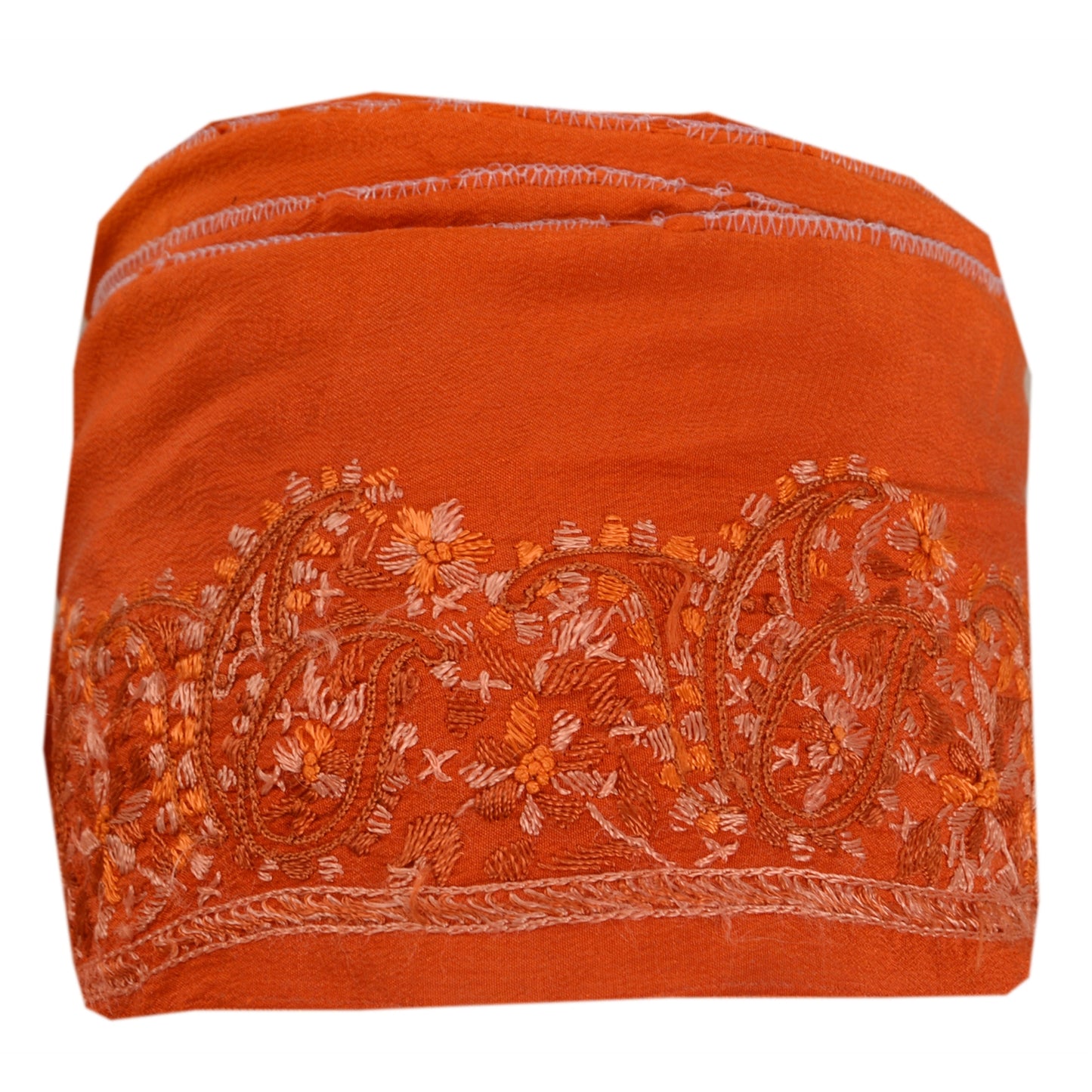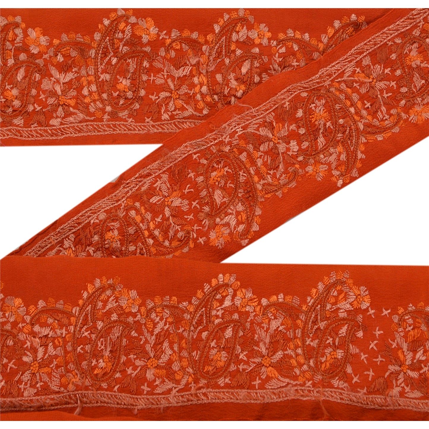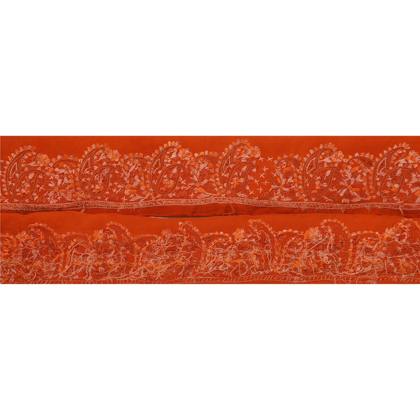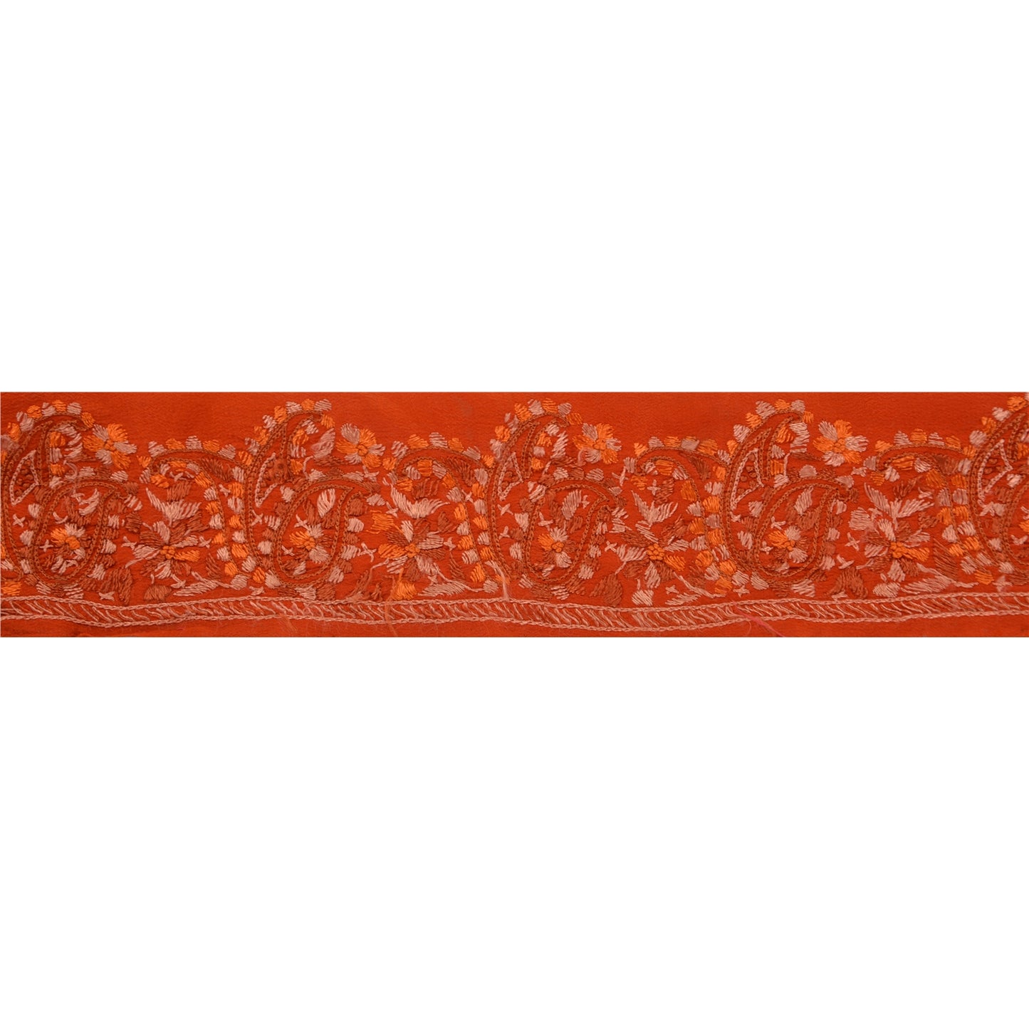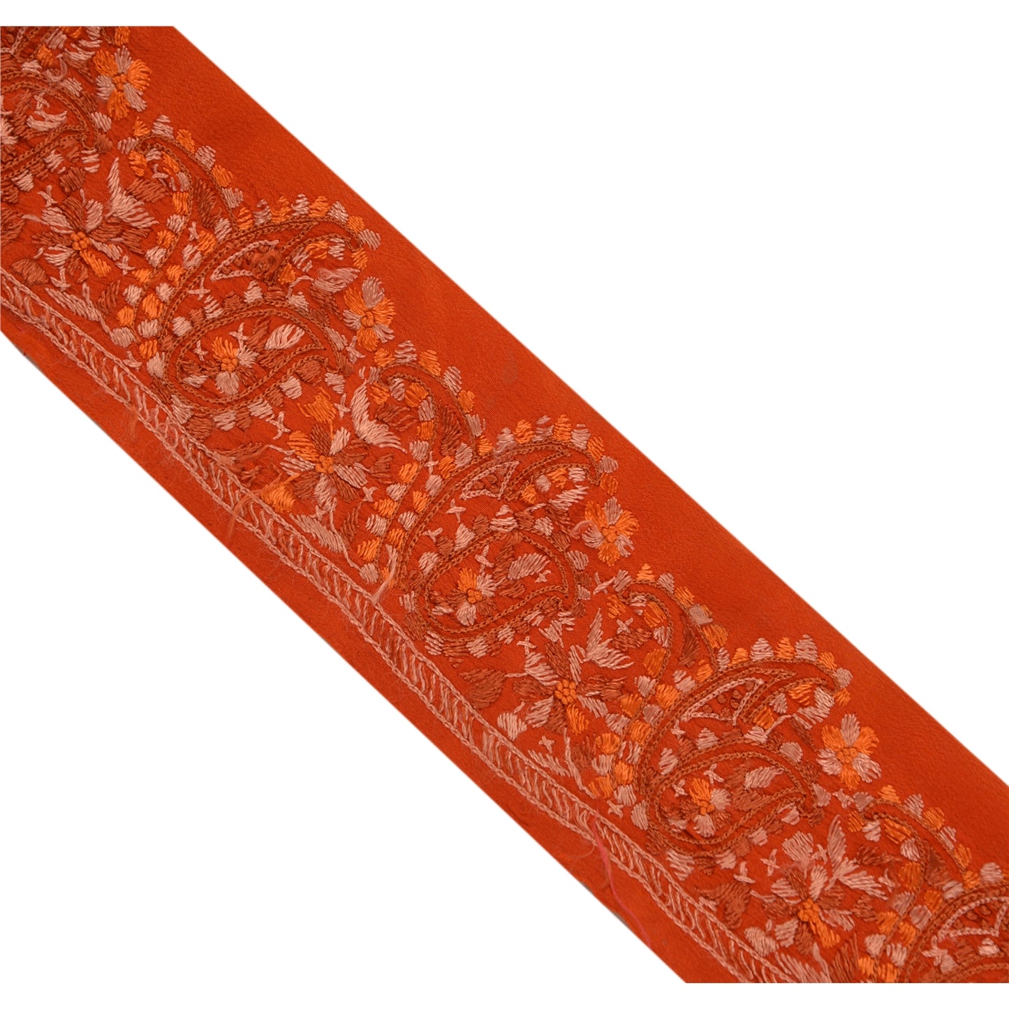 Amazing crepe silk hand embroidered sari border in orange color highlighting thread work. Border has beautiful floral & paisley patterns painstakingly embroidered with orange, peach thread work . WOW!! an awesome one of a kind versatile border. 1 Quantity = 1 Yard
