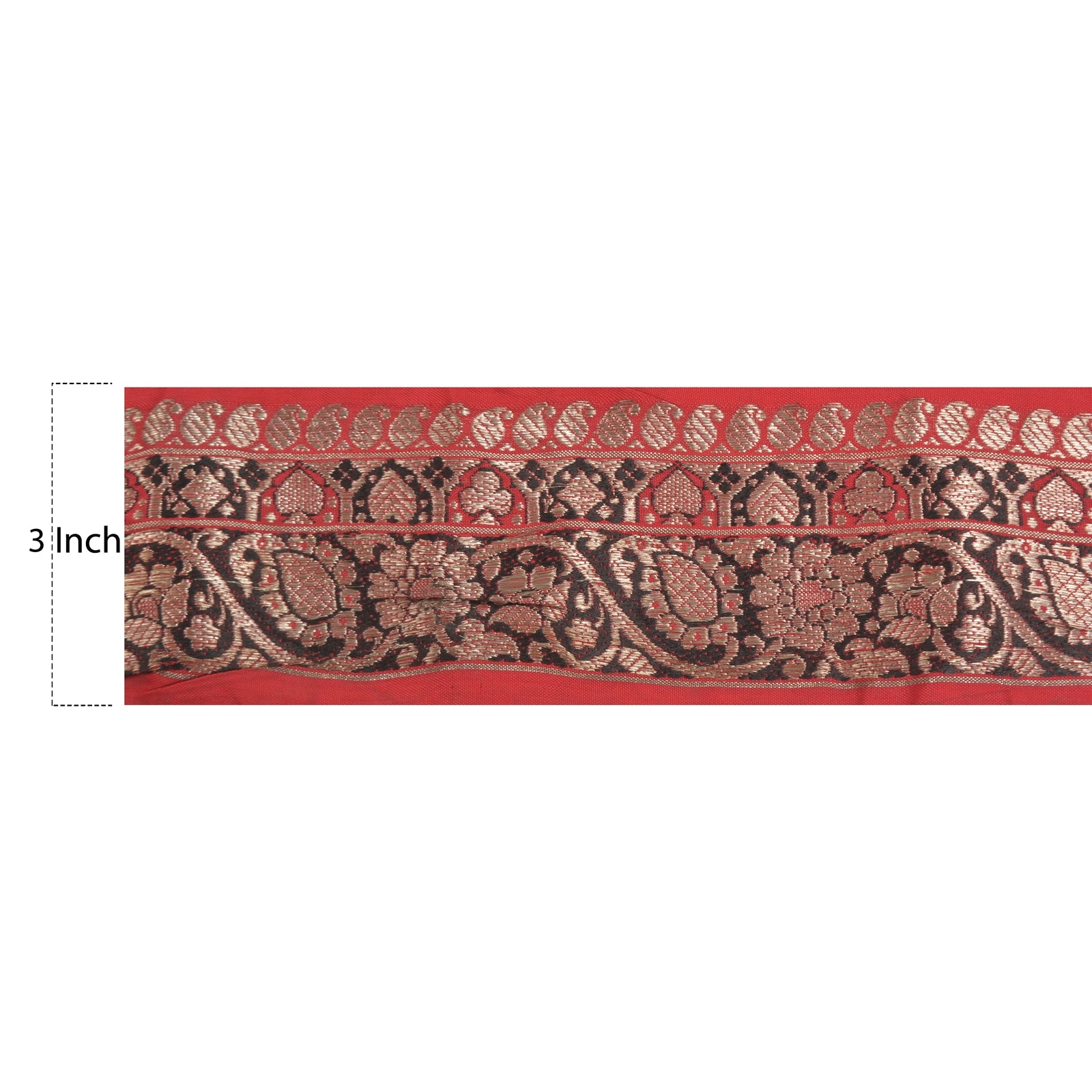 Graceful 100% Pure Silk Sari Border In Red & Black Color Highlighting Banasari/Brocade Woven work. Border has beautiful floral & paisley patterns painstakingly golden metallic zari weaving work. Further you can see fine detailing with black thread woven work. WOW!! an awesome one of a kind versatile border. 1 Quantity = 1 Yard