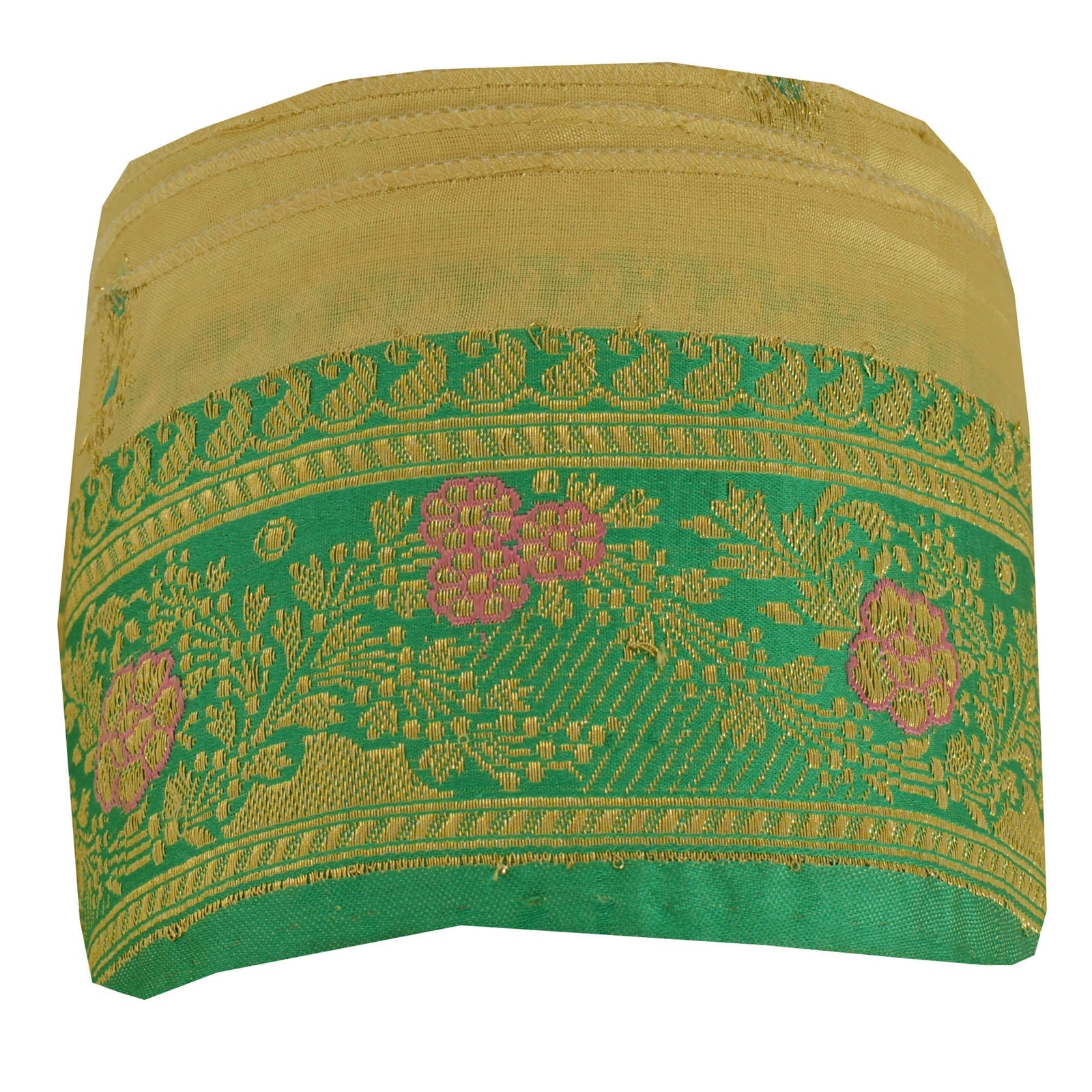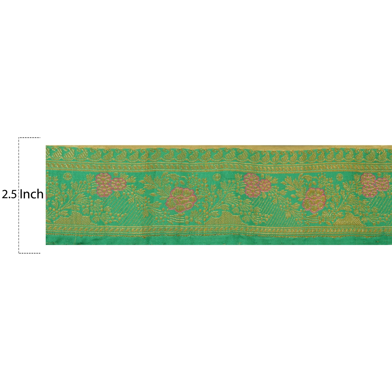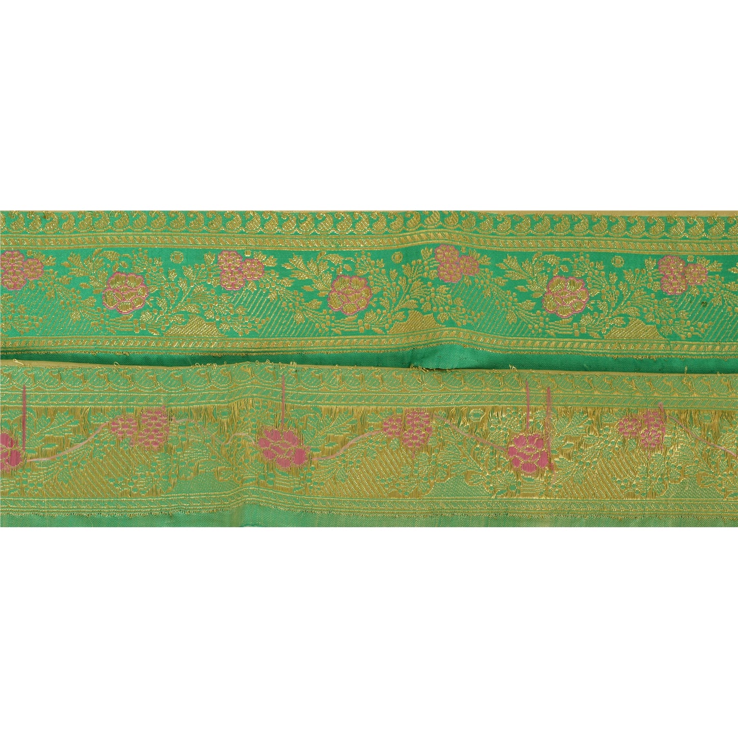Outstanding pure silk woven brocade sari border in green & cream color highlighting zari work. Border has beautiful floral & paisley patterns painstakingly golden zari (electroplated copper metallic thread) work, pink thread work. WOW!! an awesome one of a kind versatile border. 1 Quantity = 1 Yard