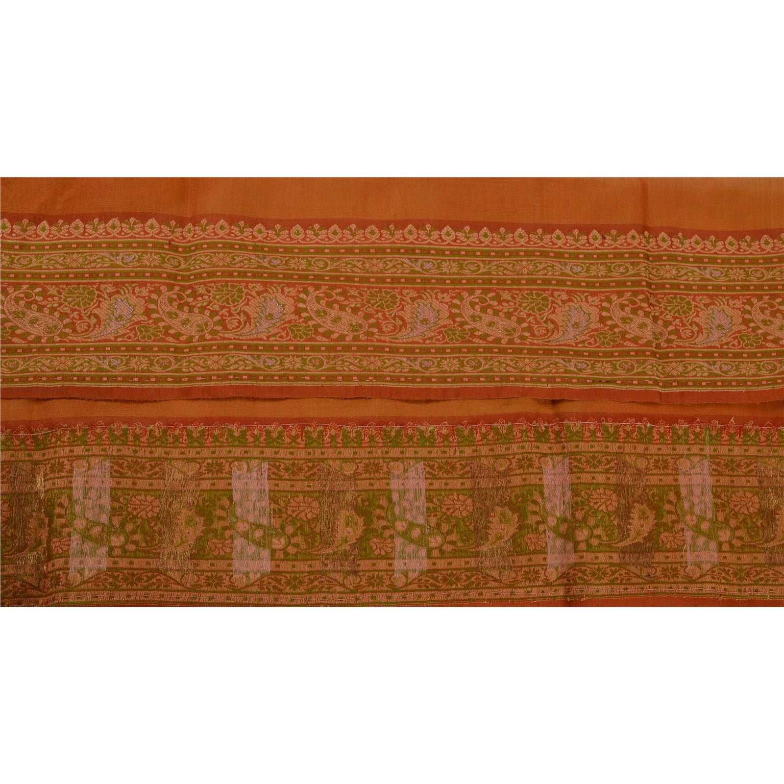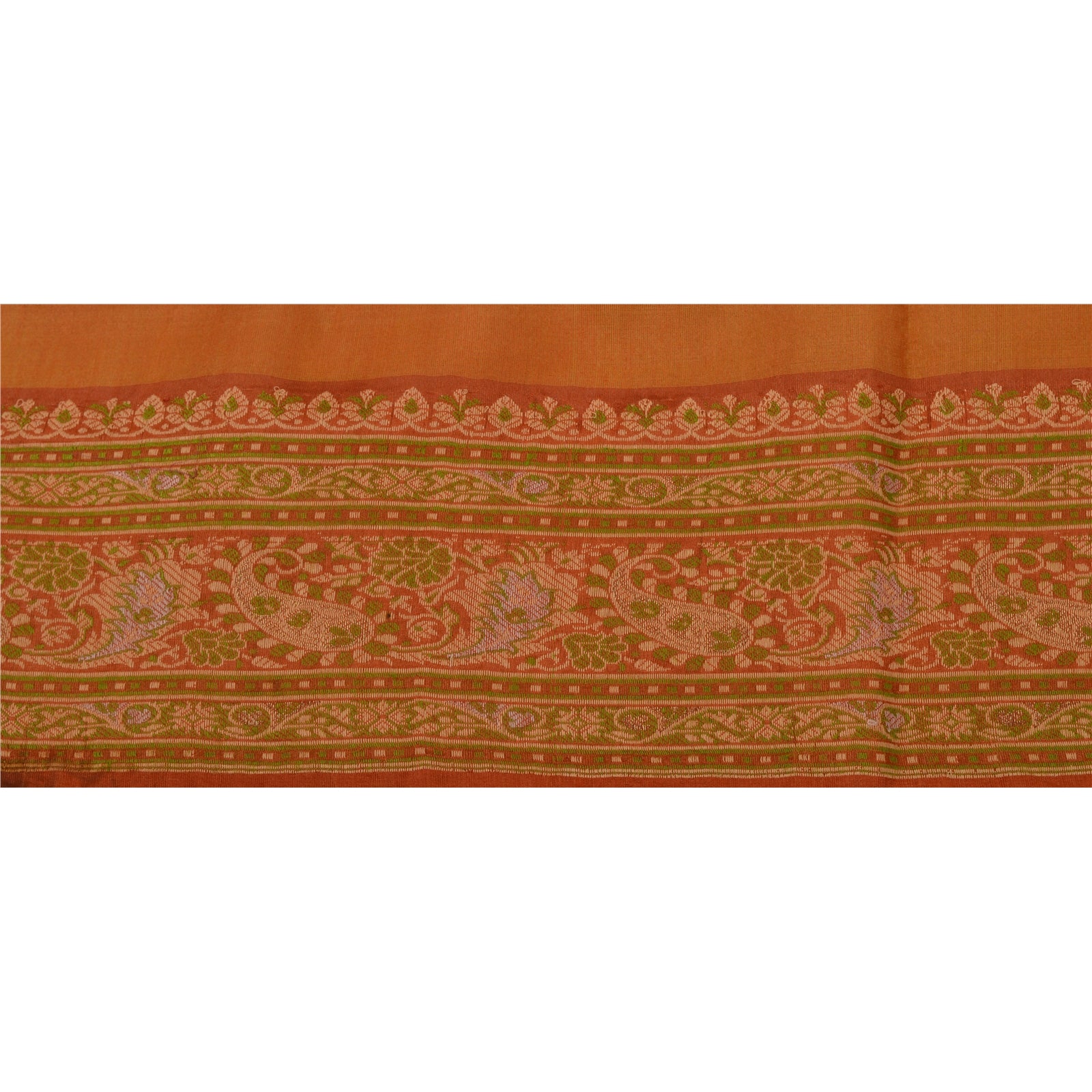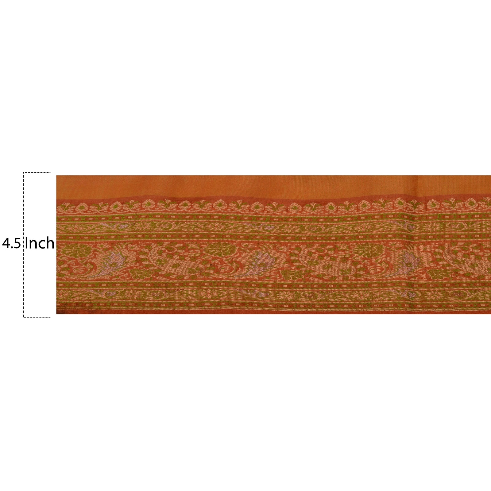 Attractive pure silk woven sari border in orange color highlighting woven work. Border has beautiful floral & paisley patterns painstakingly green, cream, golden weaving work. WOW!! an awesome one of a kind versatile border. 1 Quantity = 1 Yard