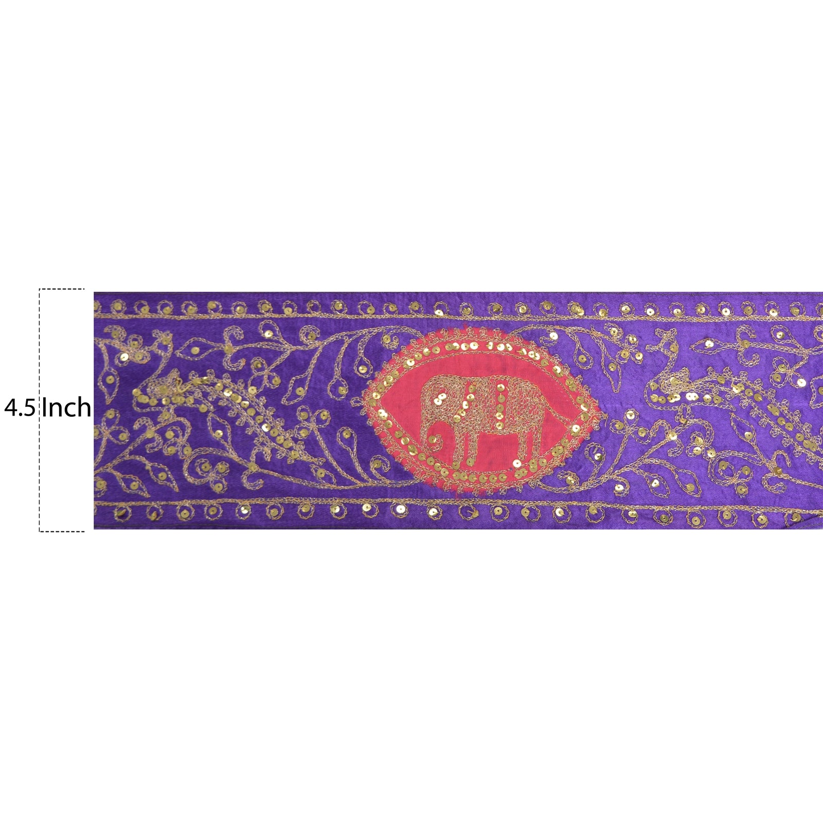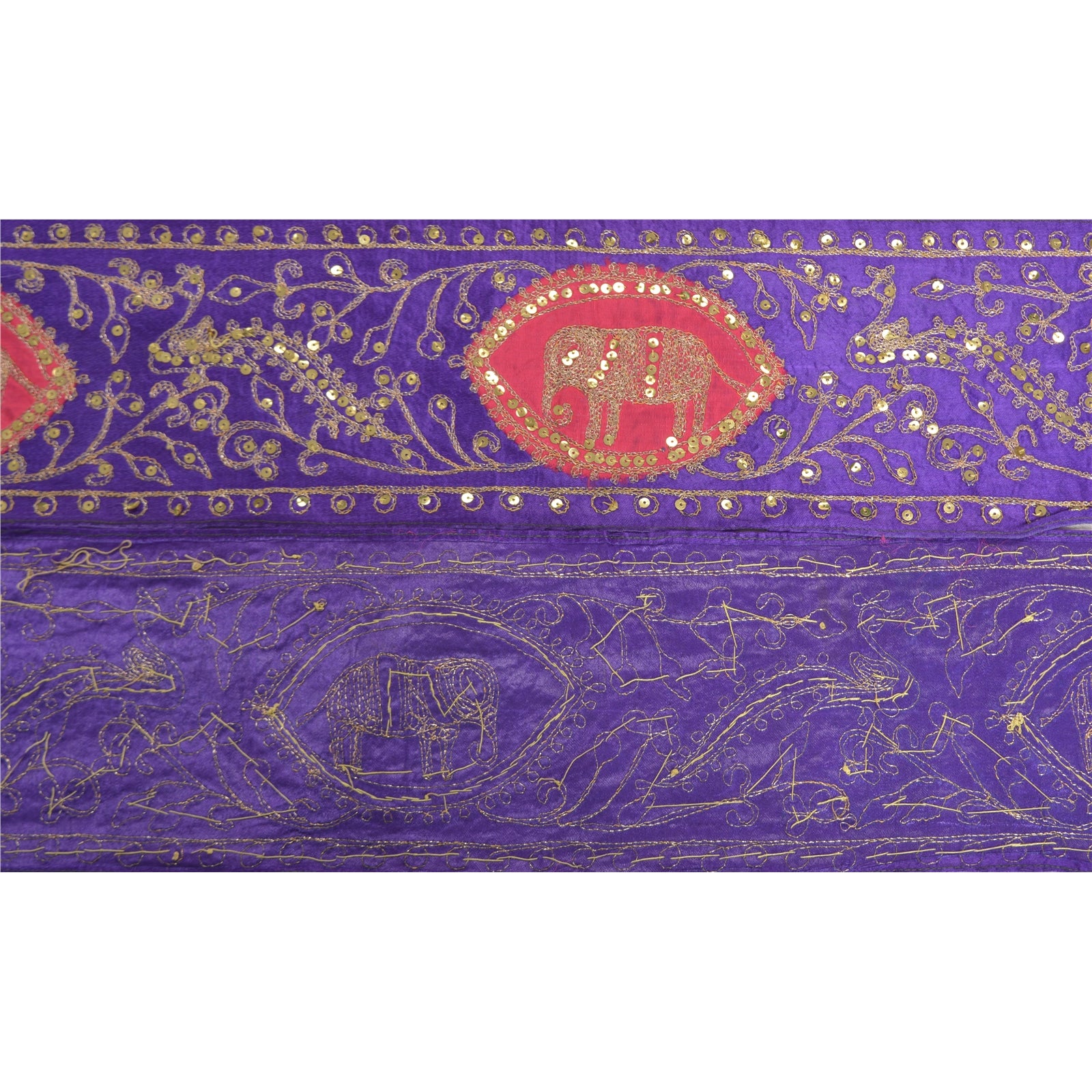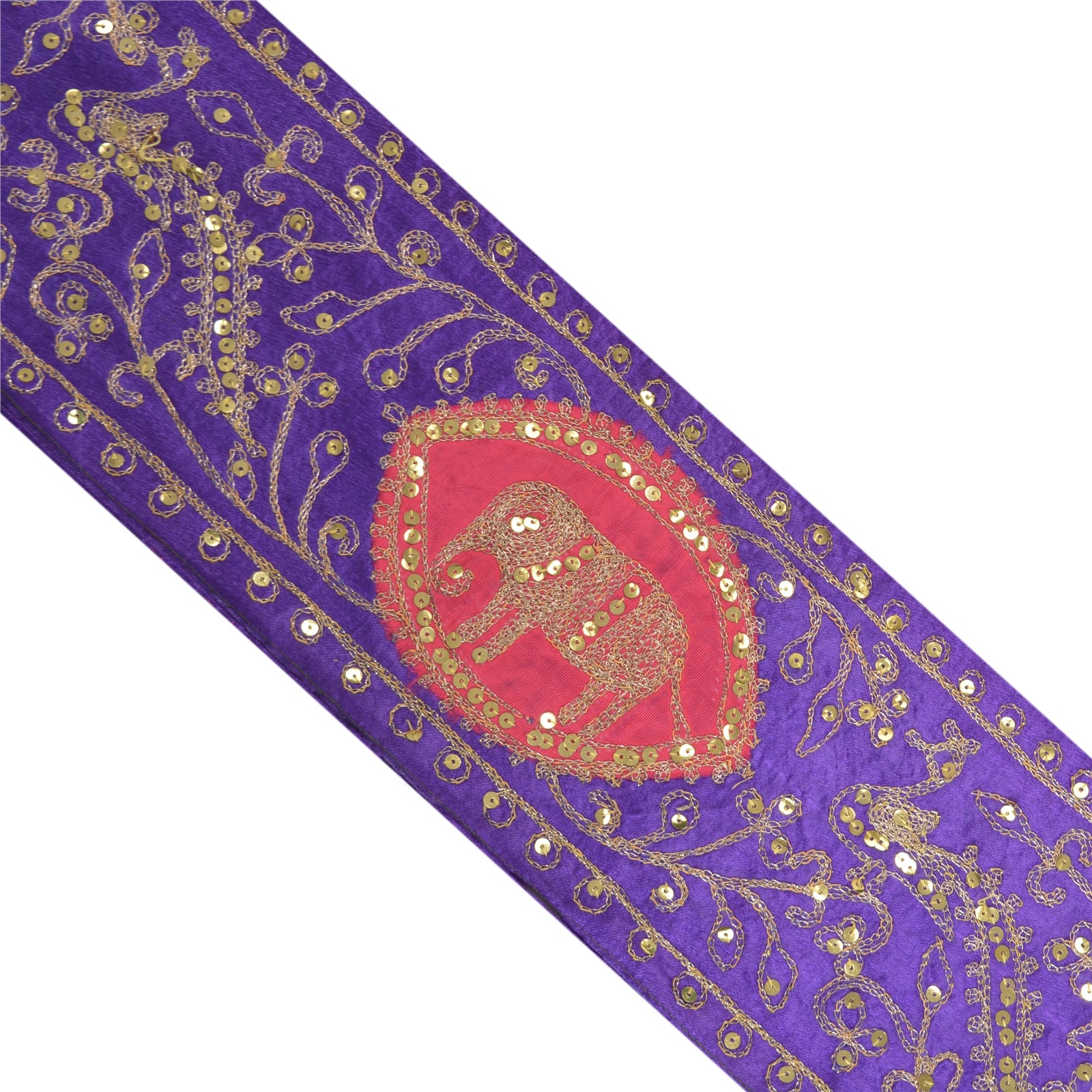 Beautiful 100% Pure Satin Silk Sari Border In Purple Color Highlighting Hand Embroidered work. Border has beautiful floral & elephant patterns painstakingly golden metallic zari work, golden sequins, pink Sustainable Fabric patch work. WOW!! an awesome one of a kind versatile border. 1 Quantity = 1 Yard