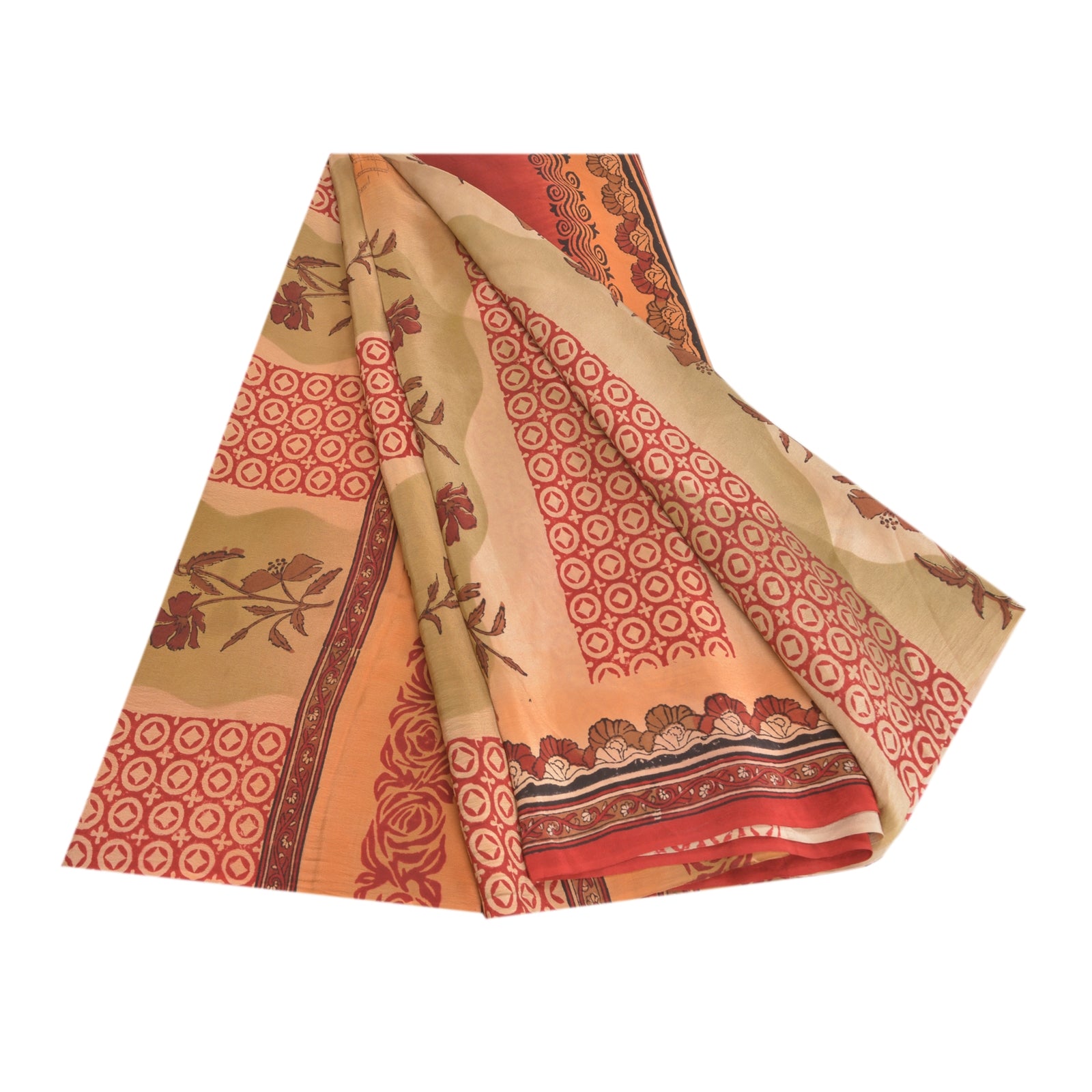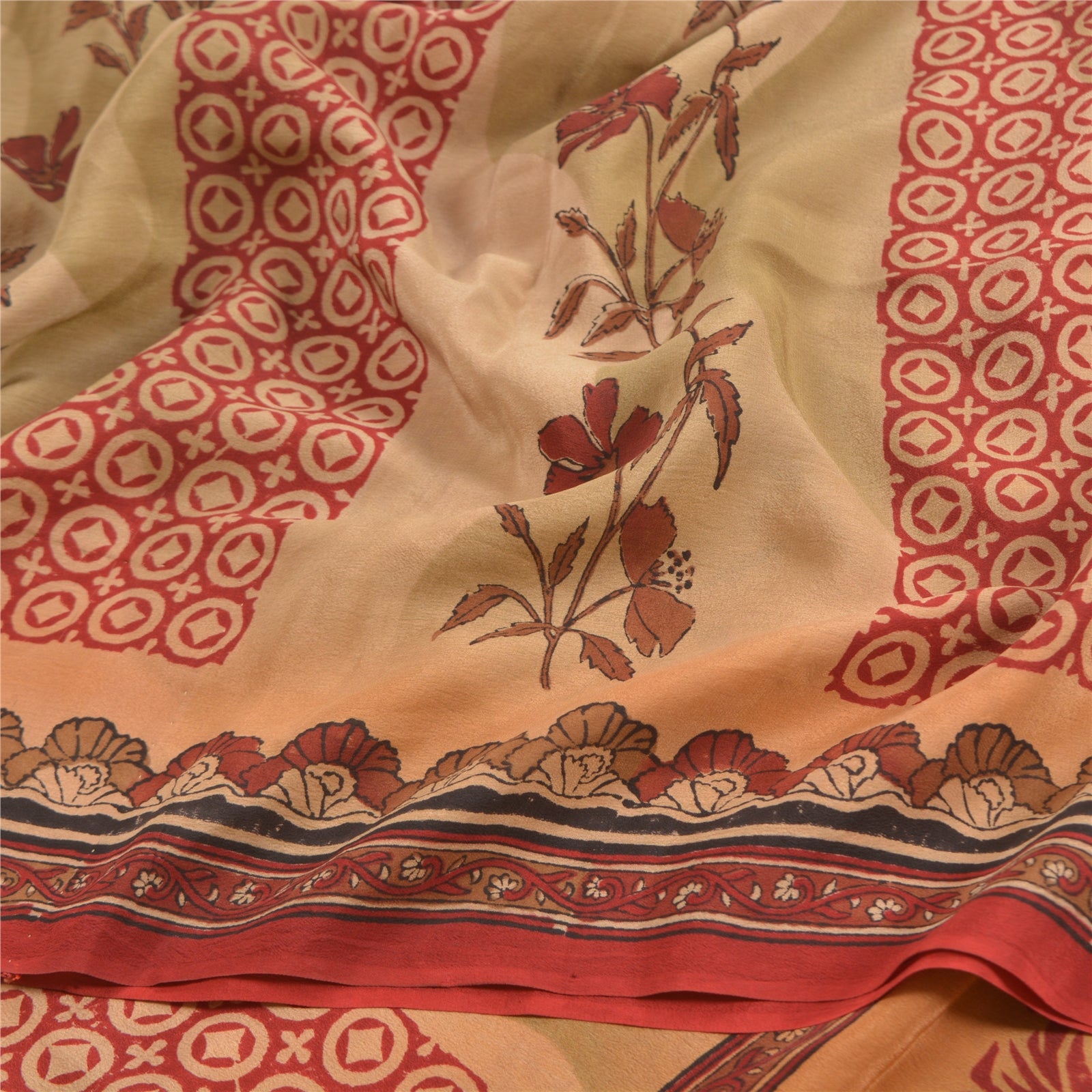 Sanskriti Vintage Beige Sarees Pure Crepe Silk Printed Sari Craft Sustainable Fabric