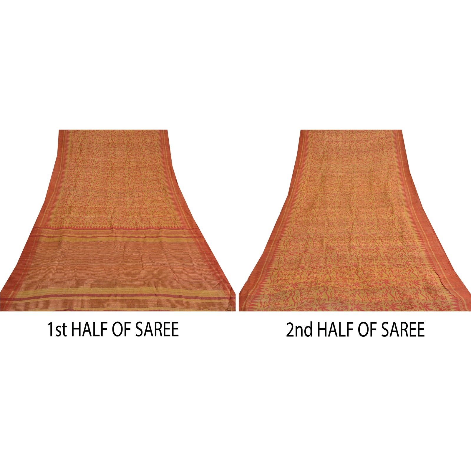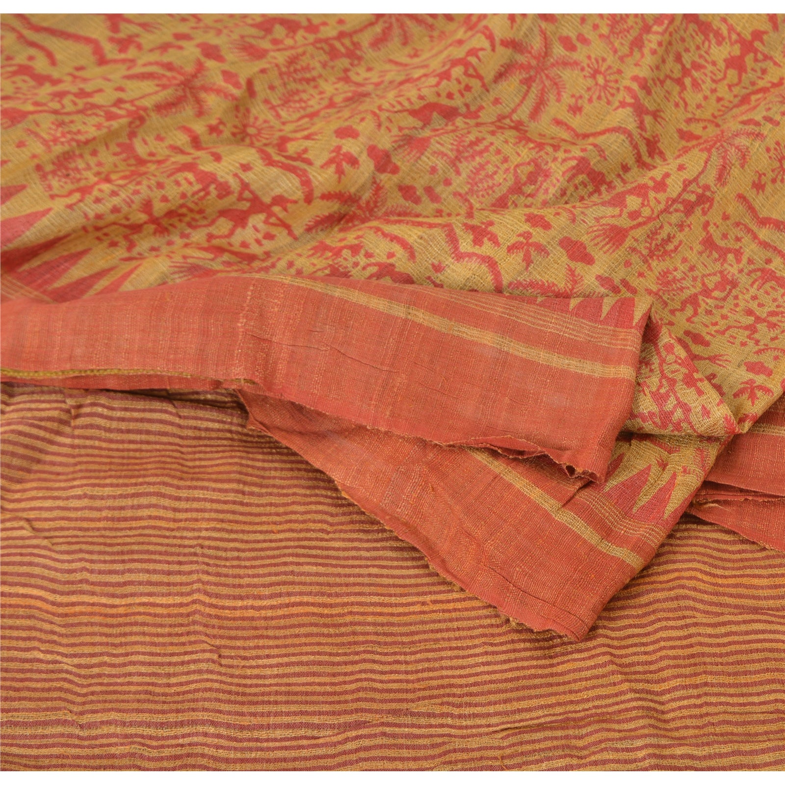 Sanskriti Vintage Beige Sarees Pure Handloom Silk Printed Sari 5yrd Craft Fabric