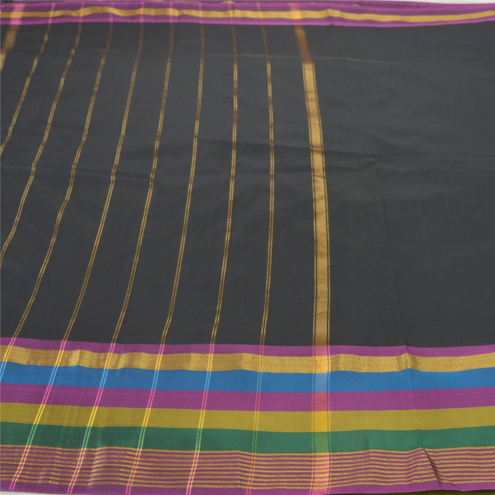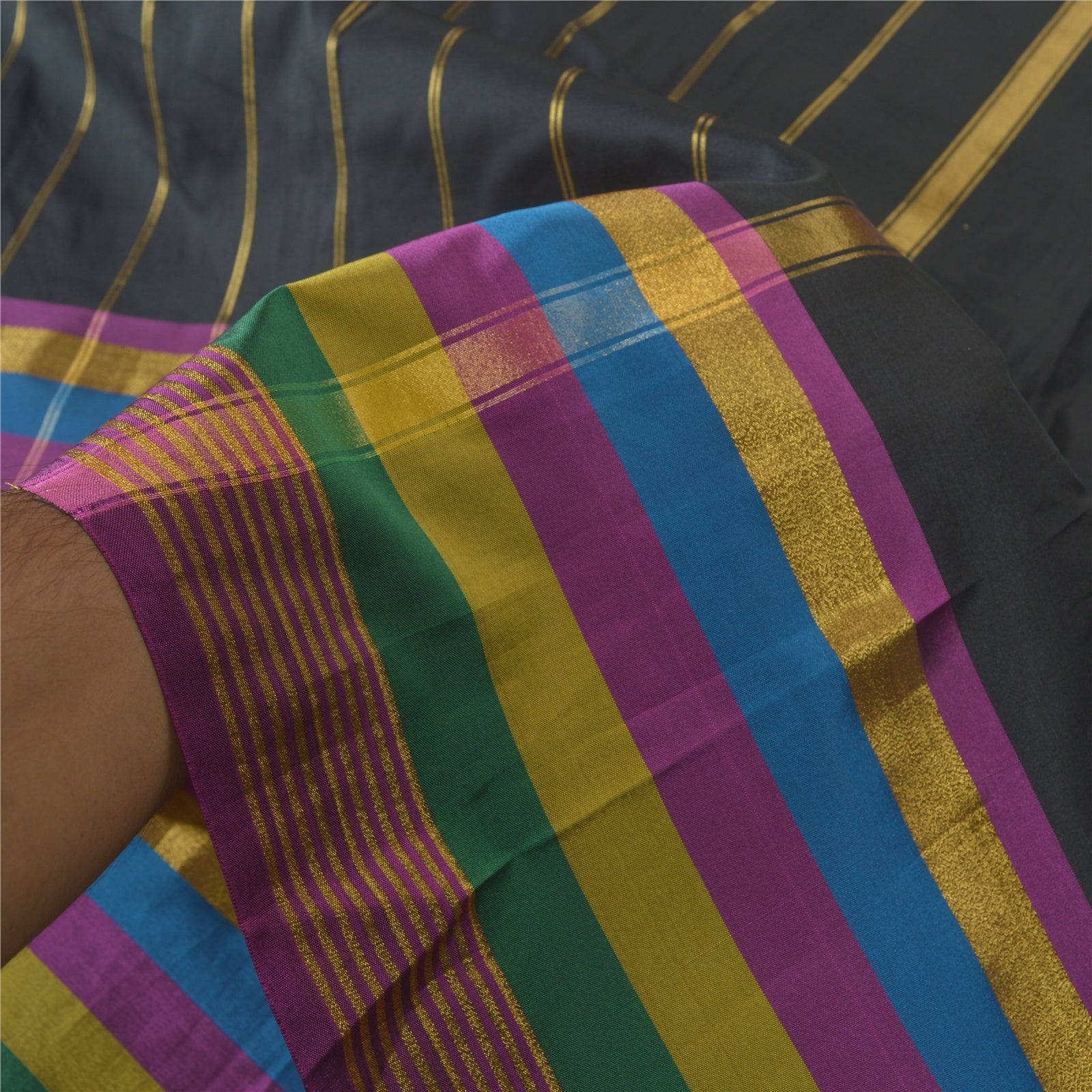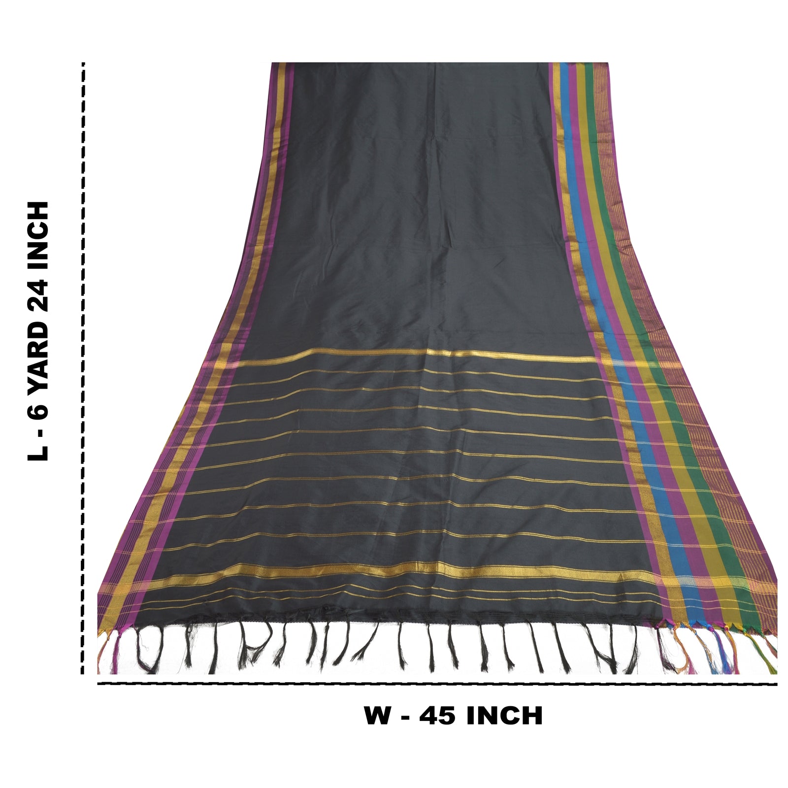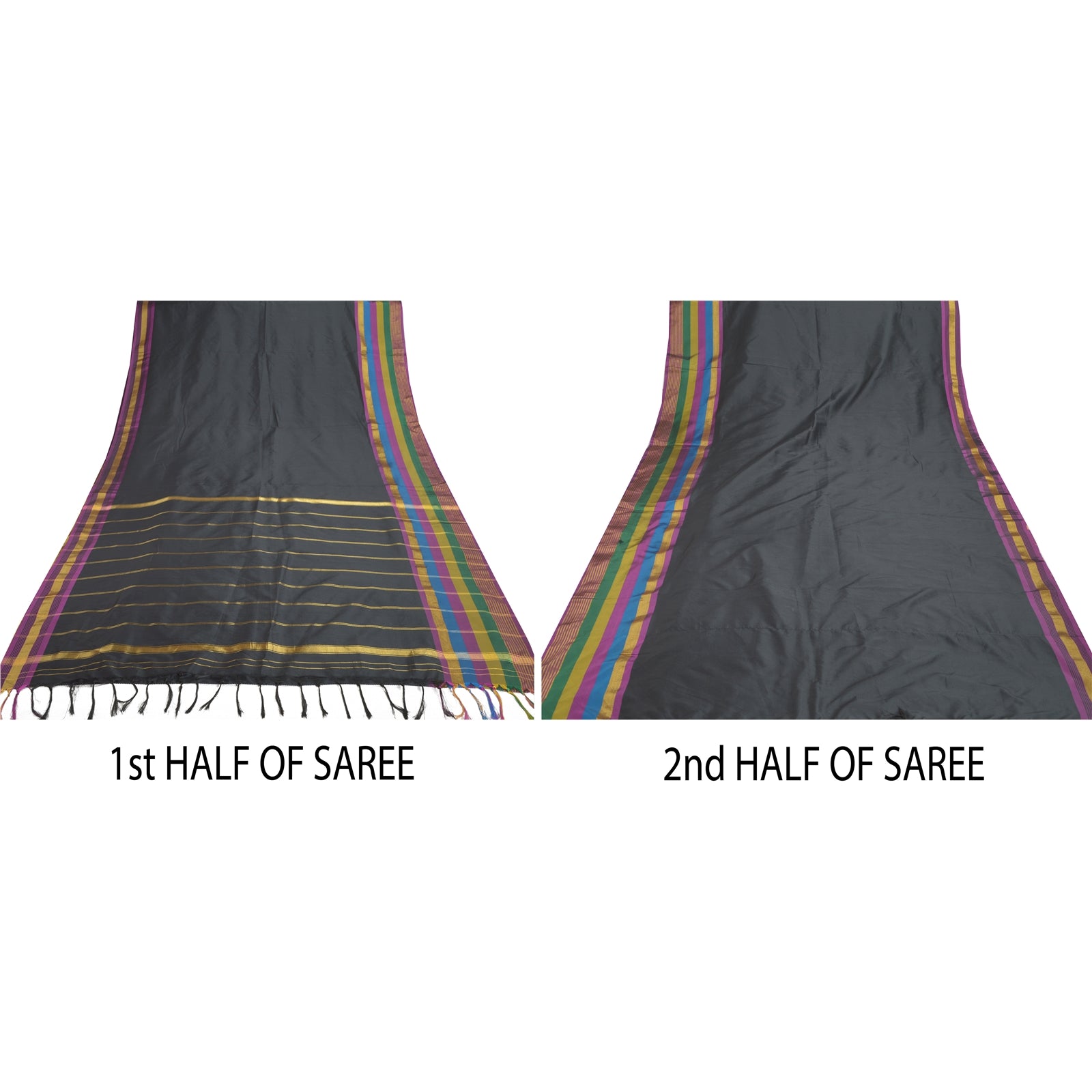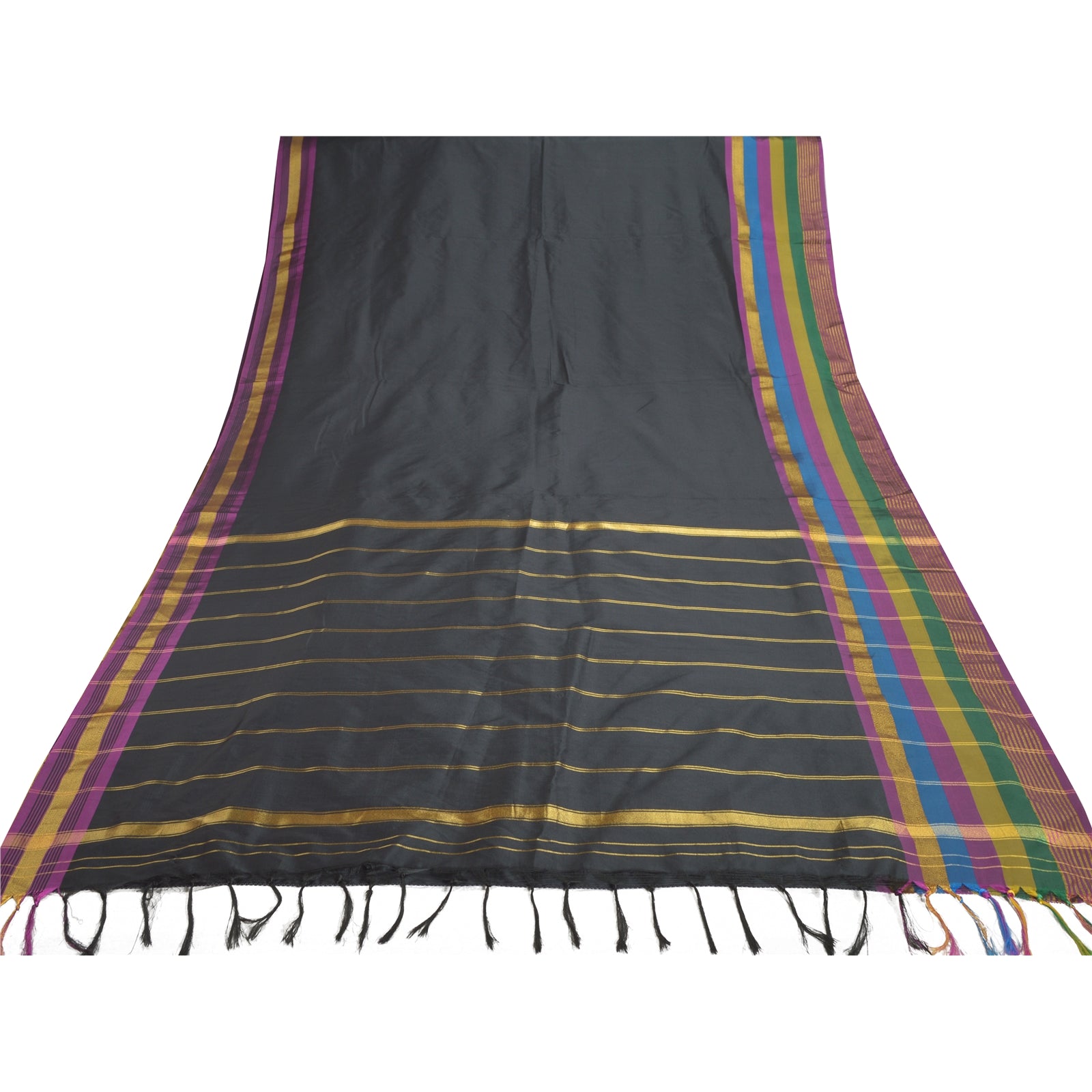 Beautiful Black Colored Art (Artificial) Silk Woven Sari. Pallu & Border of sari features is golden zari work & multi color woven work with stripes design. Black fringes on pallu. Solid black color in center part of saree. What is special about this saree? Shining golden zari work with nice pattern is really enhancing the beauty of the saree.