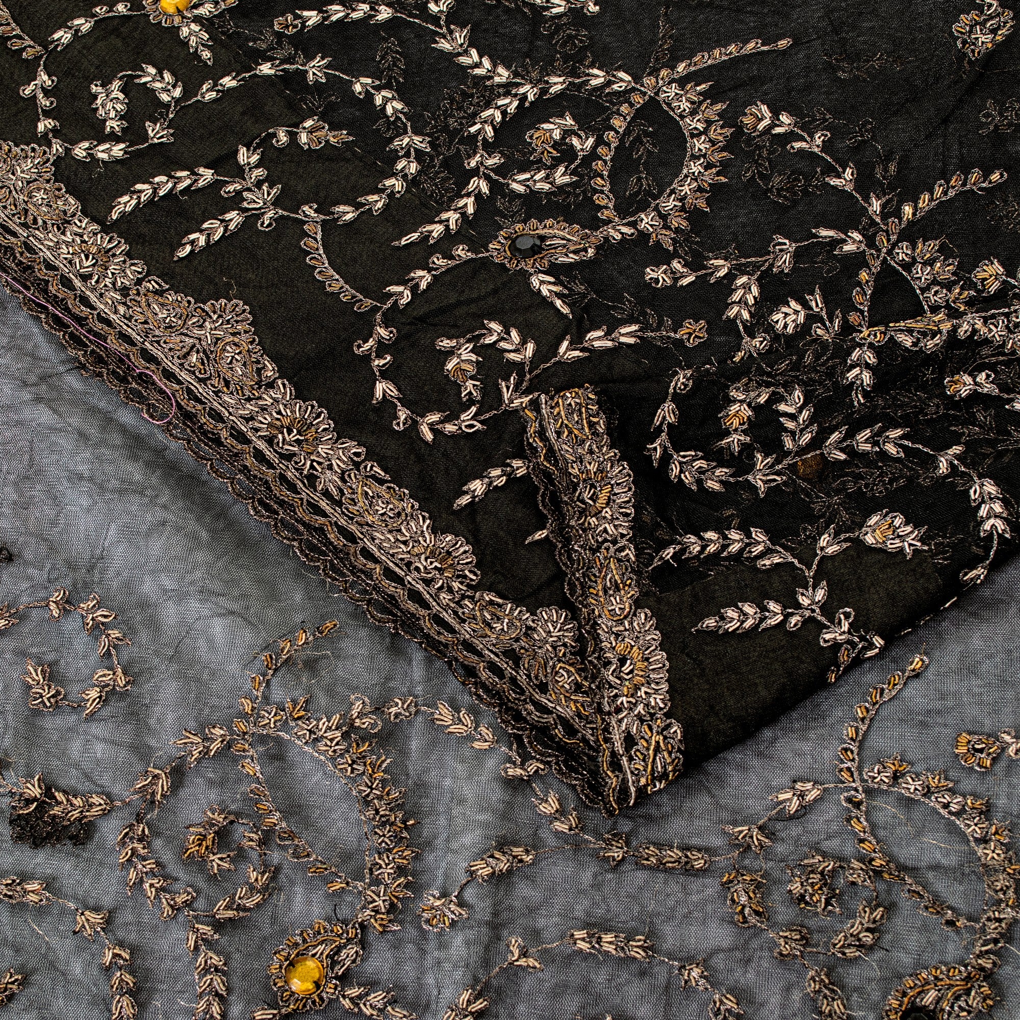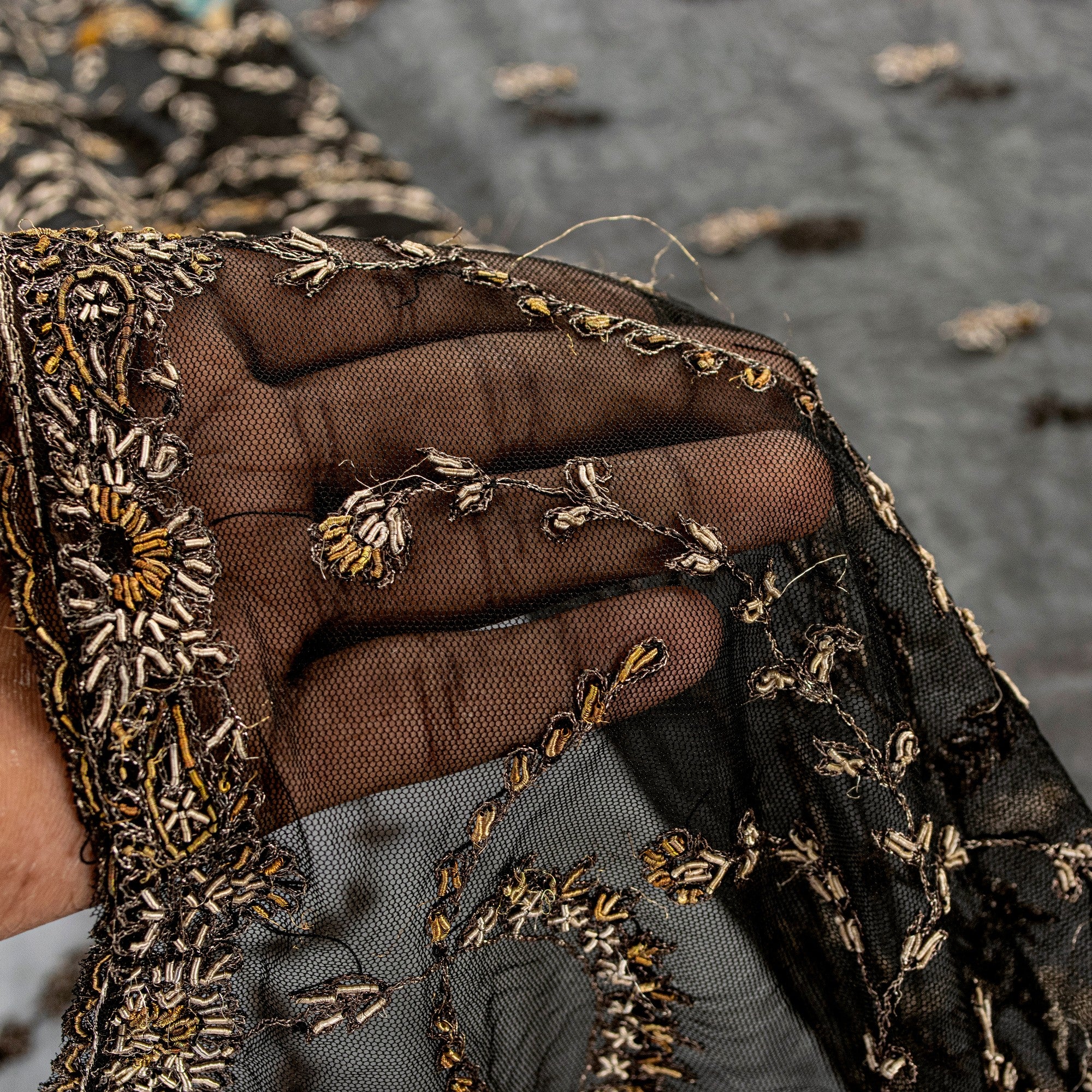 Sanskriti Vintage Black Net Mesh Saree Hand Embroidered Zardozi Zari 5+YD Fabric