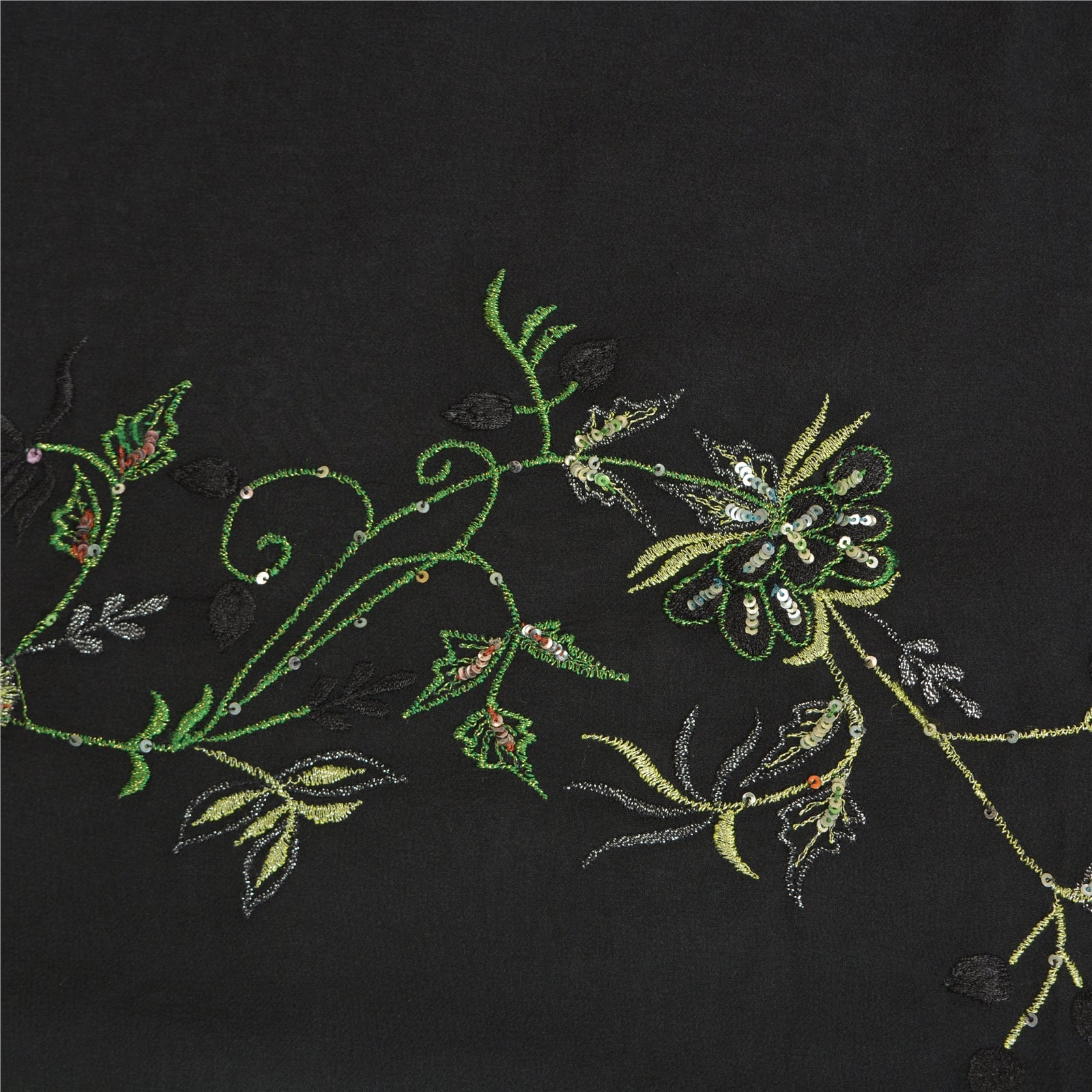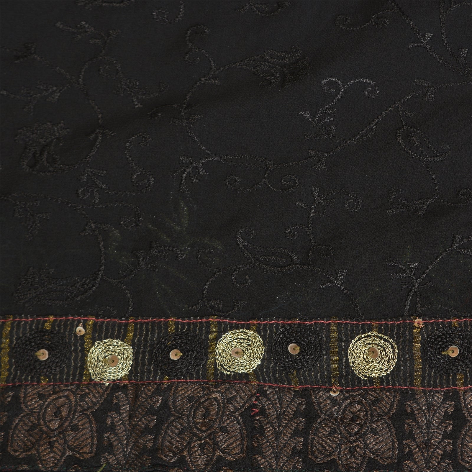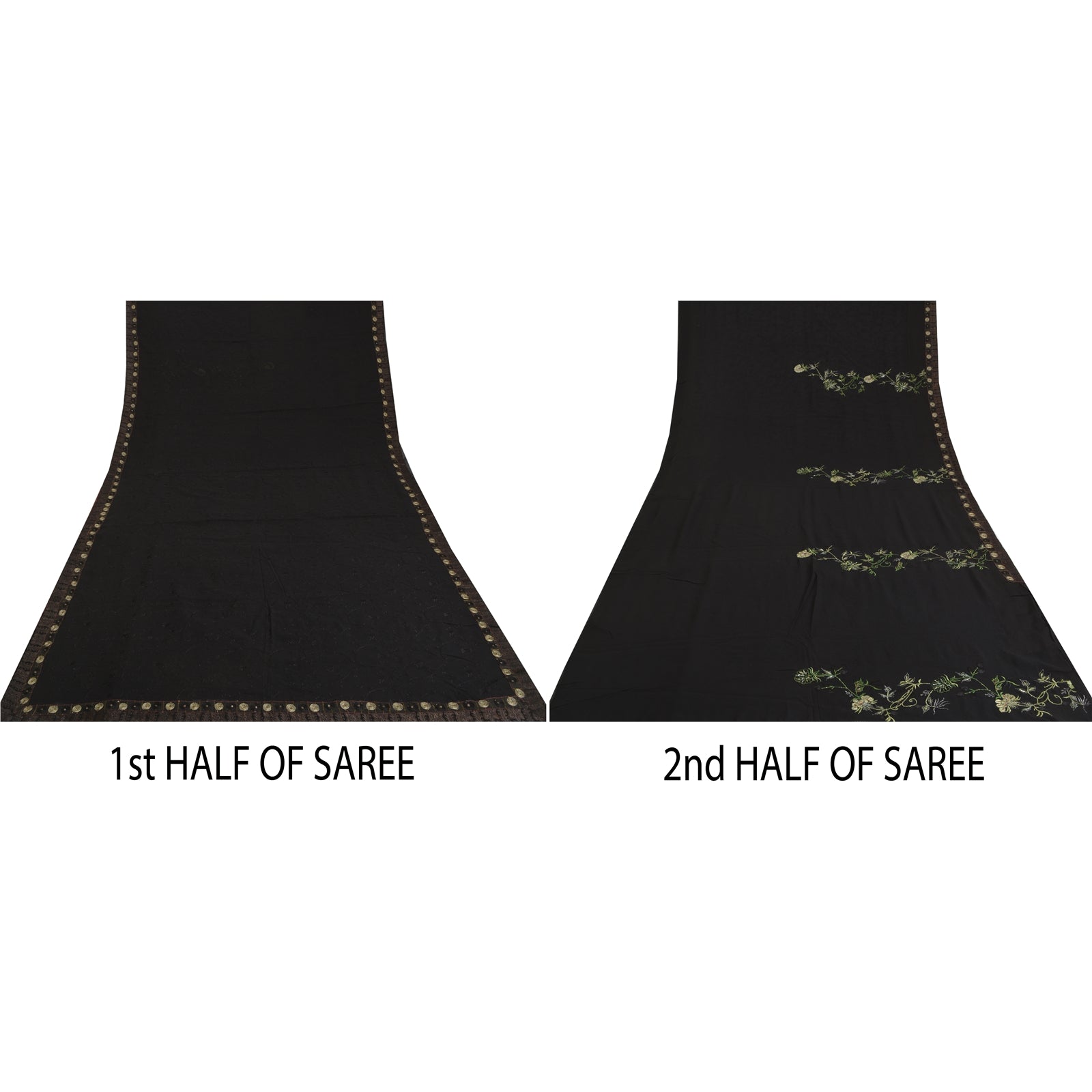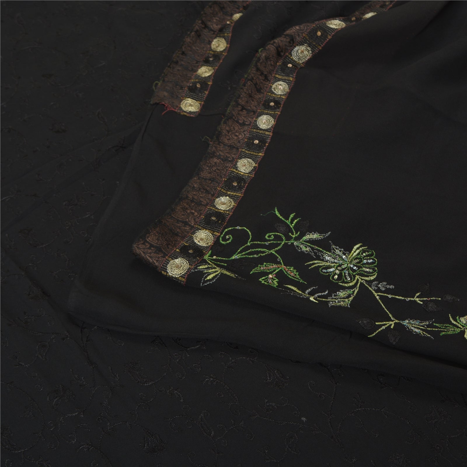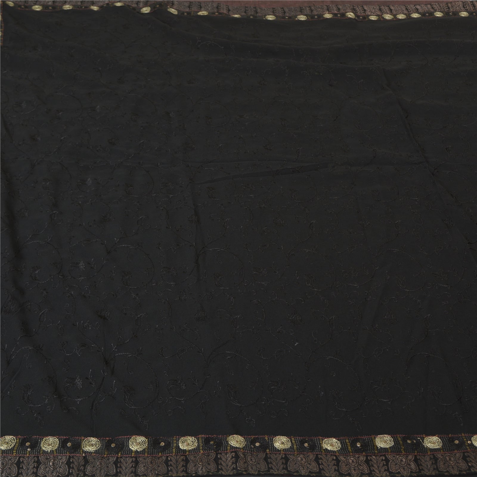 'THE ITEM COLOR OR SHADE MAY BE DARKER OR LIGHTER THAN THE PICTURE.' Beautiful black colored pure georgette silk embroidered sari/Sustainable Fabric. Border has woven Sustainable Fabric patch work with golden zari work. The center of the saree has black thread floral design. This saree can be used for various crafting ideas too. Use it for dress designing, as a throw, as window dressing, upholstery, table linen and much more. Let your creative juices flow. 'International buyers please note: Import duties, taxes, and charges are not included in the item price or postage cost. These charges are the buyer's responsibility. Please check with your country's customs office to determine what these additional costs will be prior to bidding or buying. Buyer will pay custom duty/tax. It is calculated and charged differently by every country. As a seller I do not have any control over it. VAT or sales tax is calculated by the platform at the time of checkout. Customs charge is payable at the time of delivery.'