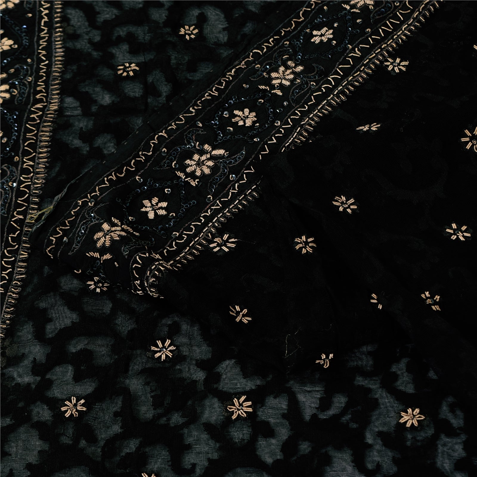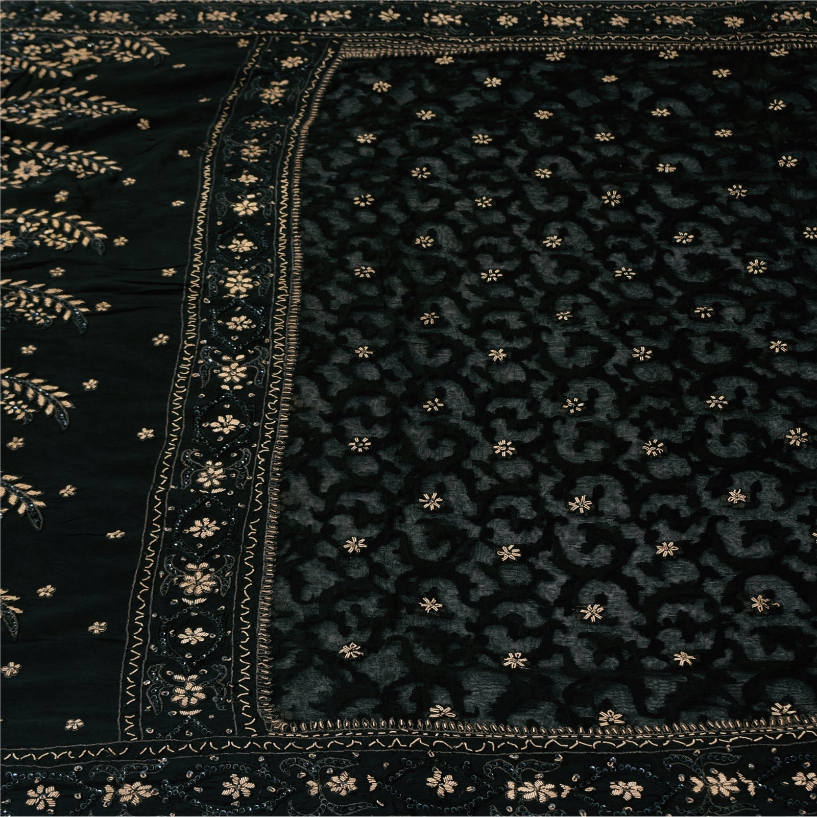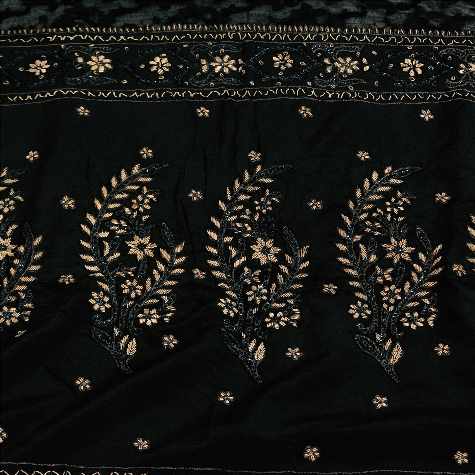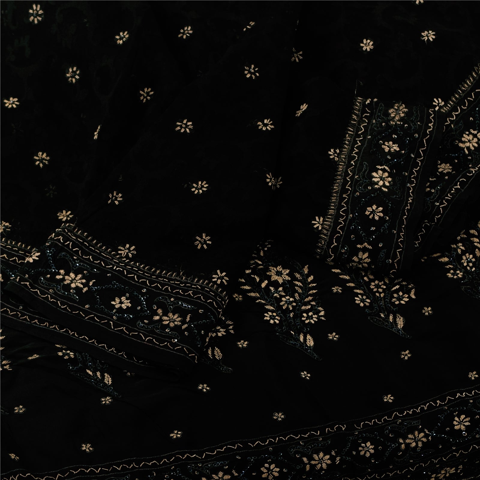 THE ITEM COLOR OR SHADE MAY BE DARKER OR LIGHTER THAN THE PICTURE.' An Awesome Sari In 100% Pure Silk Black Colored Hand Embroidered Sari/Fabric. Pallu & Border Features floral design embellished with golden zardozi work, silver sequins work & black thread work. You Can See Center Portion Of The Sari Has Similar Thread Work With Floral Design This unique vintage saree can be used for various crafting ideas for example design a dress, use it as a throw, as window dressing, upholstery, table linen and much more. Let your creative juices flow and use this decorated fabric in multiple fashion Shipping note: International buyers please note: Import duties, taxes, and charges are not included in the item price or postage cost. These charges are the buyer's responsibility. Please check with your country's customs office to determine what these additional costs will be prior to bidding or buying. Buyer will pay custom duty/tax. It is calculated and charged differently by every country. As a seller I do not have any control over it. VAT or sales tax is calculated by the platform at the time of checkout. Customs charge is payable at the time of delivery. SKU: HS-7168