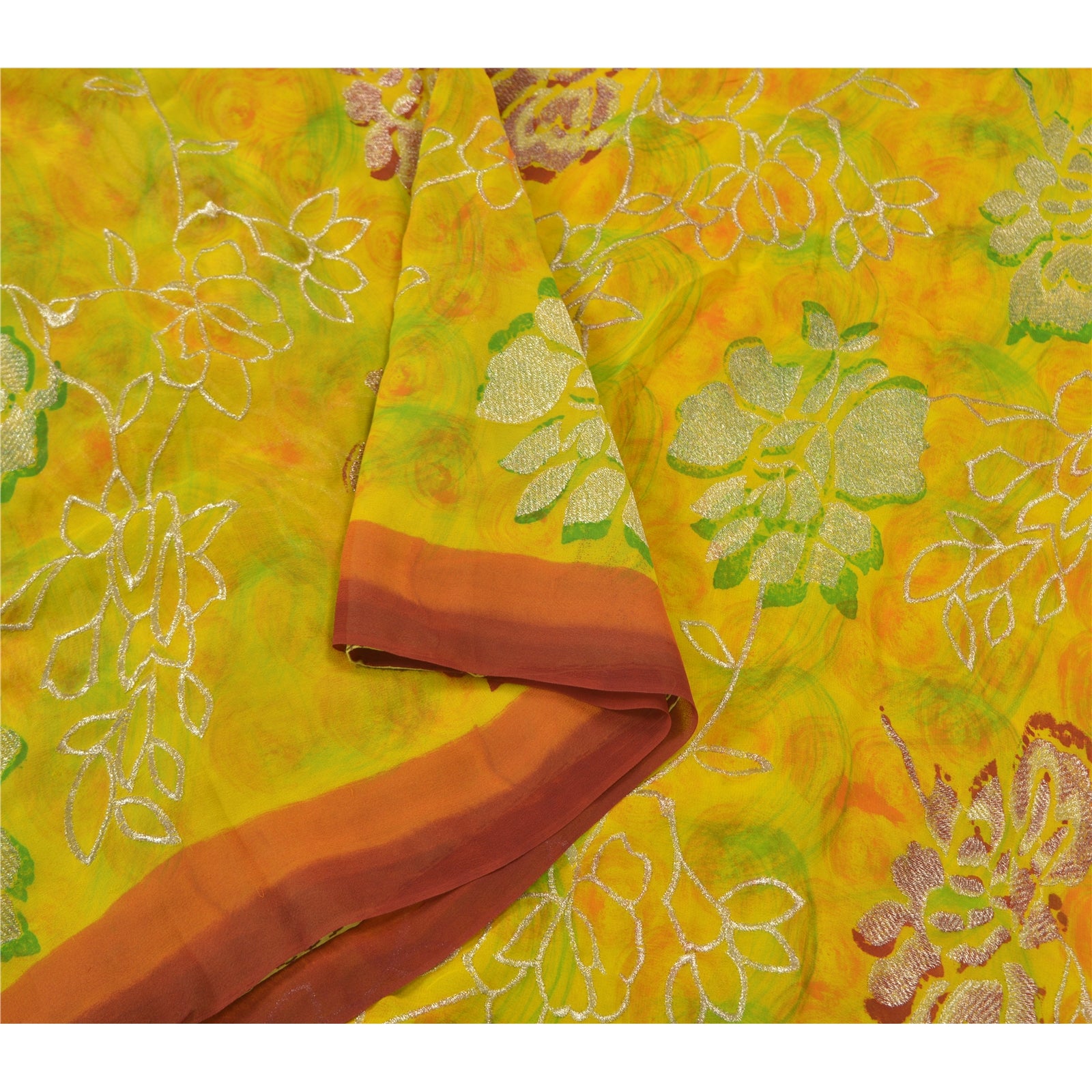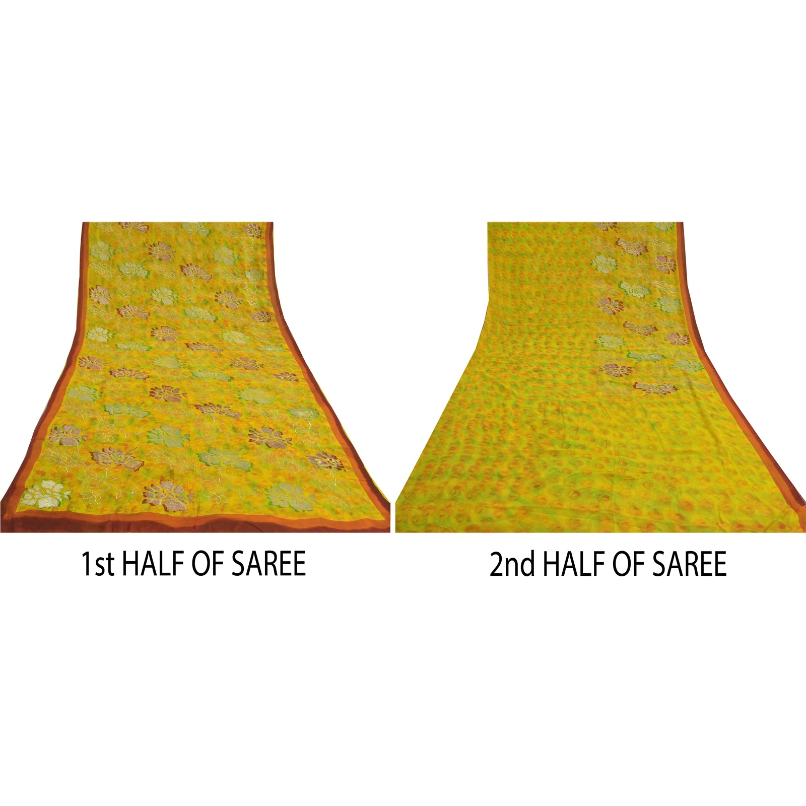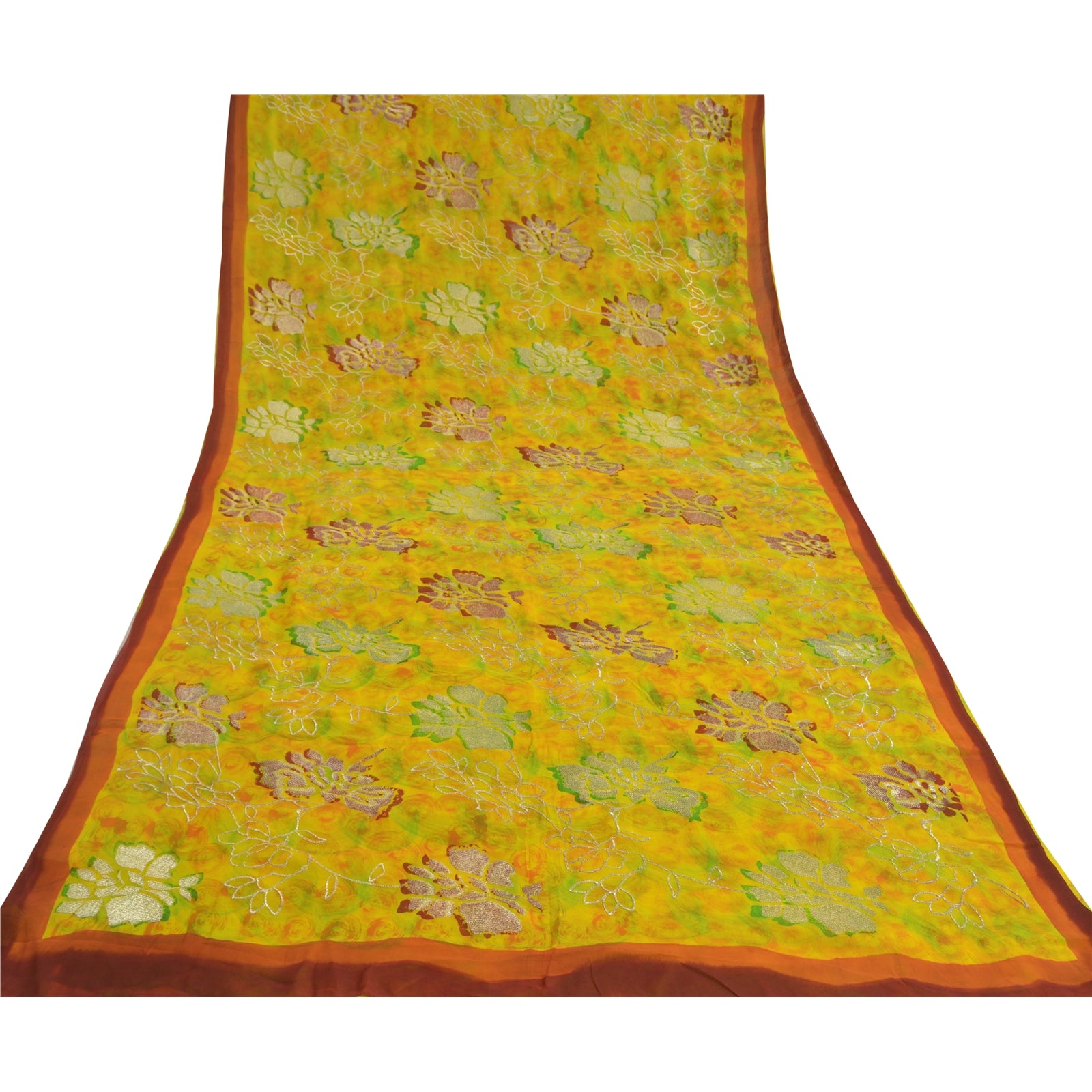 Beautiful shade of green colored 100% pure georgette silk embroidered printed sari. All over sari has printed floral design embellished with golden thread work. This saree can be used for various crafting ideas too. Use it for dress designing, as a throw, as window dressing, upholstery, table linen and much more. Let your creative juices flow.