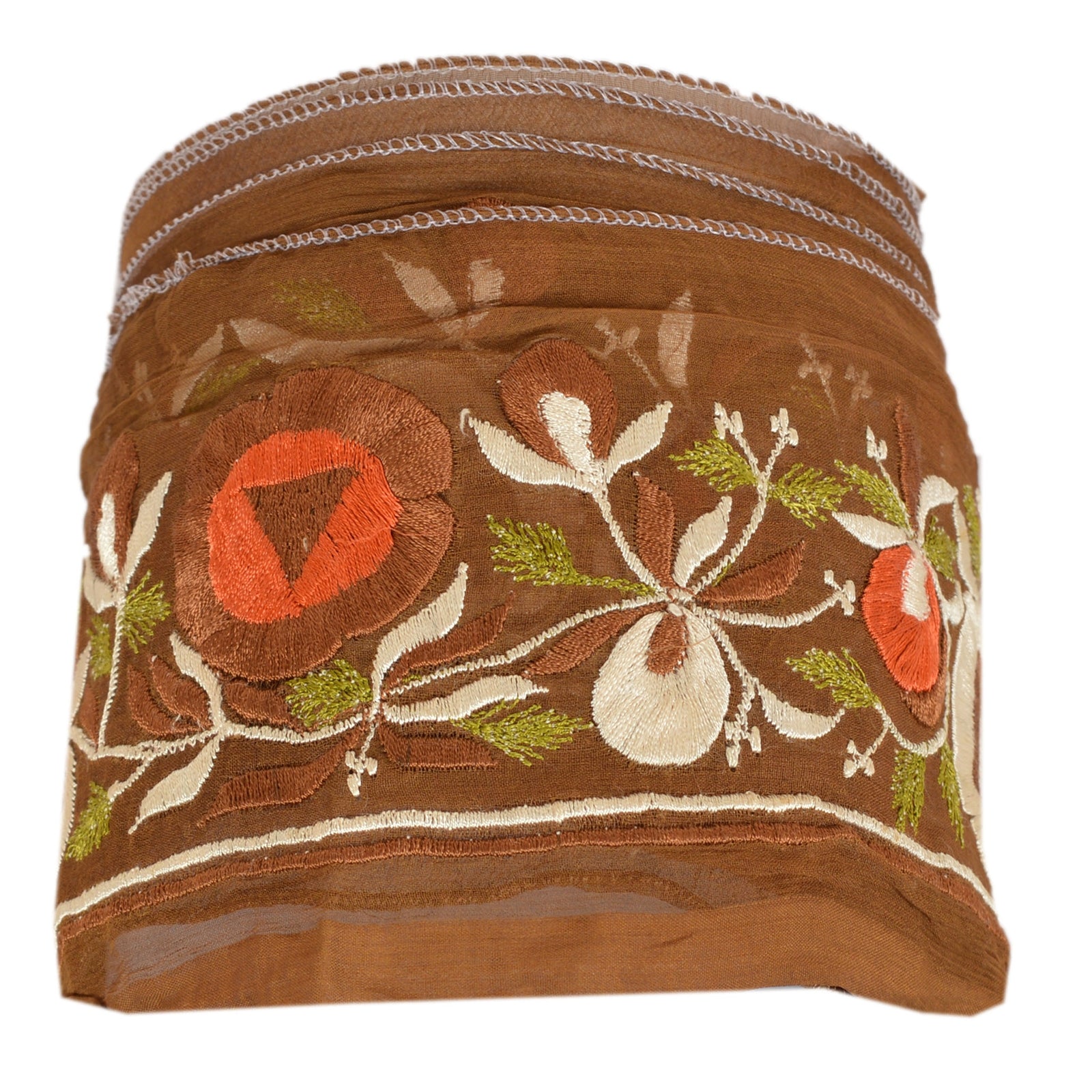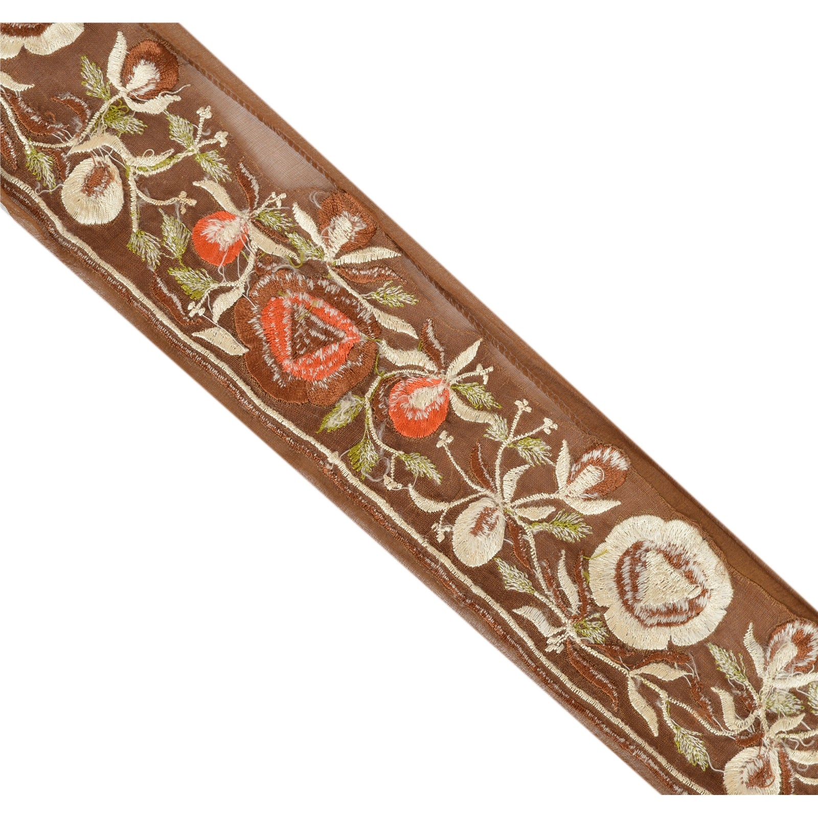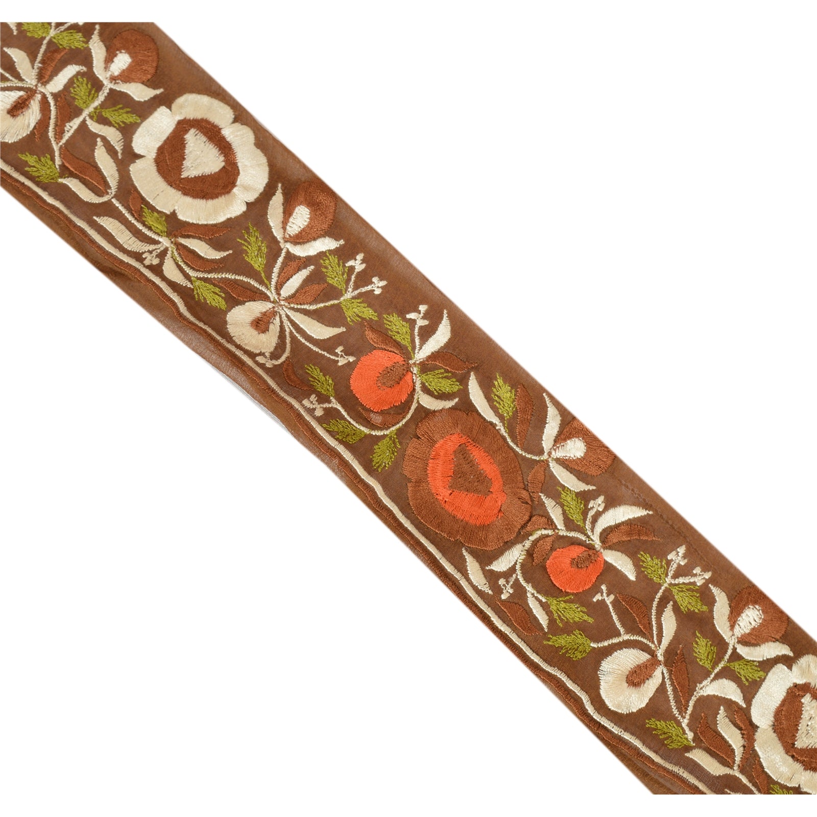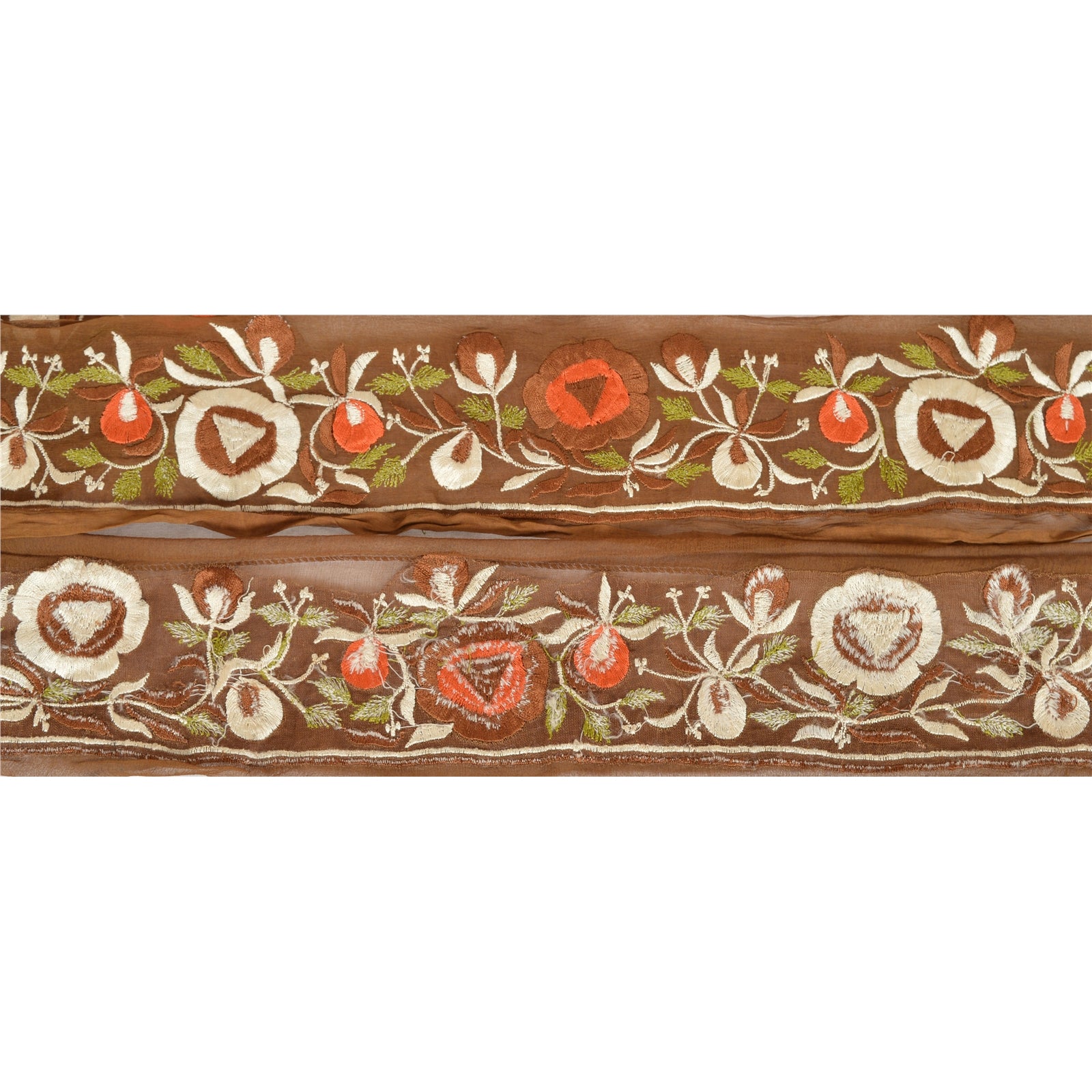 Amazing chiffon silk embroidered sari border in green color highlighting zardozi work. Border has beautiful floral patterns painstakingly embroidered with white/brown/orange/green thread work. WOW!! an awesome one of a kind versatile border. 1 Quantity = 1 Yard