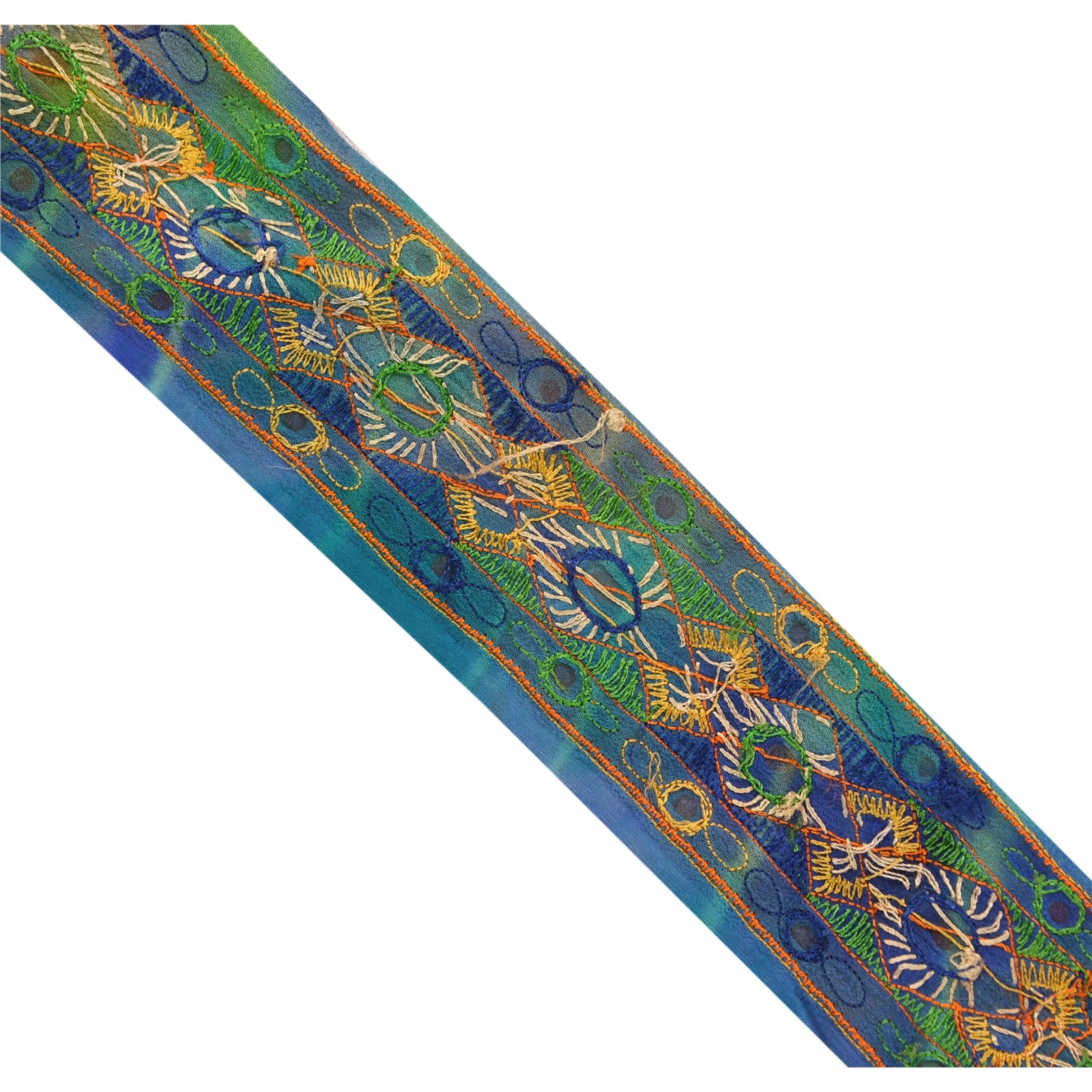 Gorgeous georgette hand embroidered sari border in blue color highlighting mirror work. Border has beautiful floral patterns painstakingly embroidered with mirror work. Further you can see fine detailing with green, blue, saffron, cream thread work, saffron Sustainable Fabric patch work. WOW!! an awesome one of a kind versatile border. 1 Quantity = 1 Yard