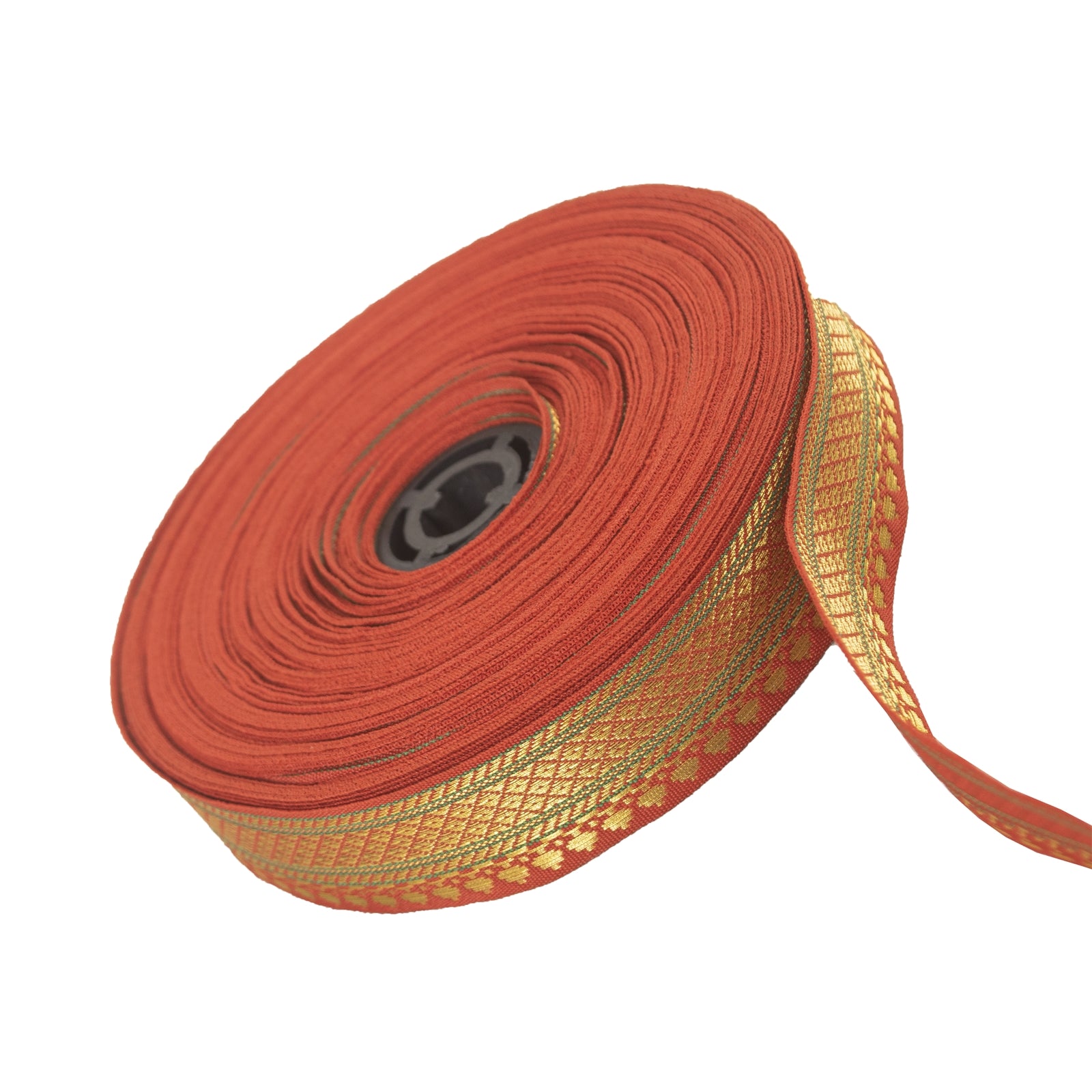 Beautiful art silk woven border with gold, green weaving work design along with floral design on red base fabric. 1 Quantity = 1 Yard B-5886