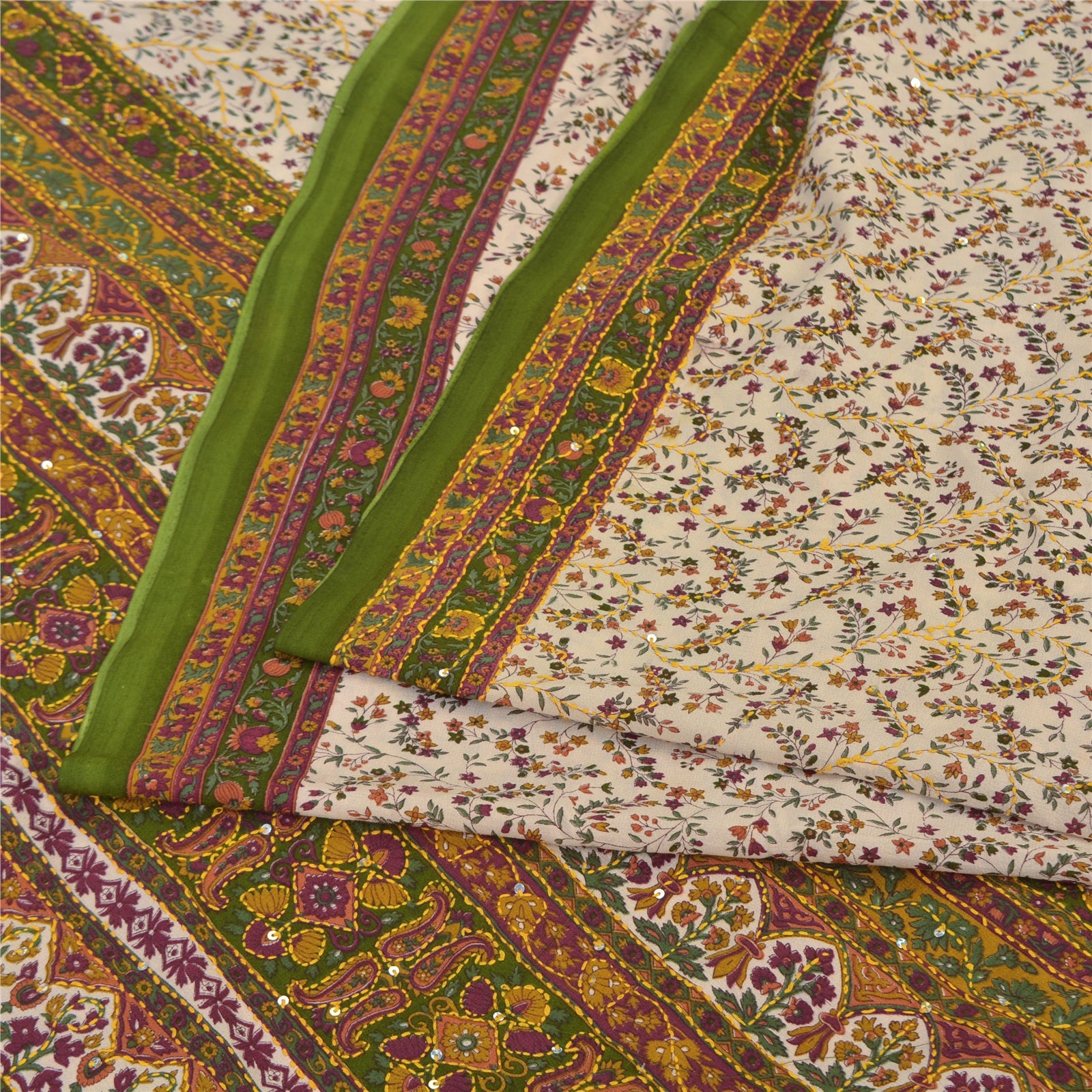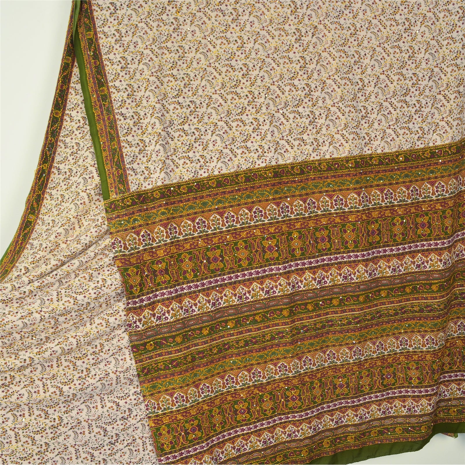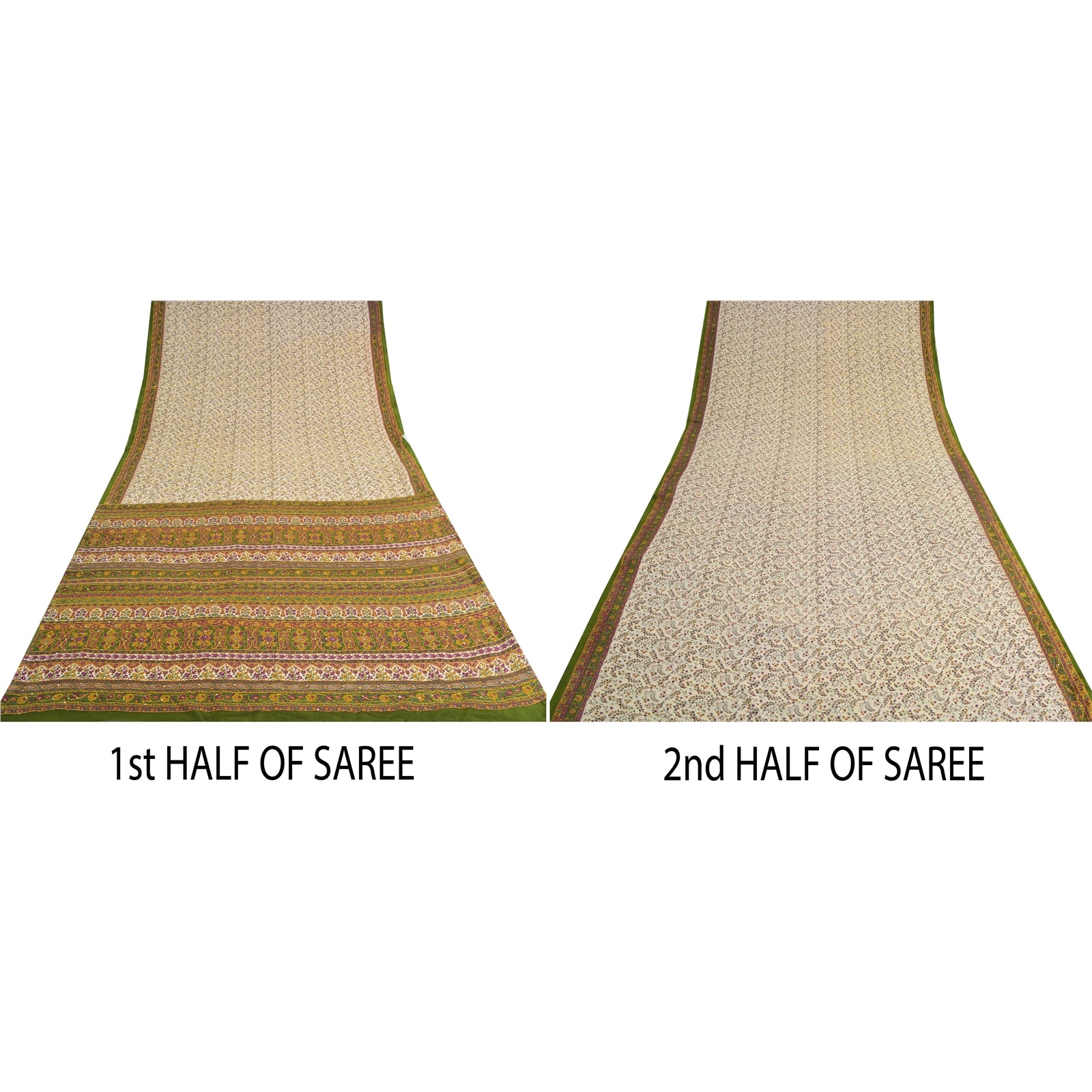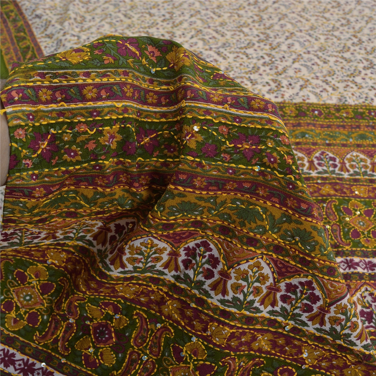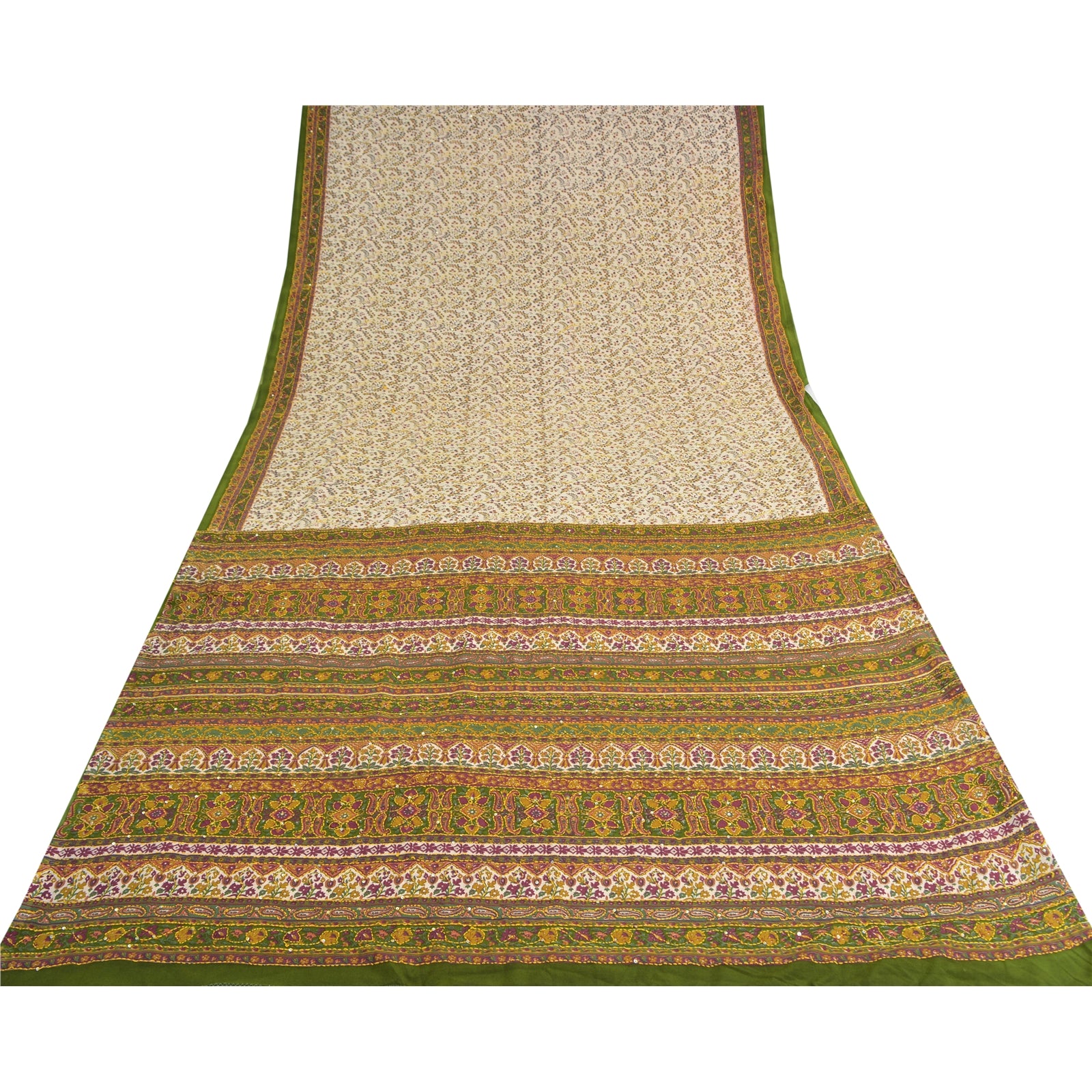 Sanskriti Vintage Cream/Green Indian Sarees Crepe Hand Beaded Kantha Sari Sustainable Fabric