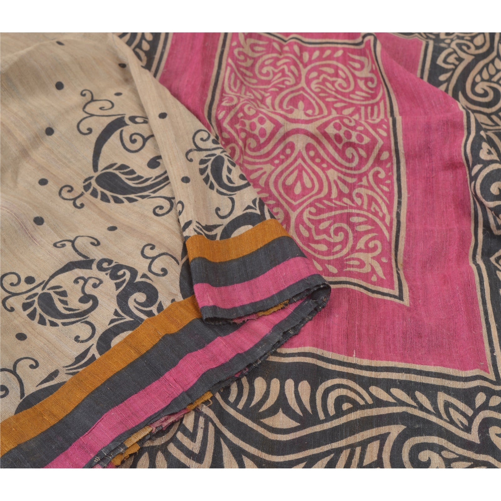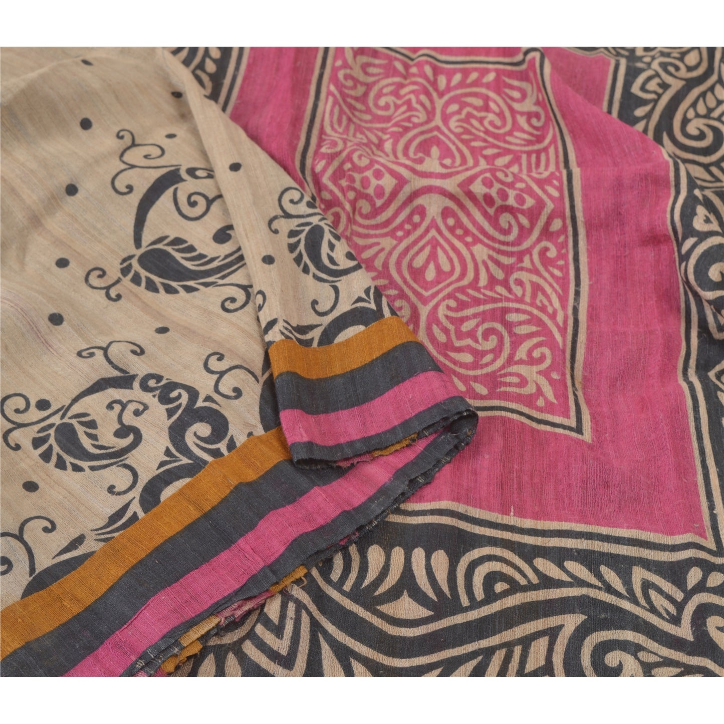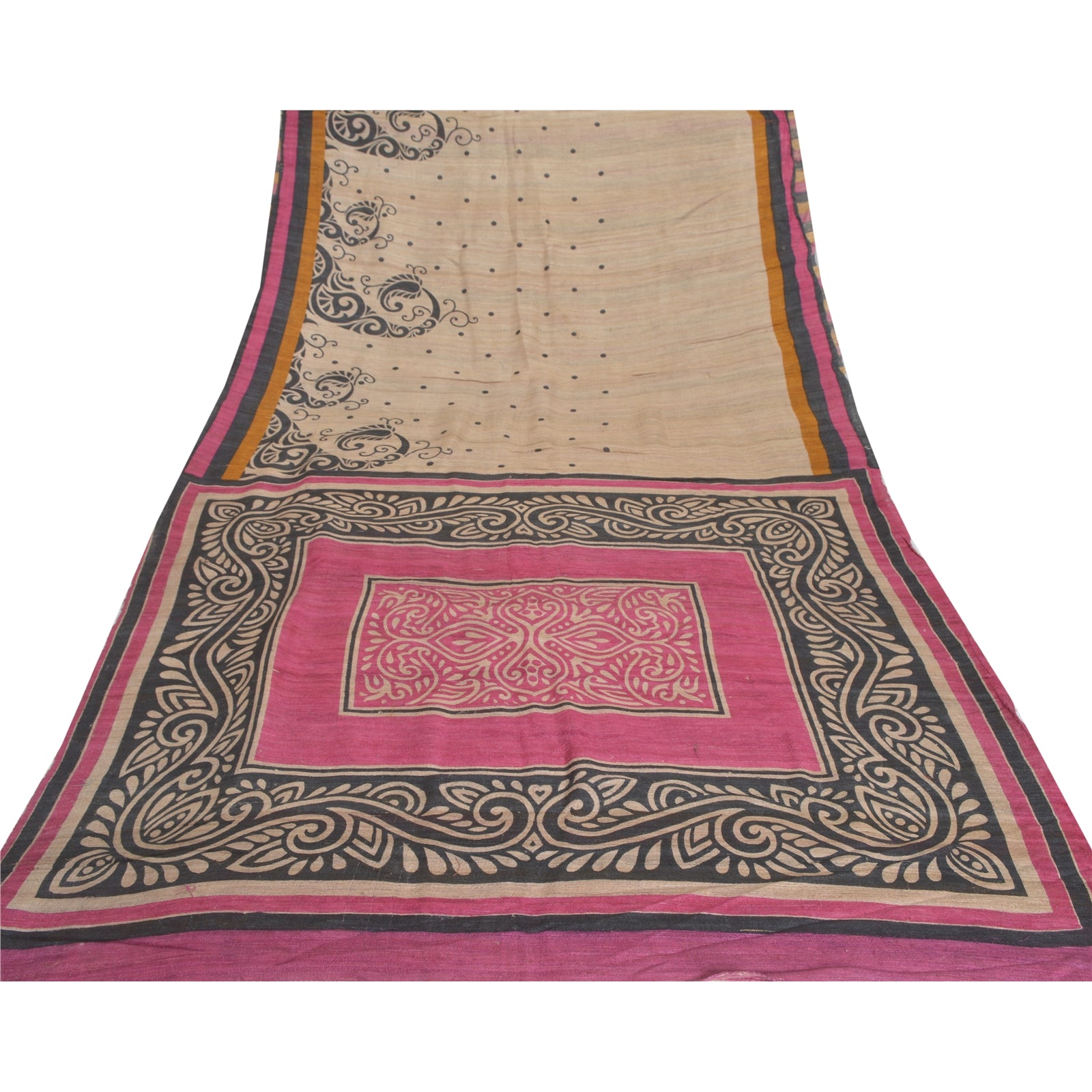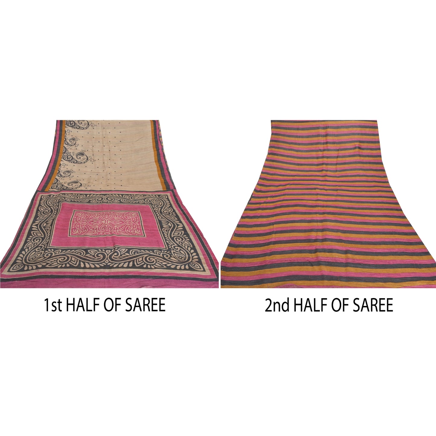 Sanskriti Vintage Cream Indian Sari Pure Handloom Silk Printed Sarees Sustainable Fabric