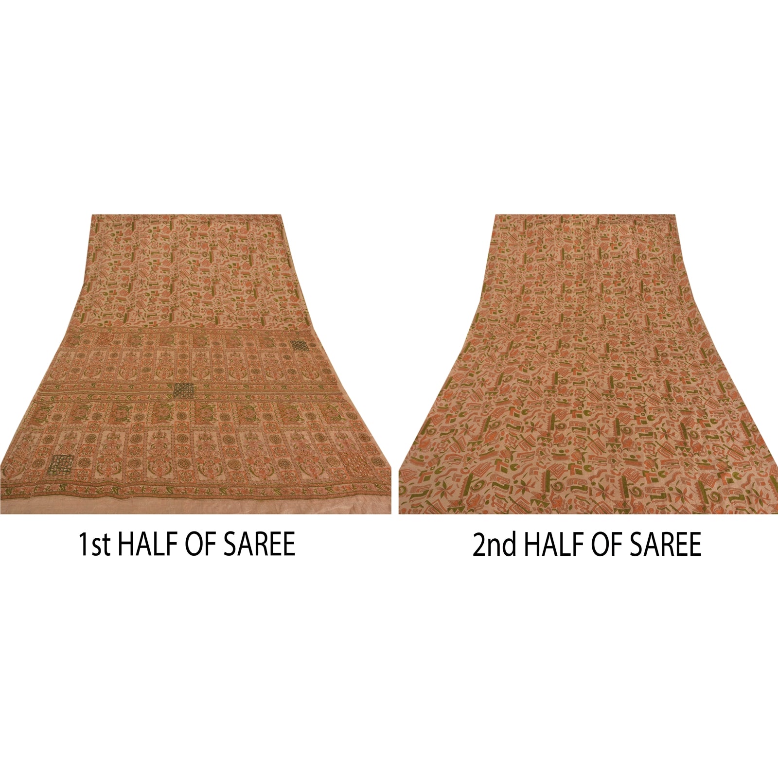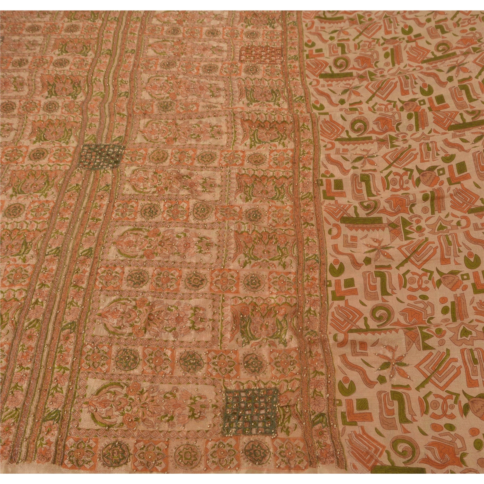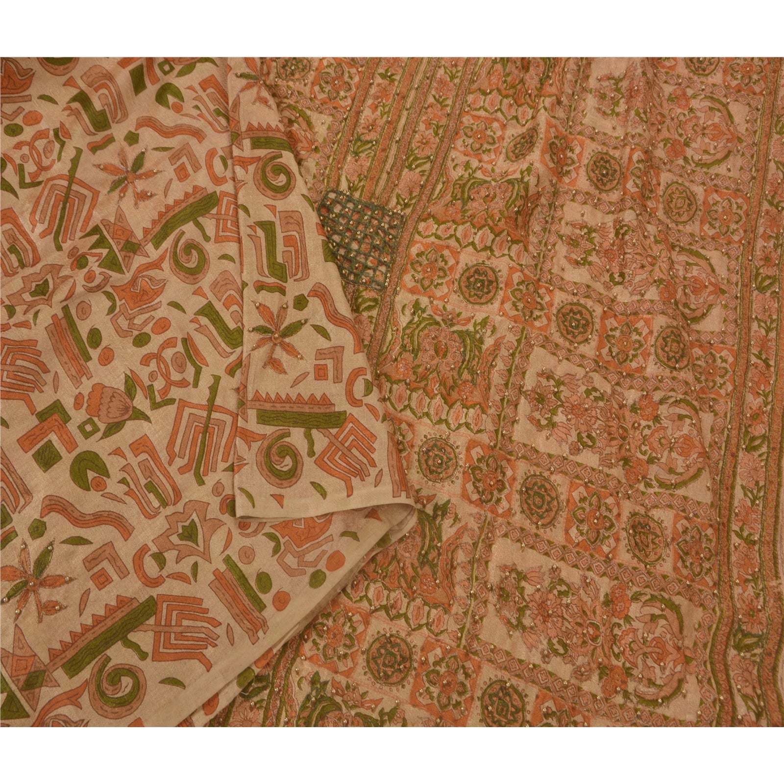 Sanskriti Vintage Cream Sarees Art Silk Hand Beaded Printed Fabric Sari Craft