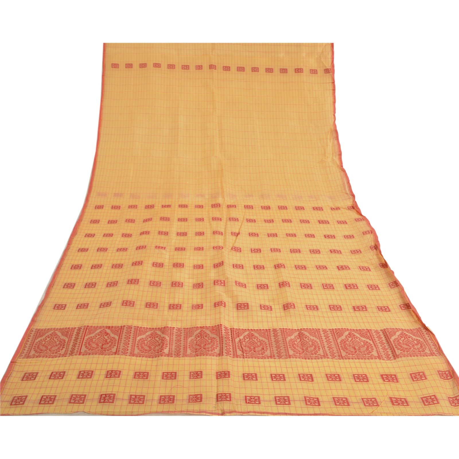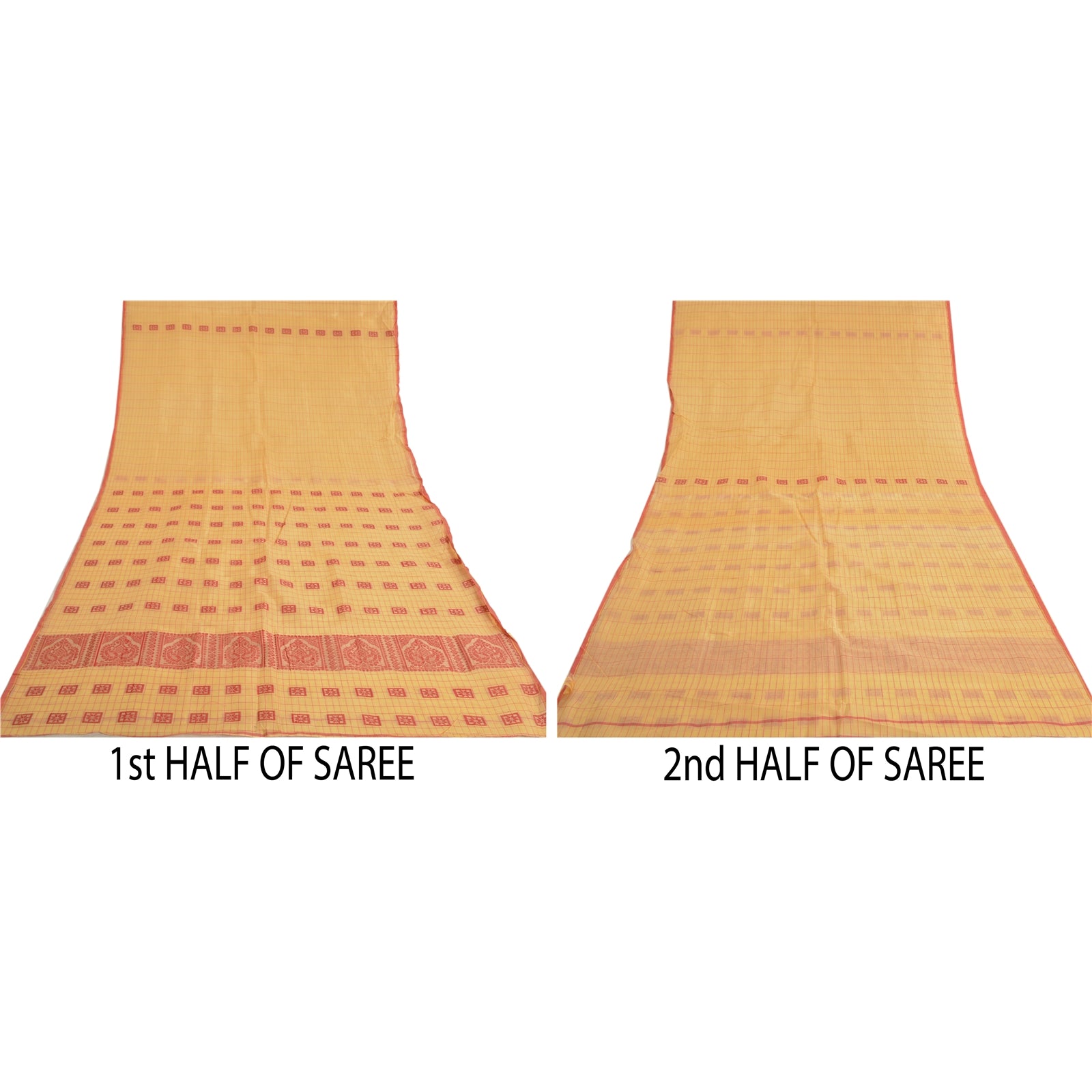 Beautiful shade of cream colored blend silk hand-woven sari. Pallu & Border has floral & paisley design with red hand-woven thread work. The center of the saree has similar woven work with floral & grid pattern. This saree can be used for various crafting ideas too. Use it for dress designing, as a throw, as window dressing, upholstery, table linen and much more. Let your creative juices flow.