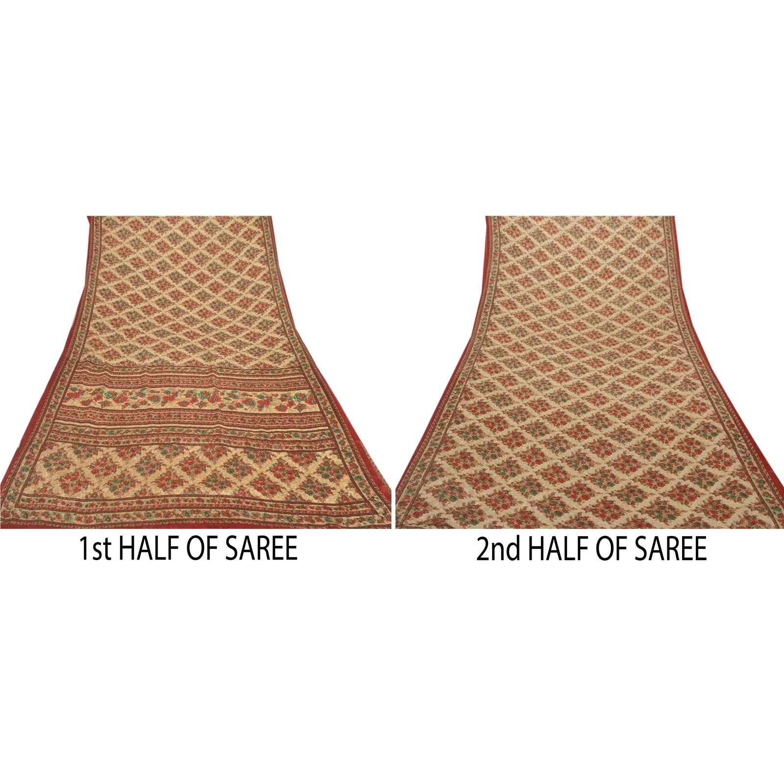Sanskriti Vintage Cream Sarees Moss Crepe Floral Printed Sari 5 YD Craft Fabric