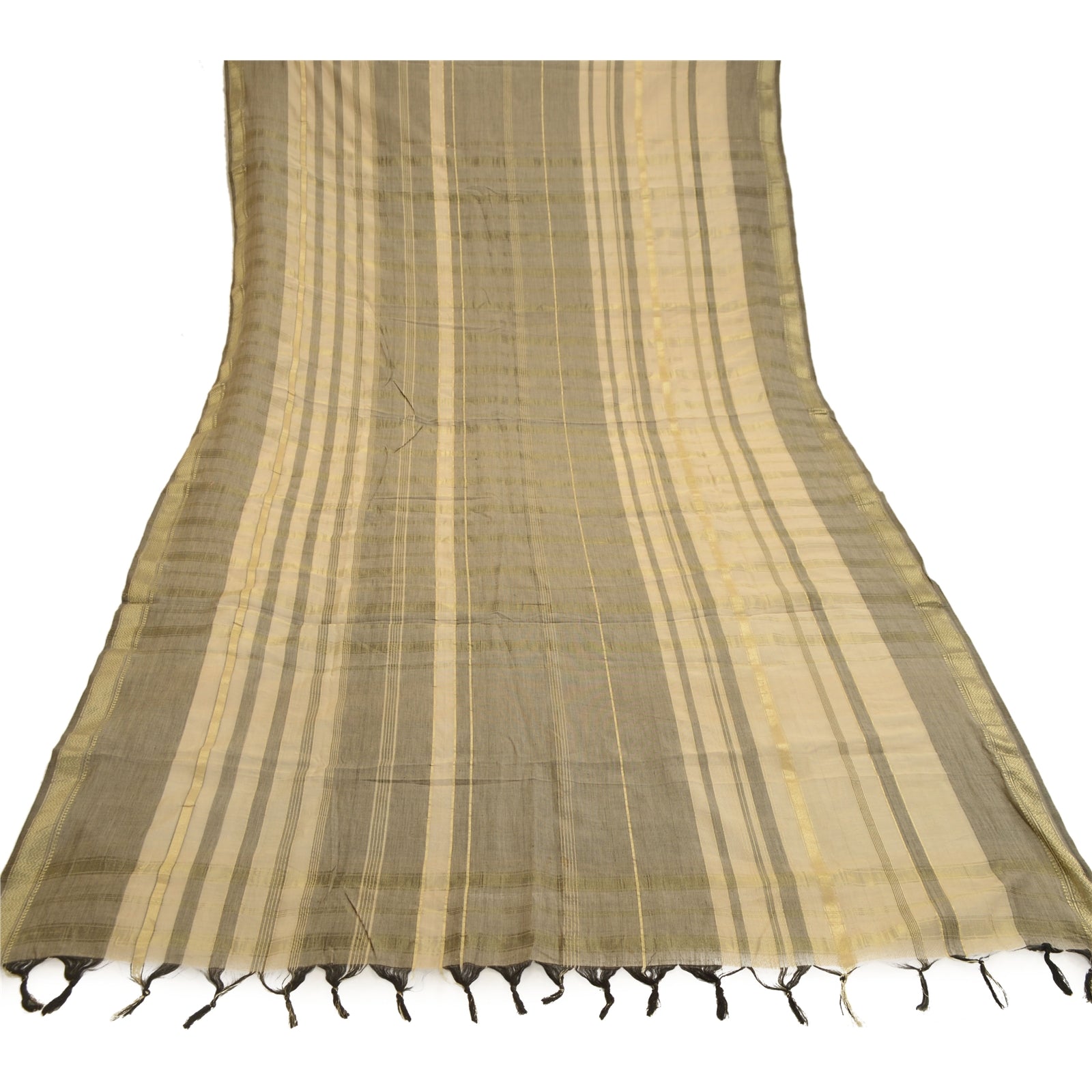 Beautiful Cream Colored 100% Pure Silk Woven Long Scarf/Dupatta. All over the dupatta has stripe and check design. It also has zari work in it. Width side of the dupatta has fringes attached in it. This dupatta/stole can be used for various crafting ideas too. Use it for dress designing, as a throw, as window dressing, upholstery, table linen and much more. Let your creative juices flow.