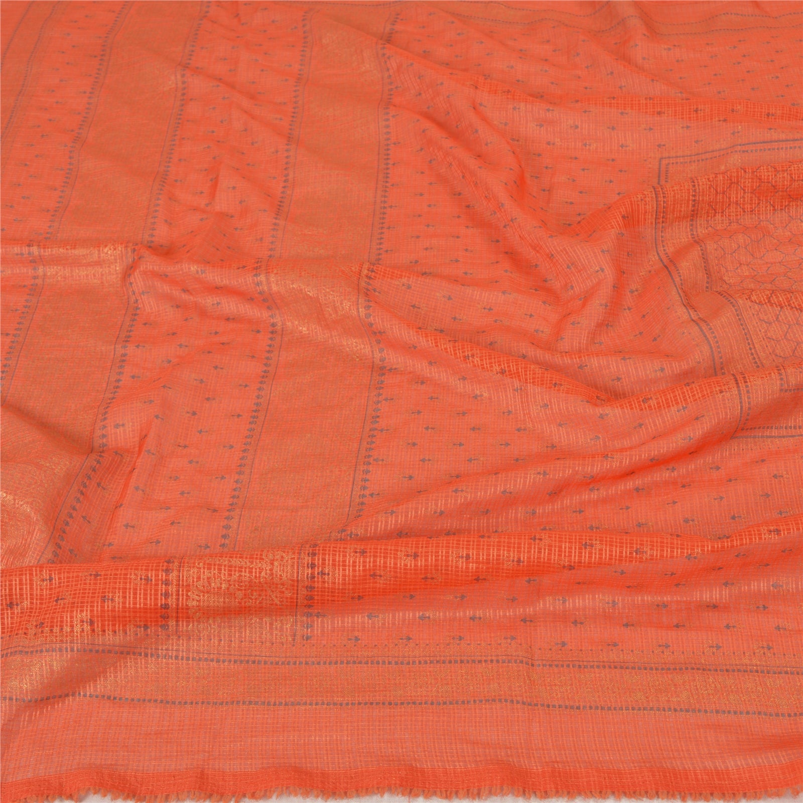 Beautiful shade of dark orange colored art silk printed Kota doria long scarf/dupatta. Center portion of the dupatta printed floral & paisley design. Border has golden/black printed floral pattern with soft base Sustainable Fabric is really enhancing beauty of the dupatta/stole. You can see all over dupatta has woven tiny square design. This dupatta/stole can be used for various crafting ideas too. Use it for dress designing, as a throw, as window dressing, upholstery, table linen and much more. Let your creative juices flow.