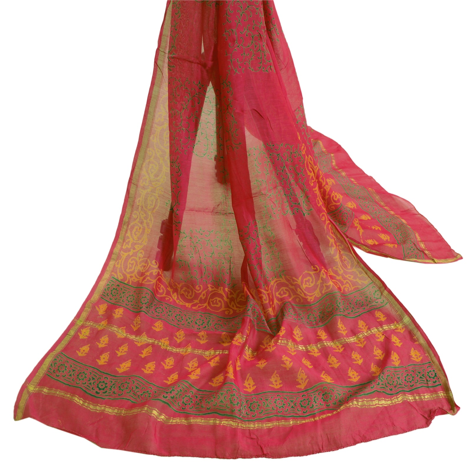 Beautiful shade of pink colored blend cotton printed long scarf/dupatta. Center portion of the dupatta printed floral design. Border has printed floral design with golden woven work is really enhancing beauty of the dupatta/stole. This dupatta/stole can be used for various crafting ideas too. Use it for dress designing, as a throw, as window dressing, upholstery, table linen and much more. Let your creative juices flow.