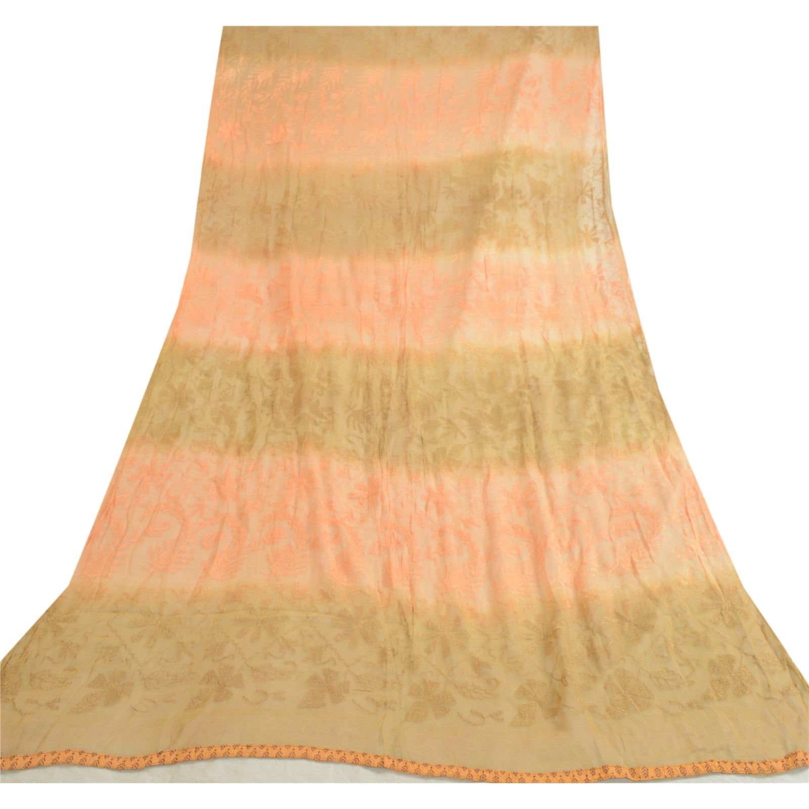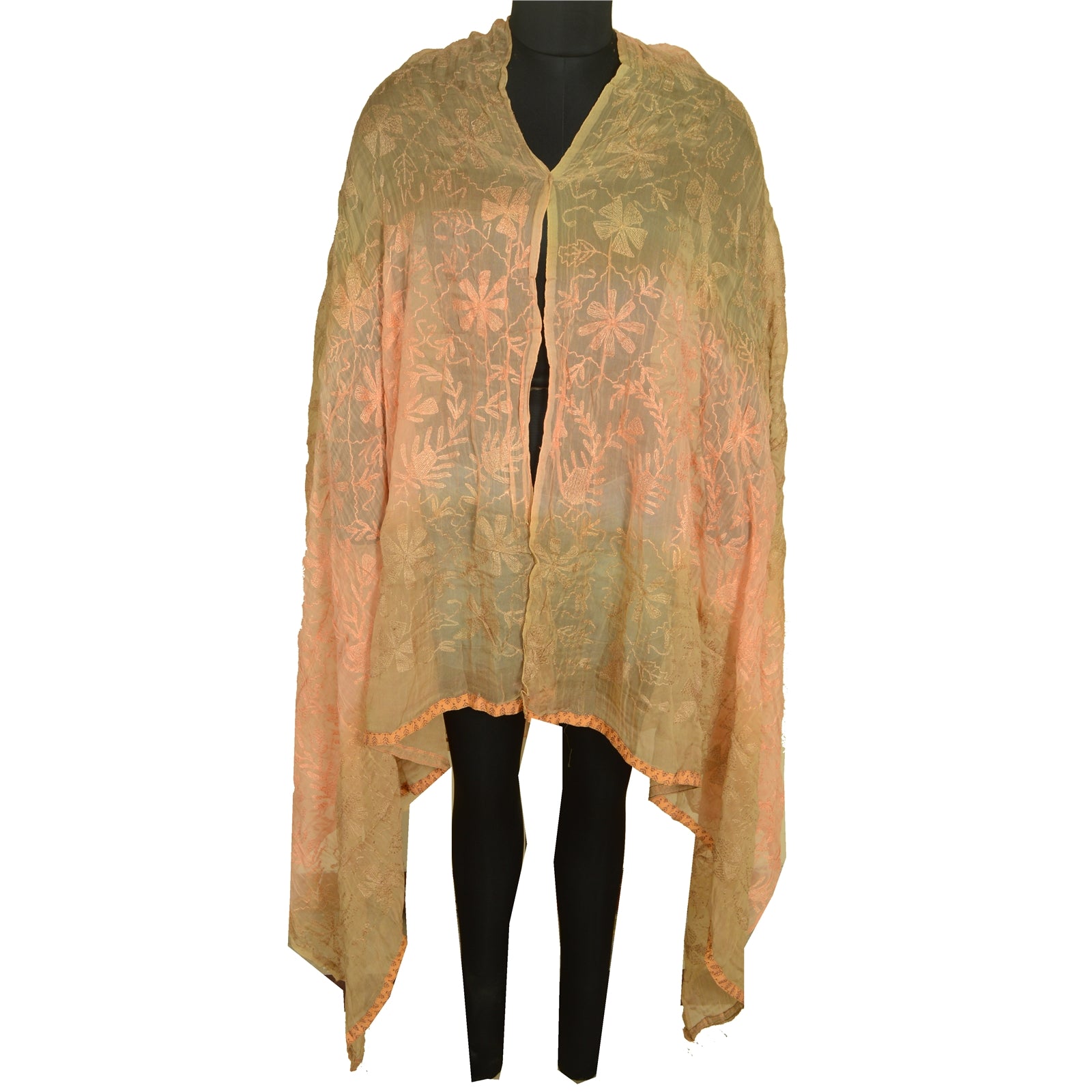 Sanskriti Vintage Dupatta Long Stole Blend Georgette Peach/Green Handmade Kantha