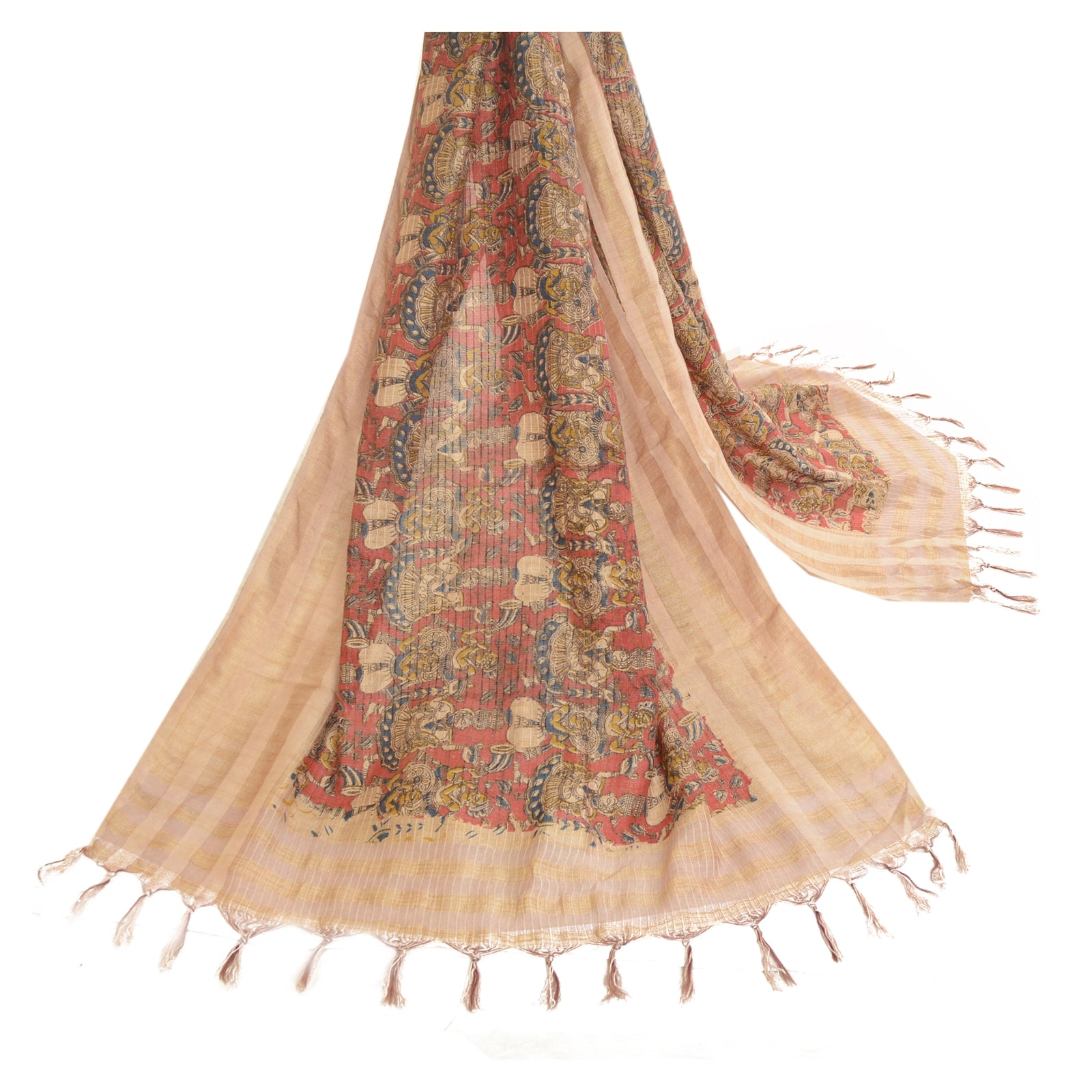 Elegant multi colored printed blend silk woven long scarf/dupatta. Center portion of the dupatta printed floral & human design. Border has woven work with matching fringes is really enhancing beauty of the dupatta/stole. This dupatta/stole can be used for various crafting ideas too. Use it for dress designing, as a throw, as window dressing, upholstery, table linen and much more. Let your creative juices flow.