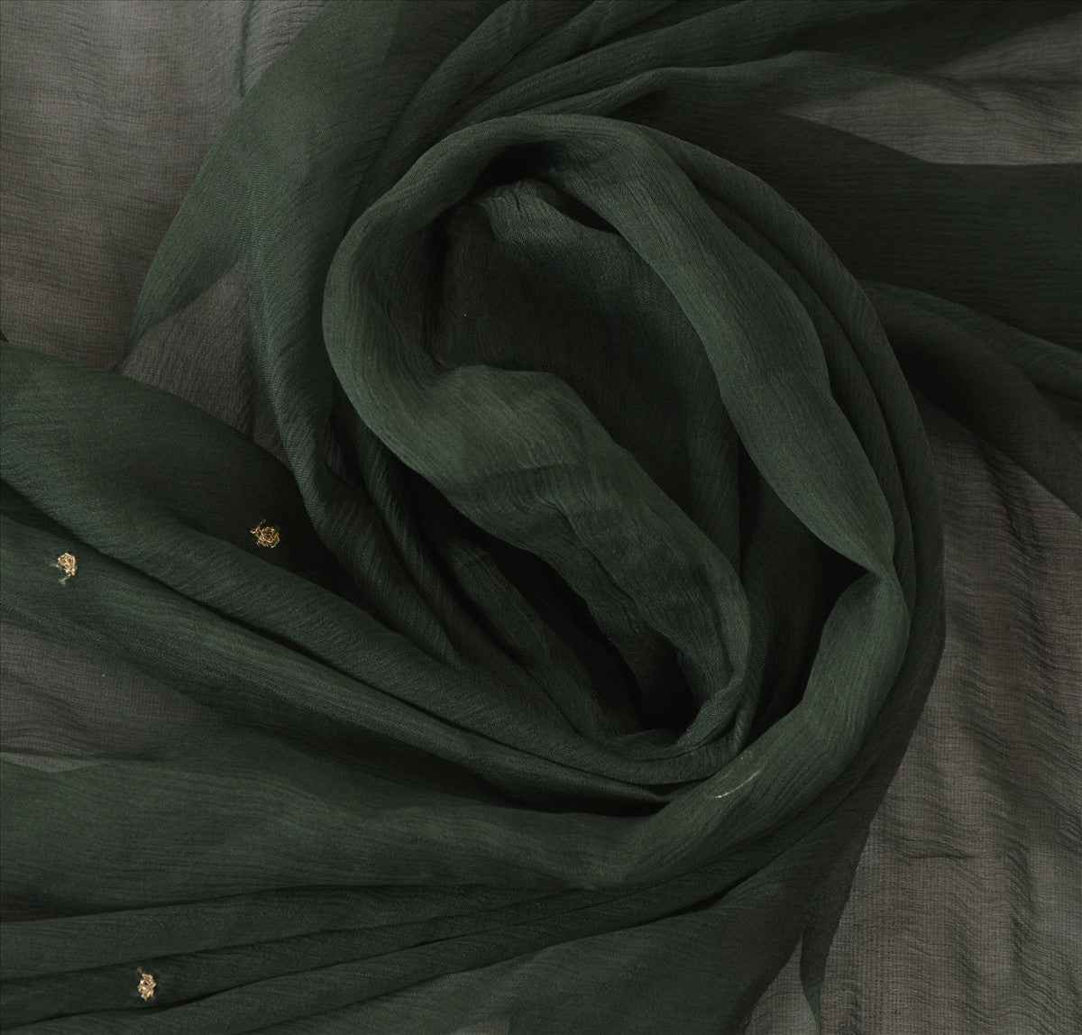 Beautiful green colored chiffon silk hand embroidered long scarf/dupatta. The center portion has floral design embroidered with zari work . Border of the dupatta has floral design embroidered with maroon thread work and embellished with gold zari/zardozi/dabka work, gold sequins, yellow glass beads, gold dori work . This item's Beauty Factor Antique both ends with gold zardozi work on green color base Sustainable Fabric is really enhancing the beauty of the dupatta.
