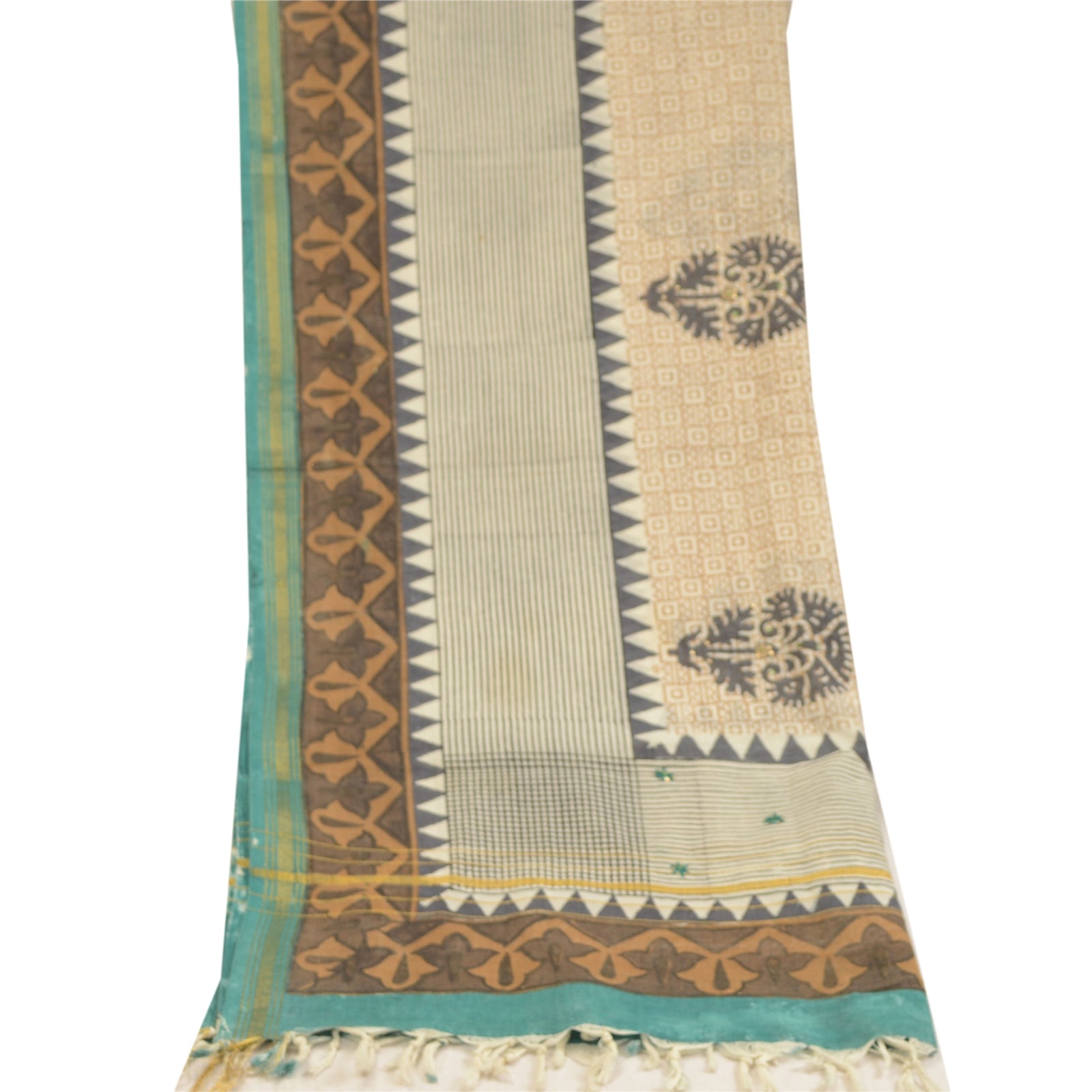 Beautiful Cream Colored Cotton Printed Long Scarf/Dupatta. Center portion of the dupatta has printed floral & geometric design. Border has floral design and zari woven work is really enhancing beauty of the dupatta/stole. It also has fringes in whit and green color on the width side. This dupatta/stole can be used for various crafting ideas too. Use it for dress designing, as a throw, as window dressing, upholstery, table linen and much more. Let your creative juices flow.