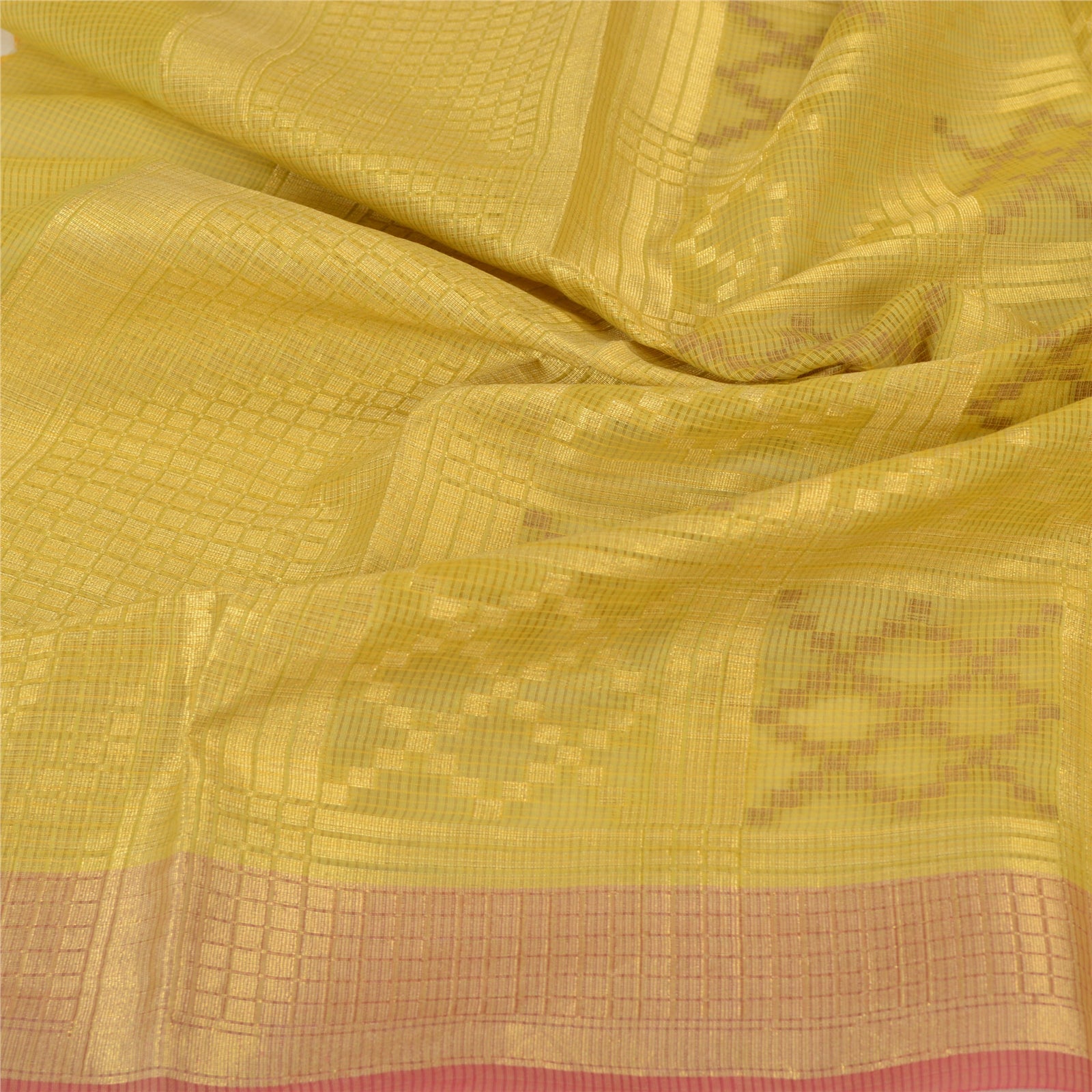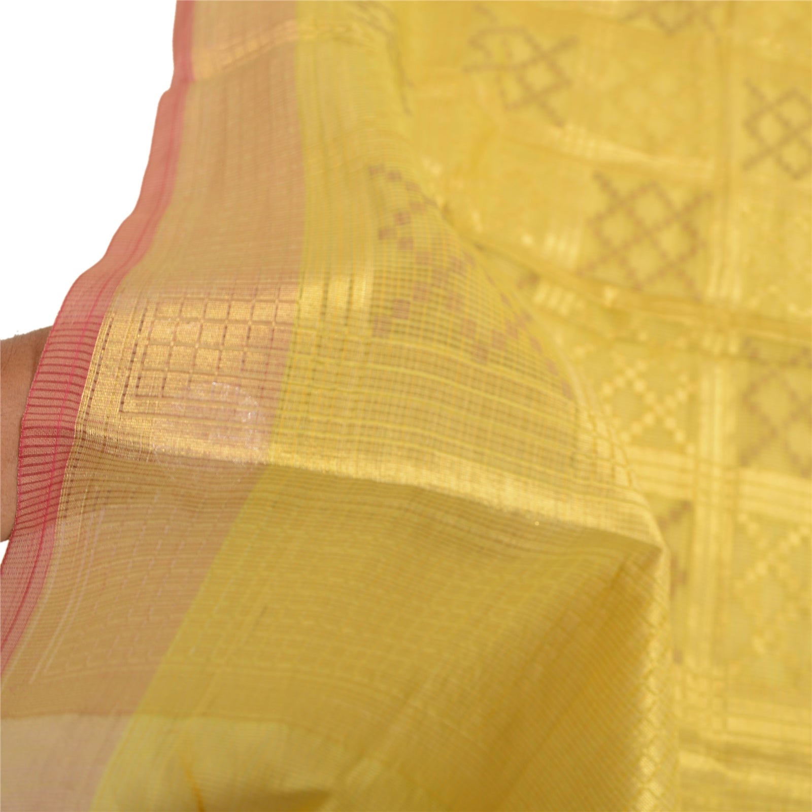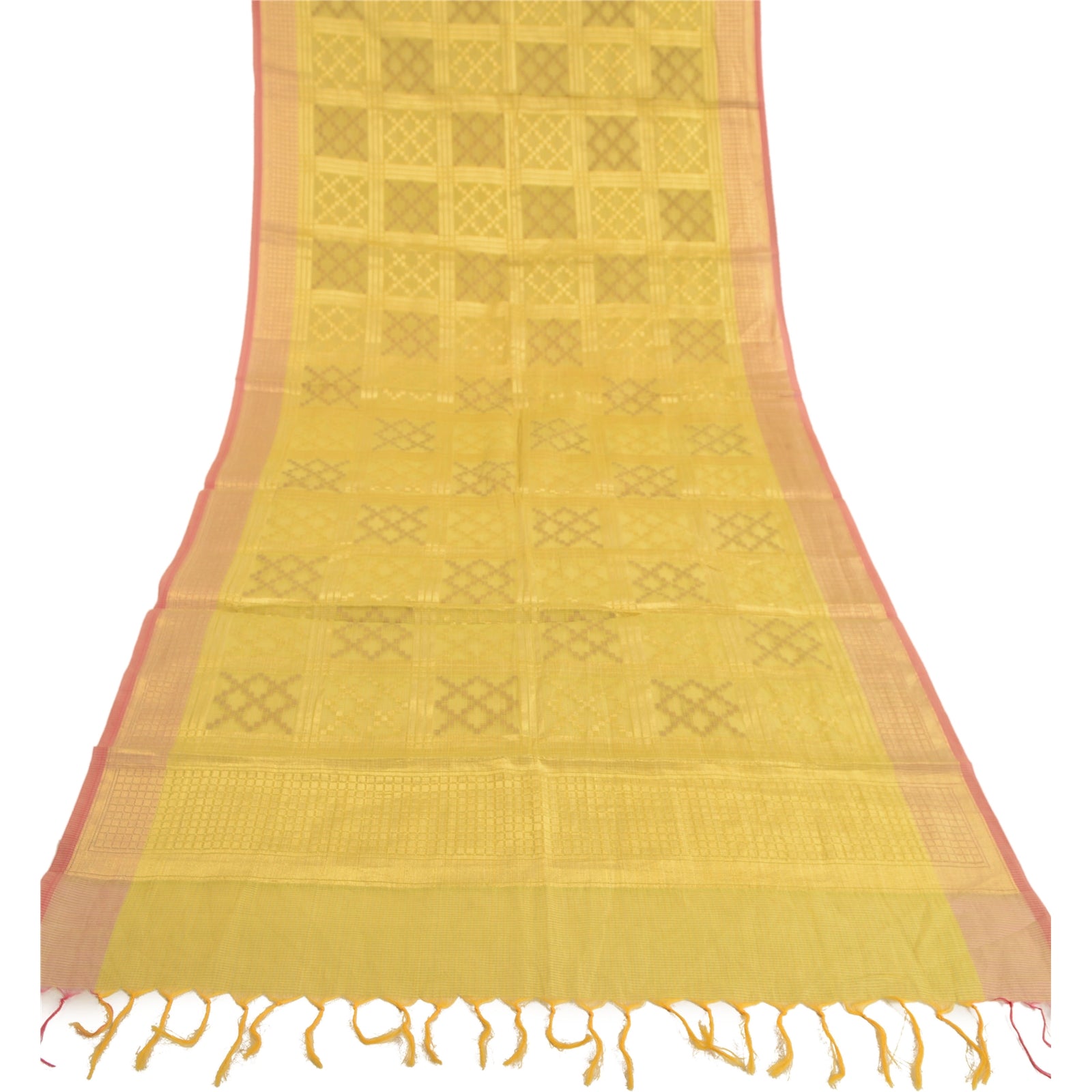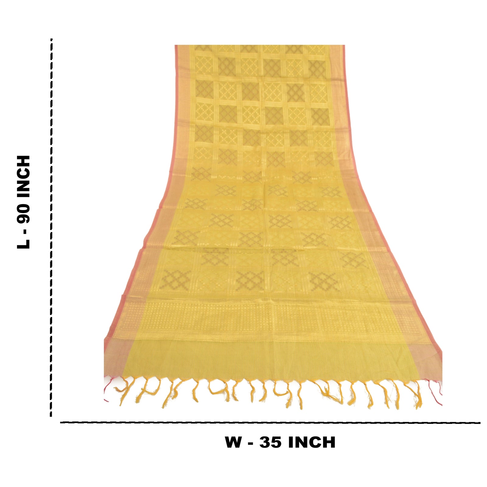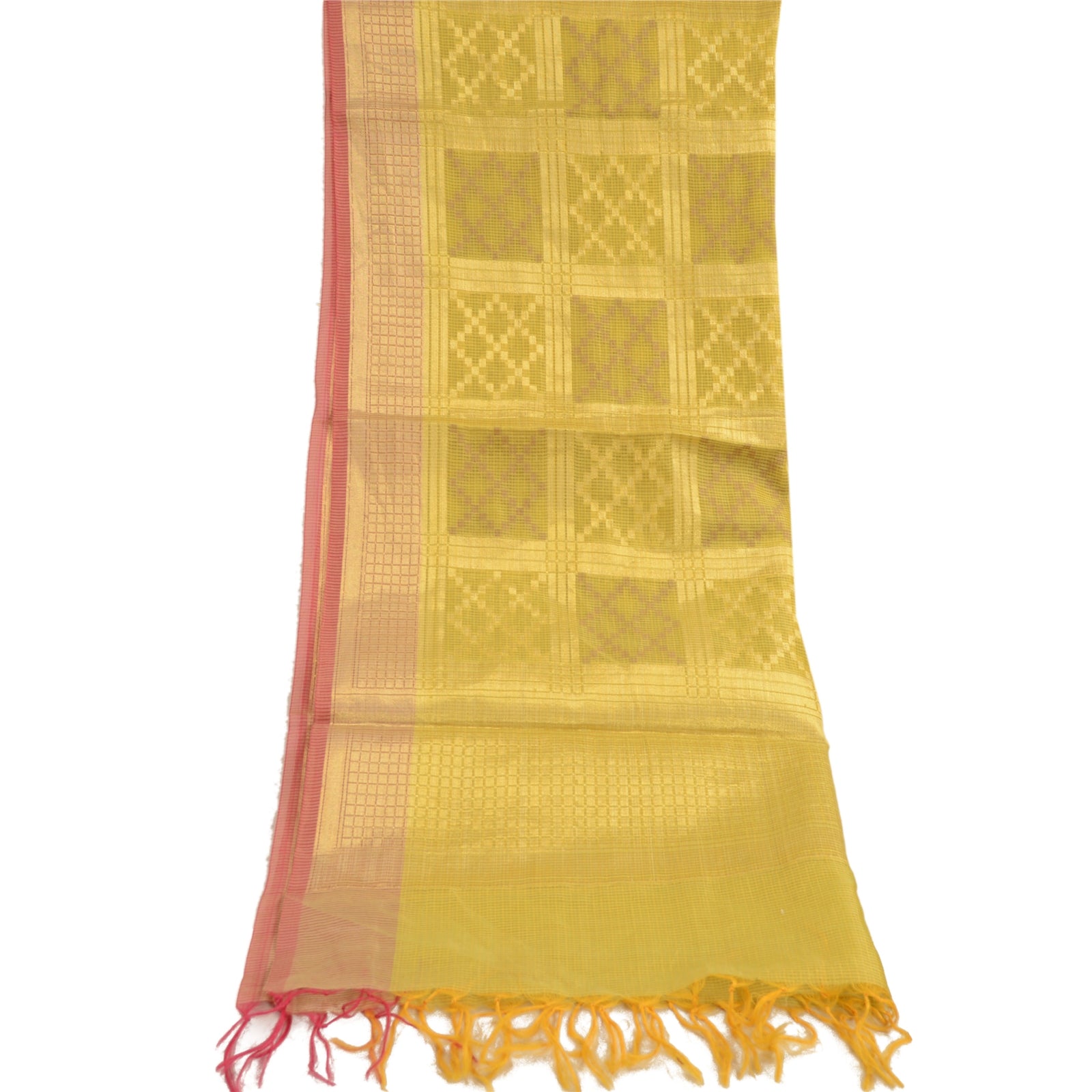 Beautiful shade of green colored cotton woven Kota long scarf/dupatta. Center portion of the dupatta woven geometric pattern. Border has golden zari & thread woven work with geometric pattern is really enhancing beauty of the dupatta/stole. Dupatta has matching fringes on both ends of borders. This dupatta/stole can be used for various crafting ideas too. Use it for dress designing, as a throw, as window dressing, upholstery, table linen and much more. Let your creative juices flow.
