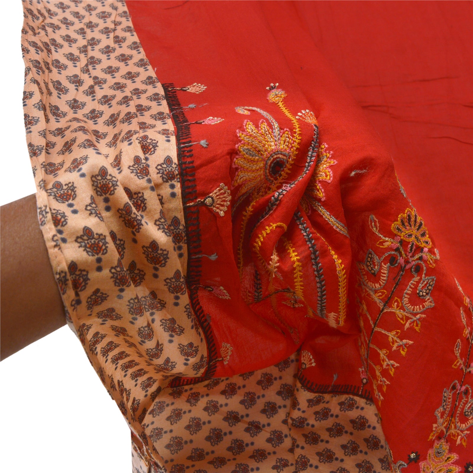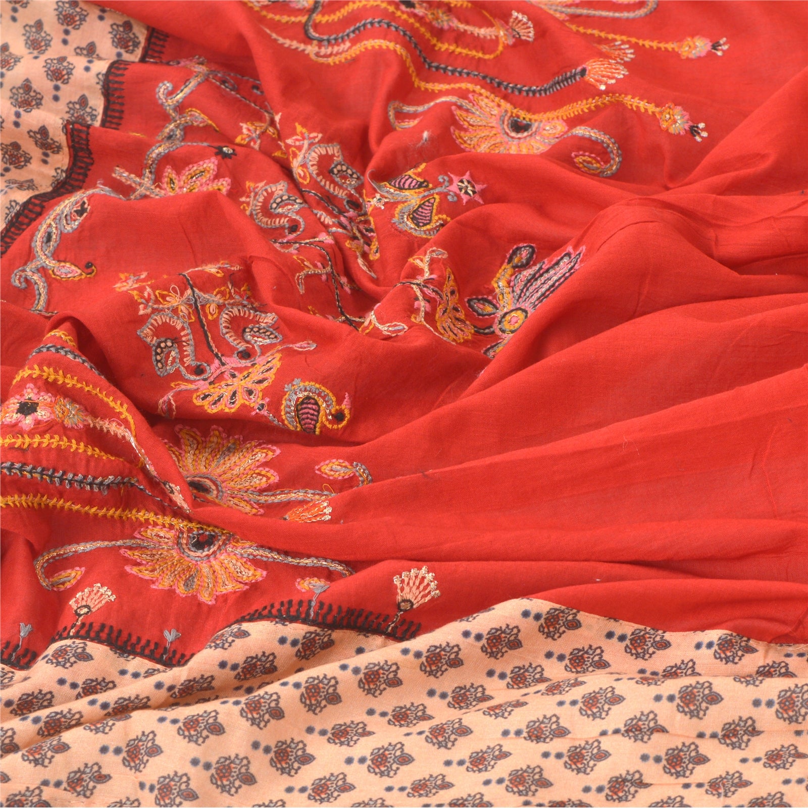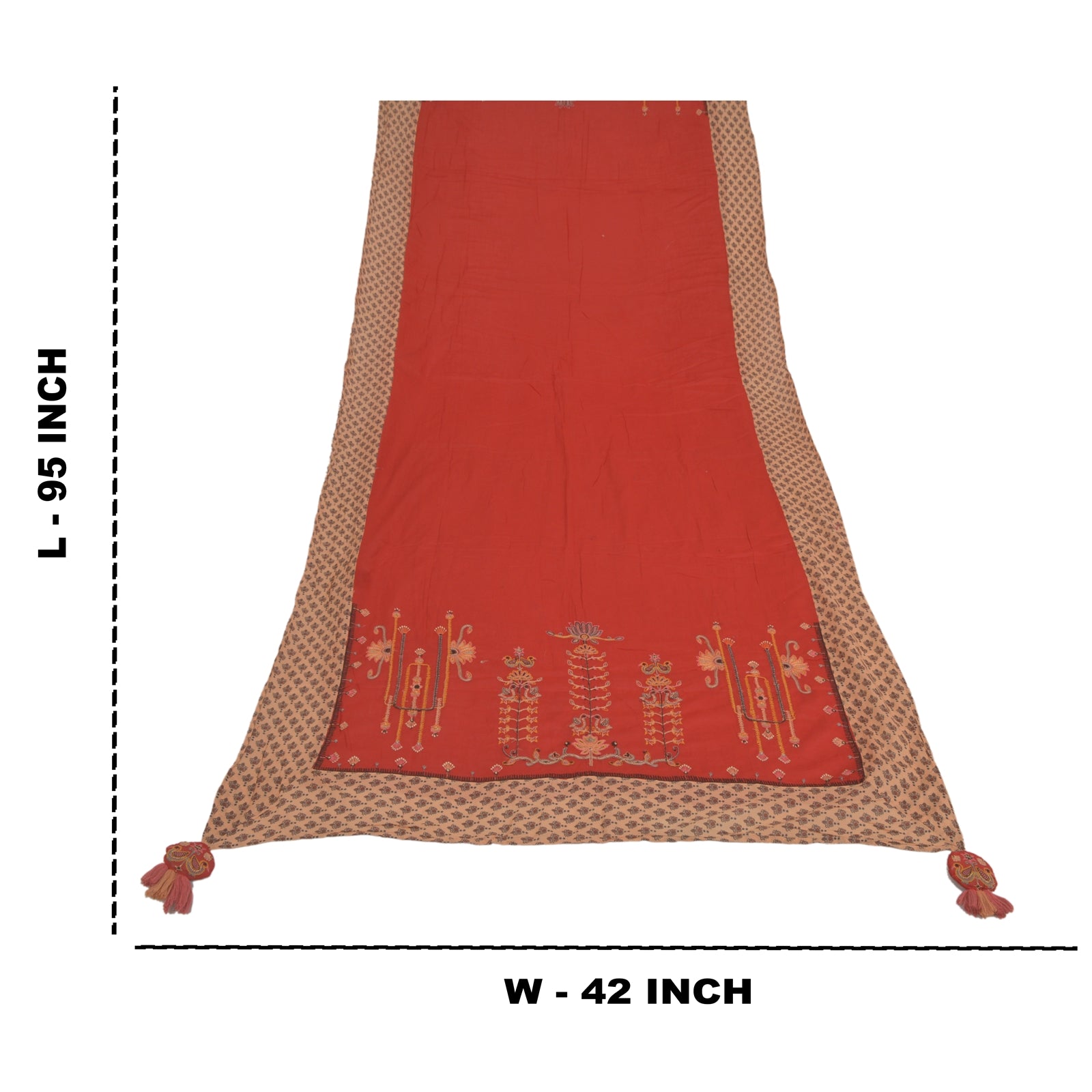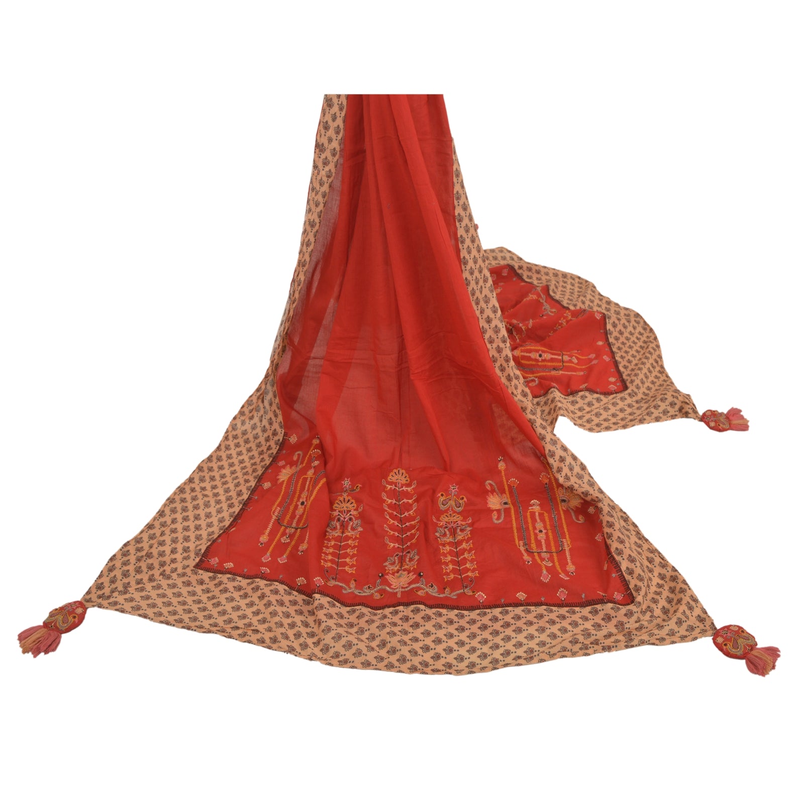 Beautiful Red & Peach Colored 100% Pure Cotton Embroidered Long Scarf/Dupatta. Central part of dupatta has floral design with thread work. Border has printed floral design embroidered with multi color thread work. You can see pink tassels on edges. A truly awesome dupatta.!!!!