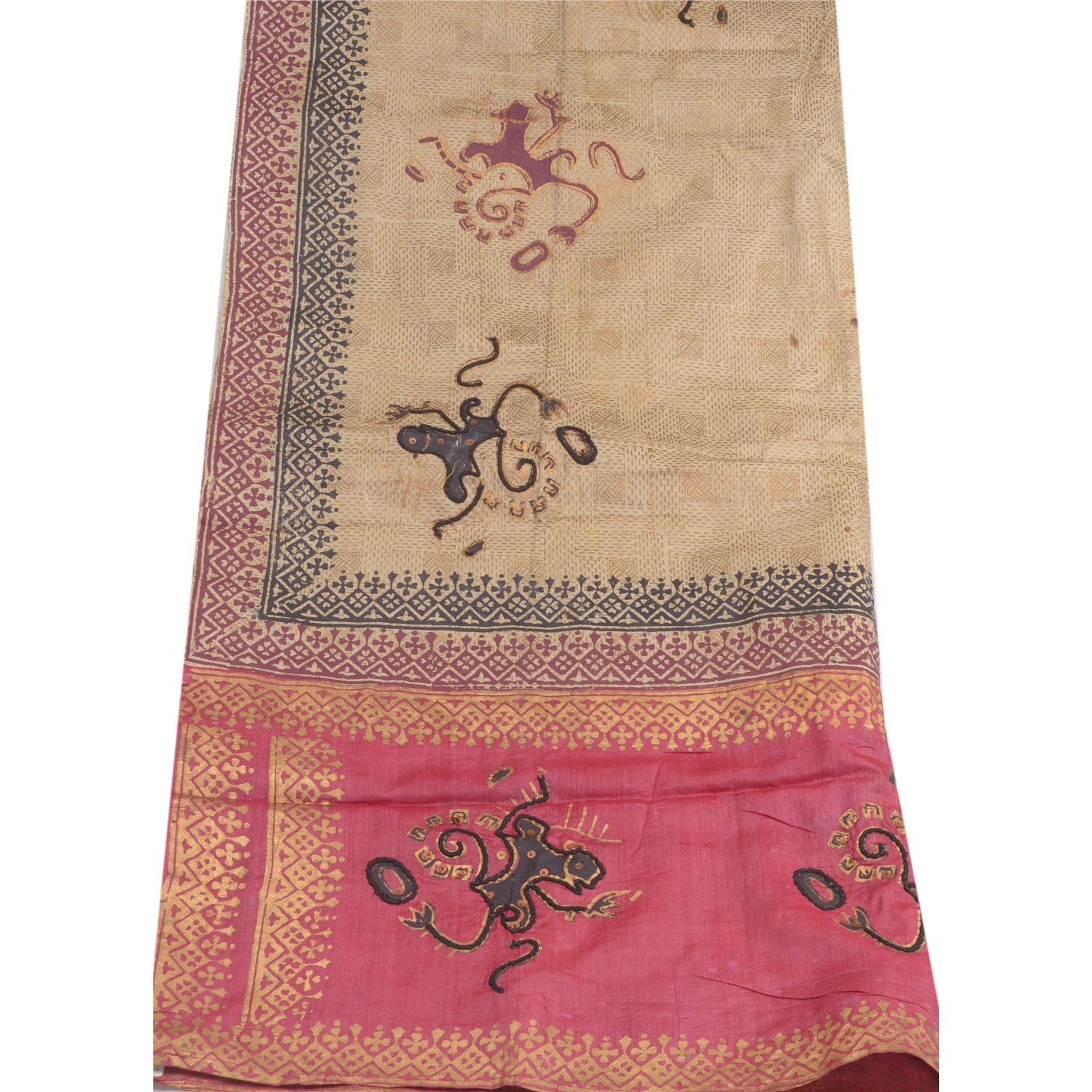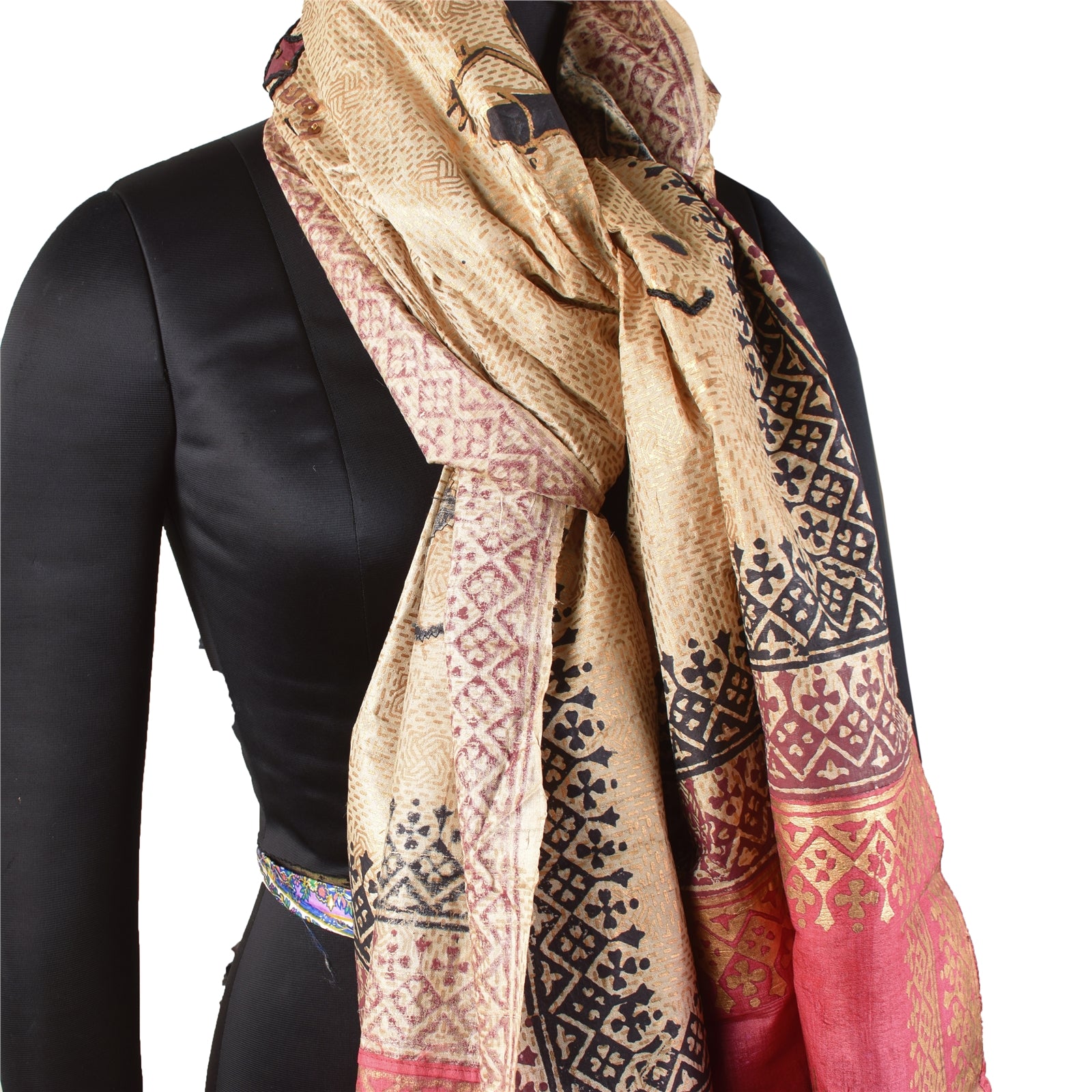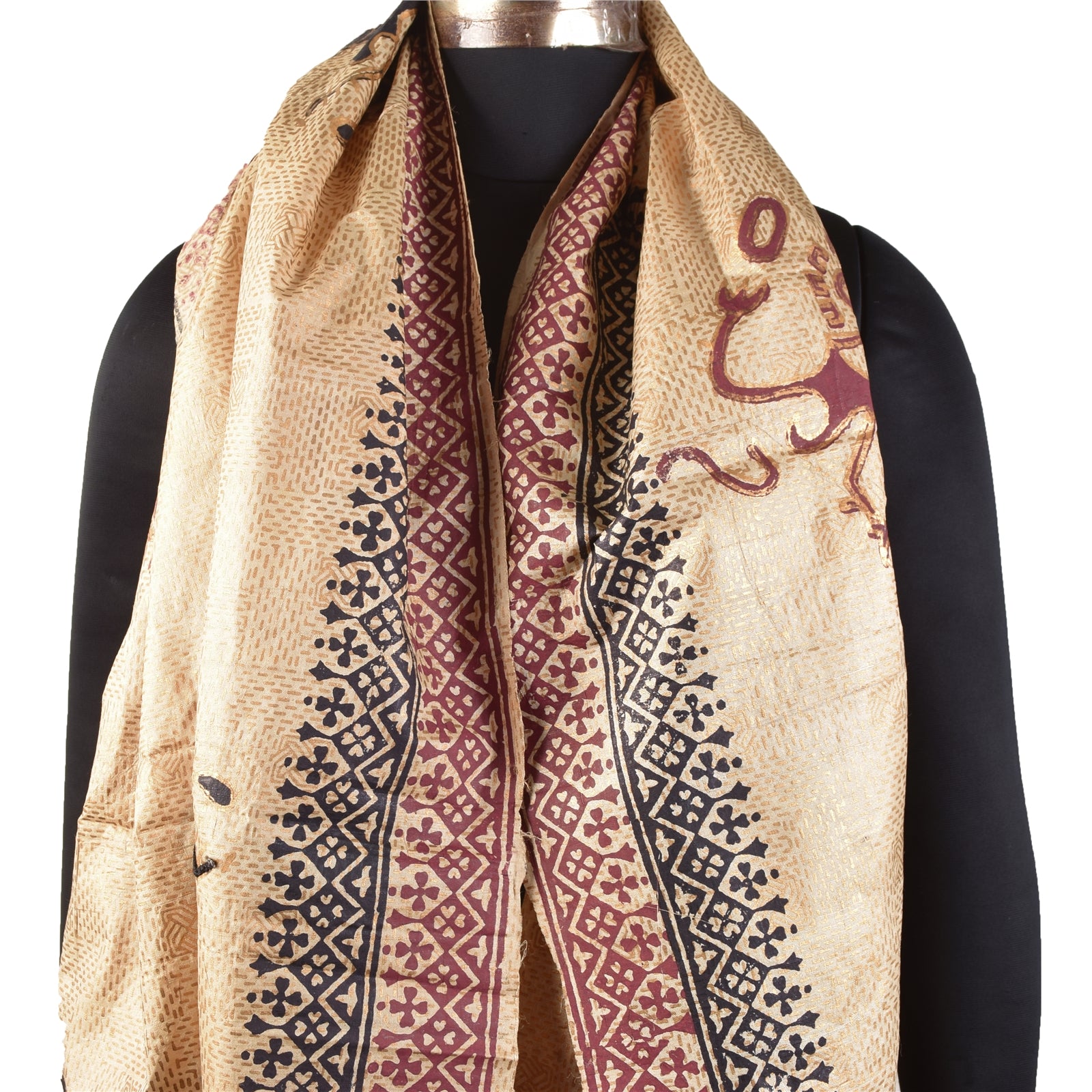 Sanskriti Vintage Dupatta Long Stole Pure Silk Cream Beaded, Hand-Block Printed