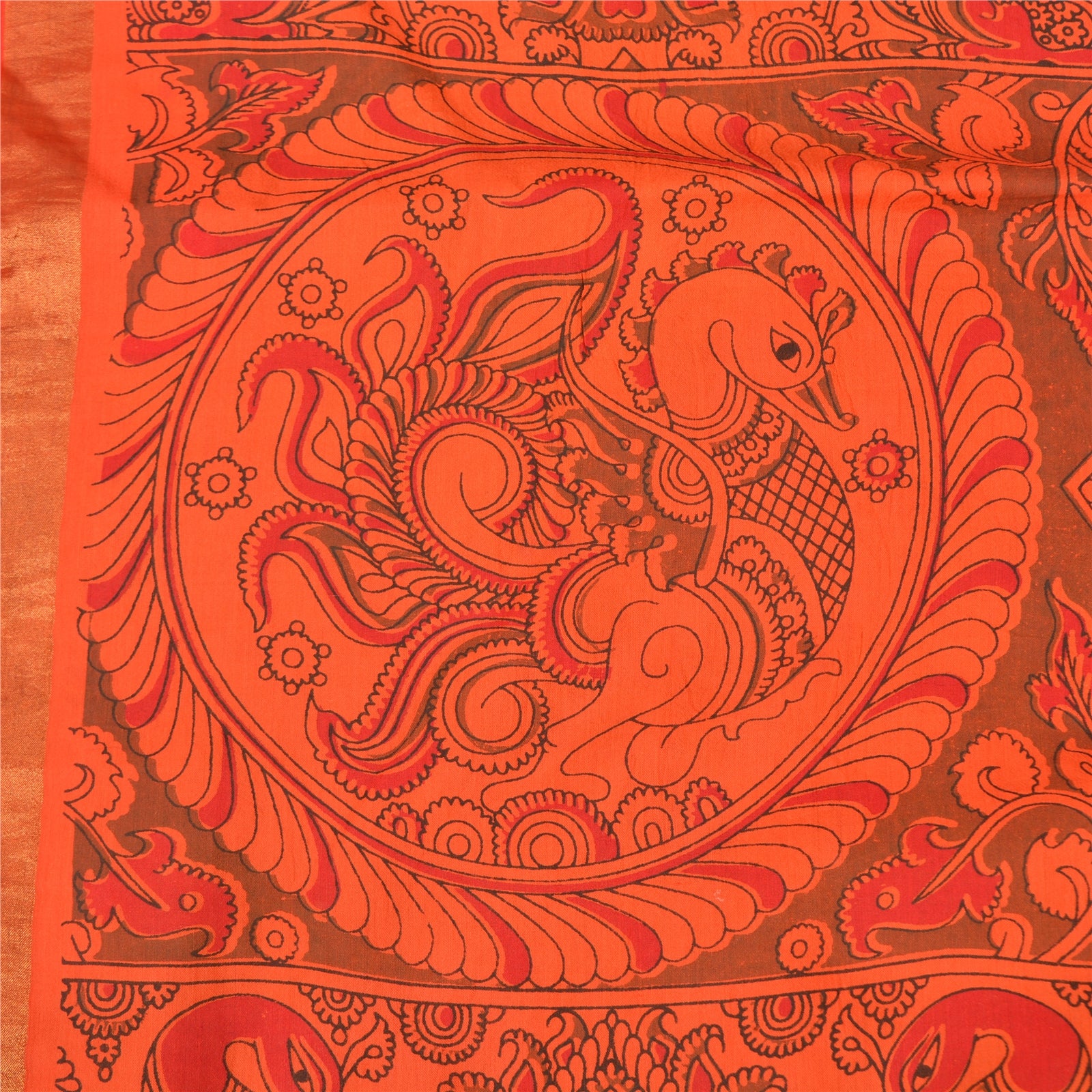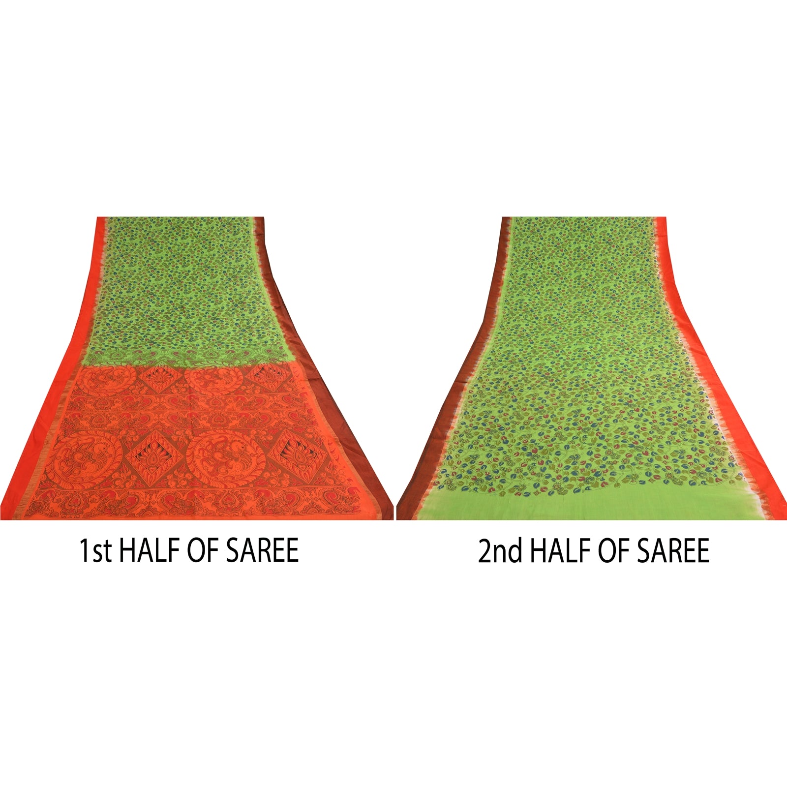 Sanskriti Vintage Green/Orange Sarees Pure Cotton Handmade Kalamkari Sari Sustainable Fabric